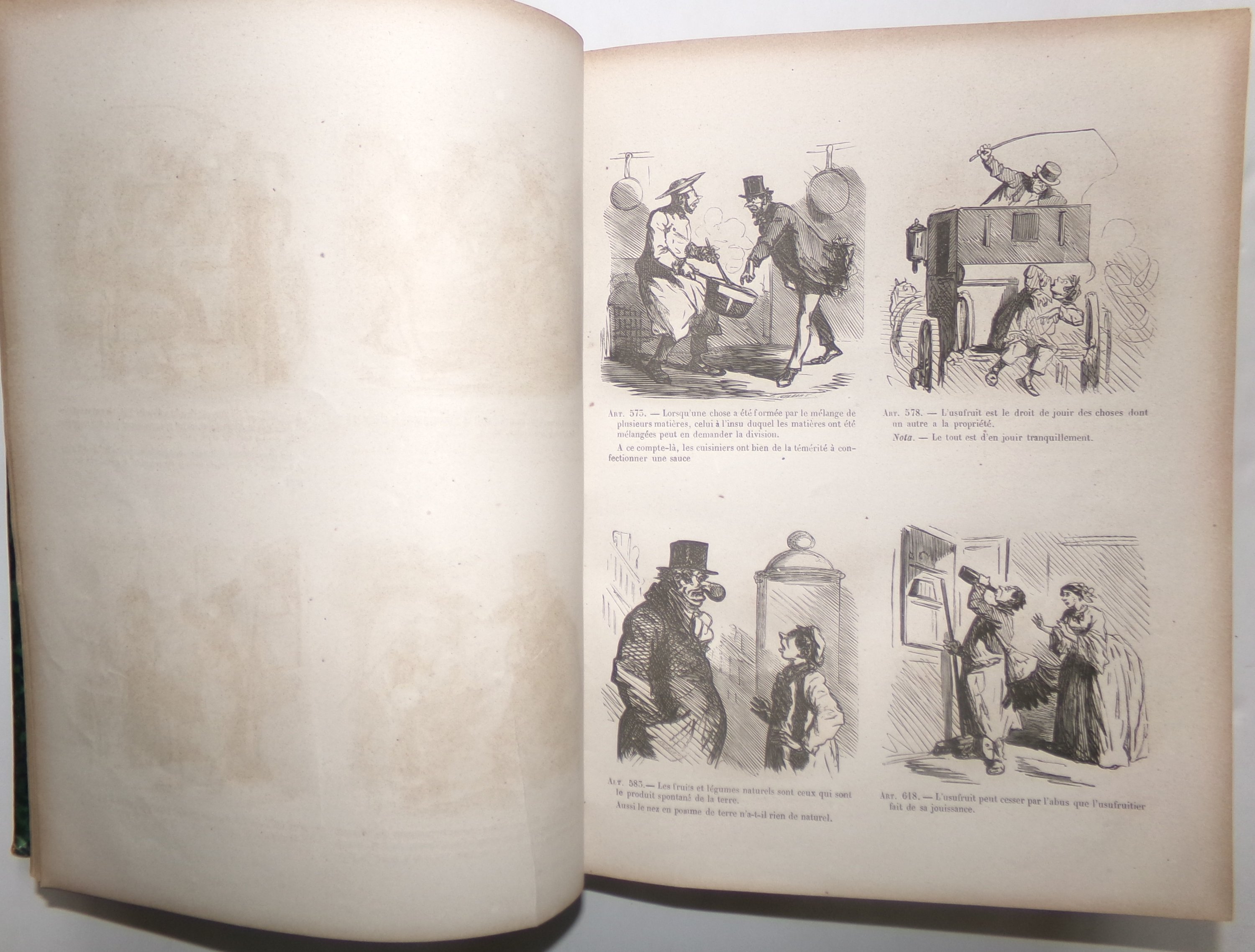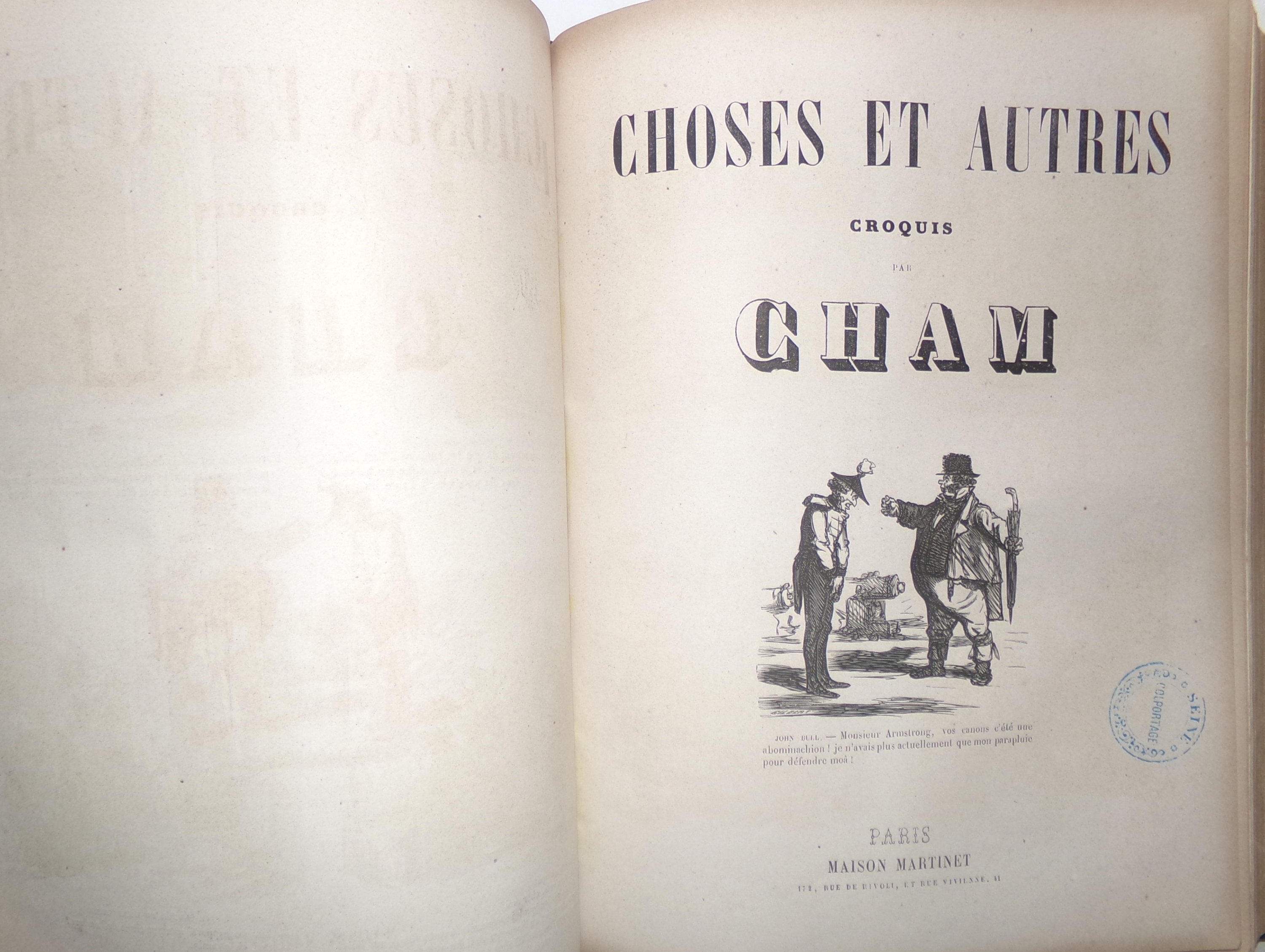 Recueil factice de 15 fascicules imprimés de caricatures en majorité croqués par Cham (14 fasc.) et par Baric (1 fasc.) en 1 vol. rel. ½ basane in-8: Le code civil commenté par Cham, ouvrage destiné aux personnes qui désirent avoir des démêlés avec la justice (3 parties) ; L’exposition de Londres (2 parties) ; Choses et autres ; Cours de physique ; Au bal de l’Opéra ; La bourse illustrée ; Les jours gras ; Baigneurs et buveurs d’eau ; Pendant la canicule ; Spahis et turcos ; Promenades au jardin d’acclimatation ; Voilà ce qui vient de paraître, revue comique de l’année par Baric. Tampon bleu de colportage de la Seine sur chaque couv., publiés à Paris par la maison Martinet et Arnauld de Vresse, vers 1861-1863 ;
