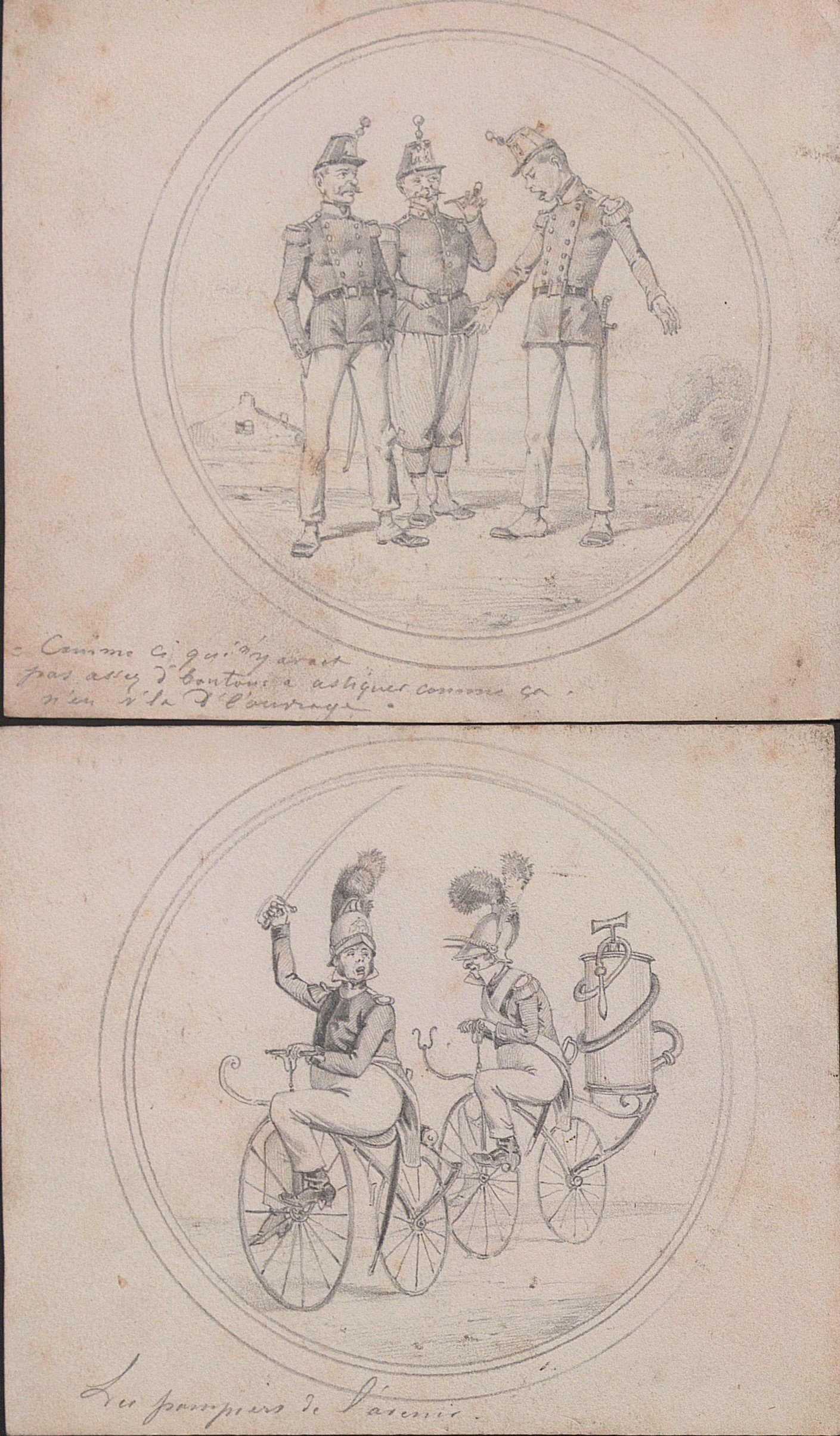 Réunion de 12 scènes humoristiques, mine de plomb, toutes légendées, sur le thème de l’armée et des sapeurs-pompiers, env. 12 x 16 cm.
