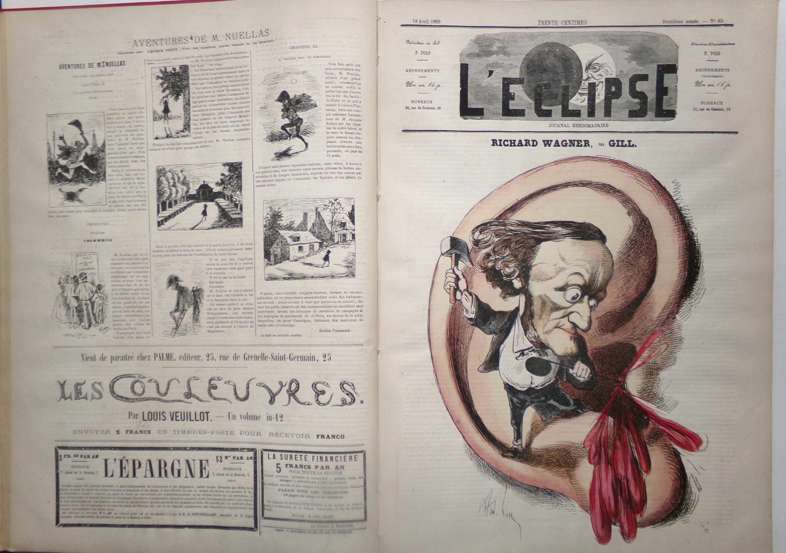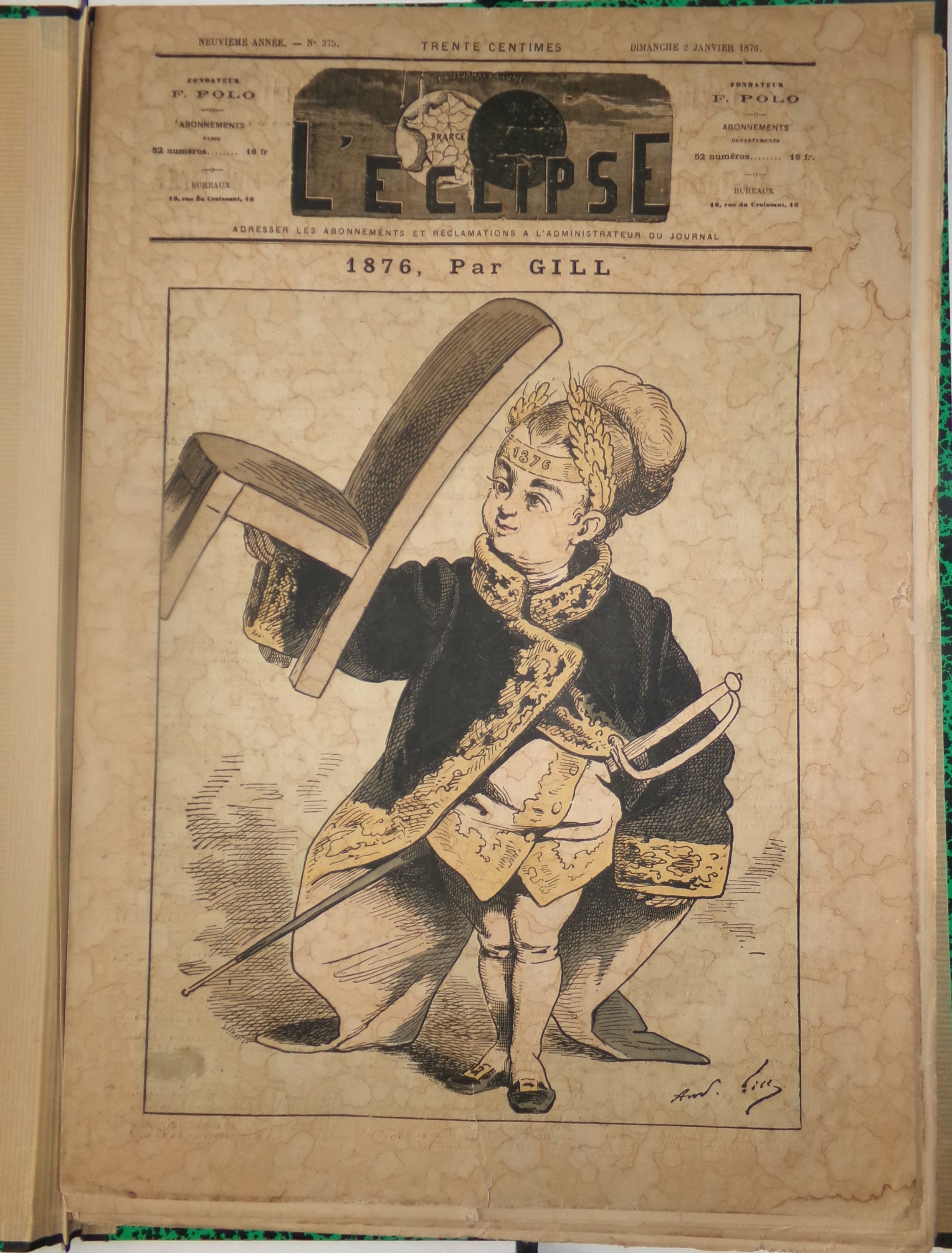 Dirigée par François Polo, « L’Eclipse » forme la continuation de « La Lune », interdit par la censure en décembre 1867. La boutade « La Lune devra subir une éclipse » détermine le nom du successeur de « La Lune »: « L’Eclipse ». Le premier numéro paraît le 26 janvier 1868. Illustré essentiellement par André Gill, « L’Eclipse » connut de nombreuses censures et interdictions de publication: du 4 octobre 1868 au 14 août 1870, l’administration n’interdit pas moins de 22 numéros de l’Eclipse. Cette censure réagissait souvent au dernier moment, si bien qu’il fallait composer une nouvelle caricature dans la hâte. Les exemplaires recomposés portent en général le numéro du fascicule suivi de la lettre « b » pour bis. Les caricatures touchaient aussi bien des personnages de la vie politique que ceux de la vie artistique et littéraire. En 1876, deux ans après la mort de François Polo, la vente du journal s’essoufflant, il fut décidé d’en réduire le format. Gill n’y trouvant pas son compte et rêvant de grandes compositions, commença une nouvelle aventure avec « La Lune rousse » dont le premier numéro parut le 10 décembre 1876.