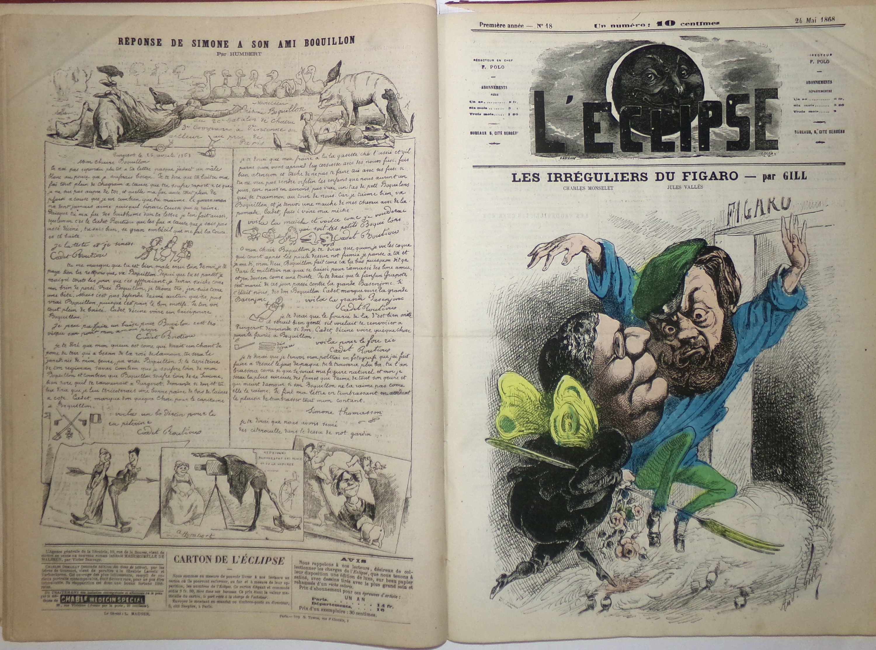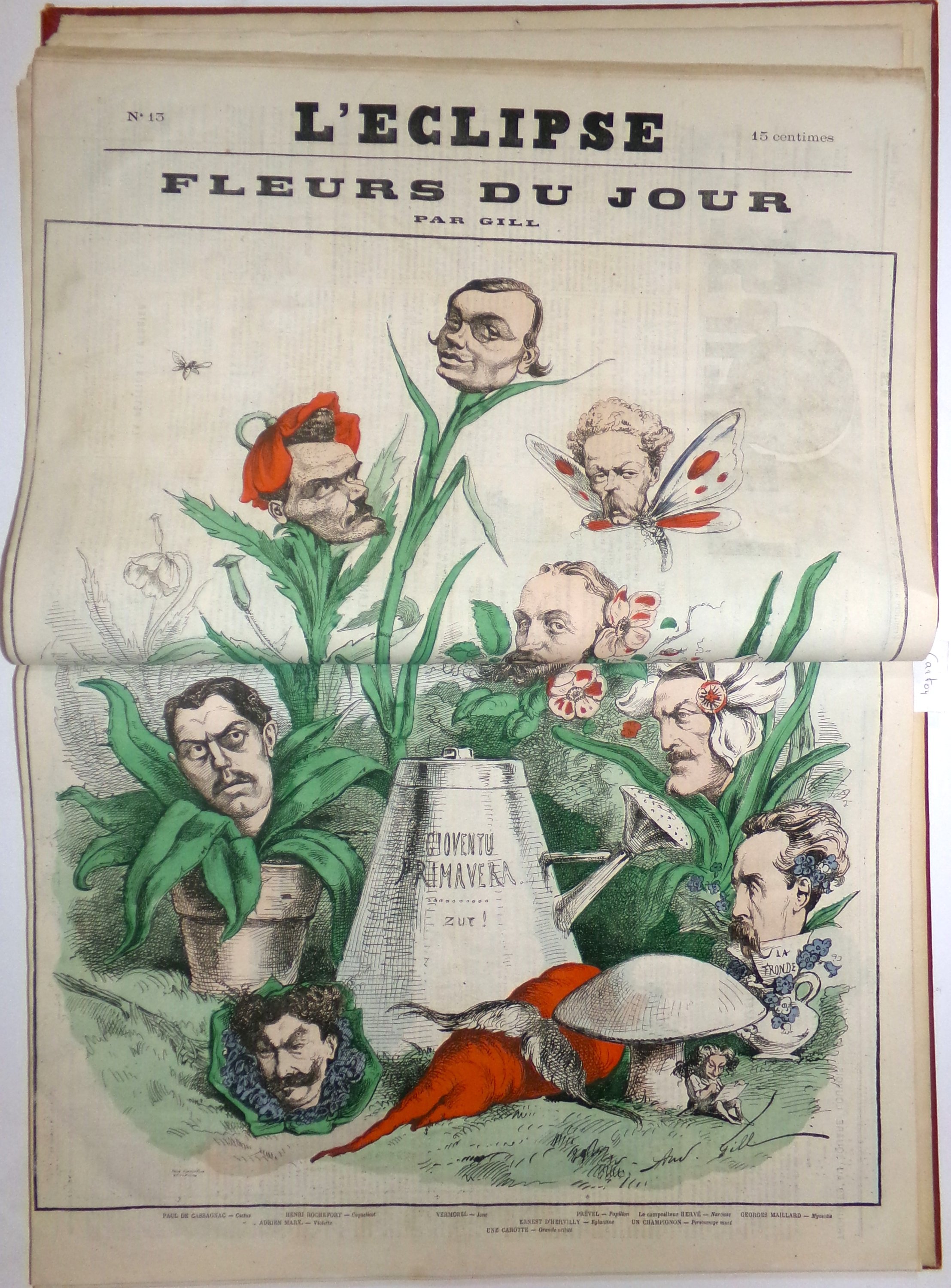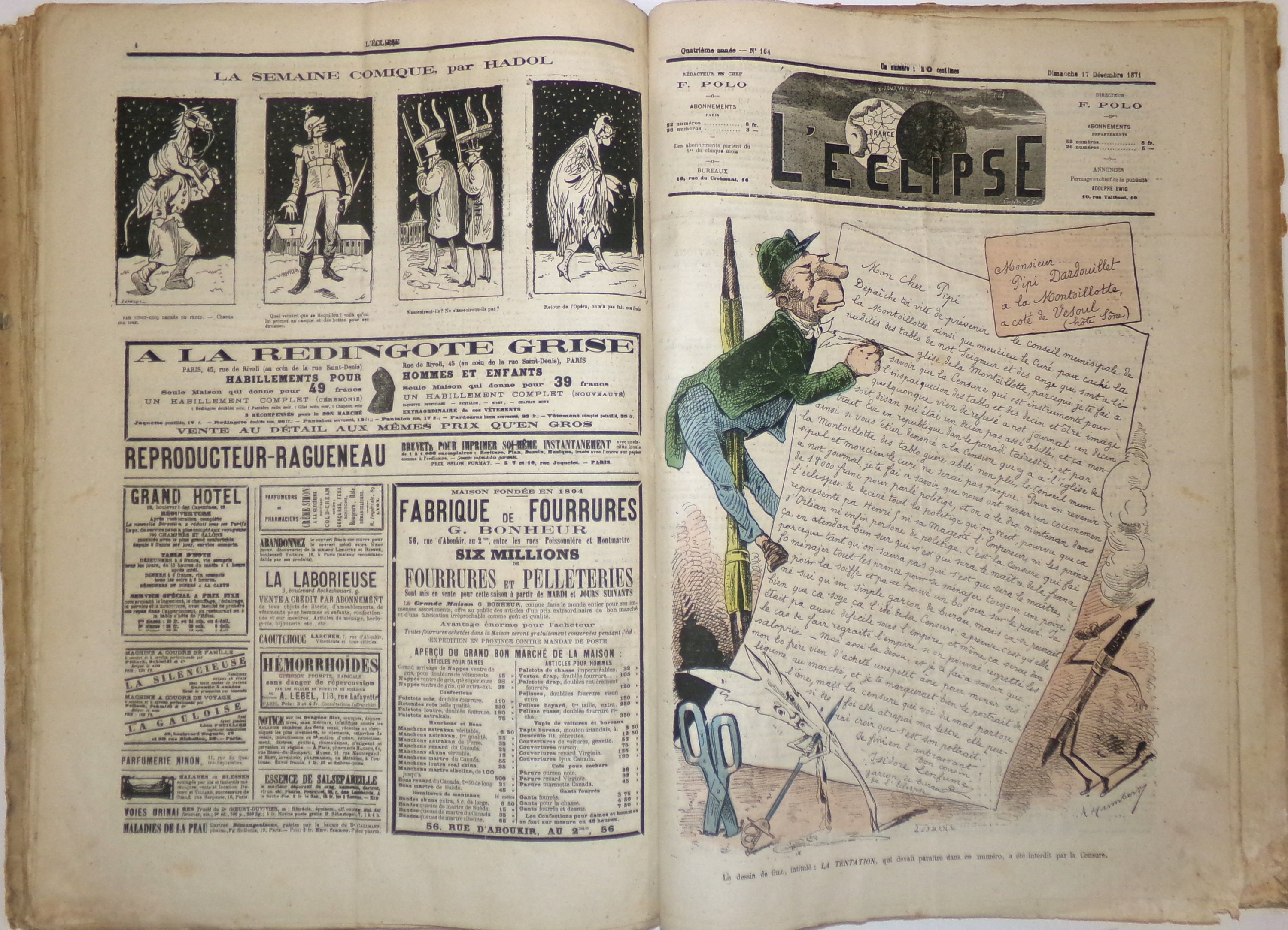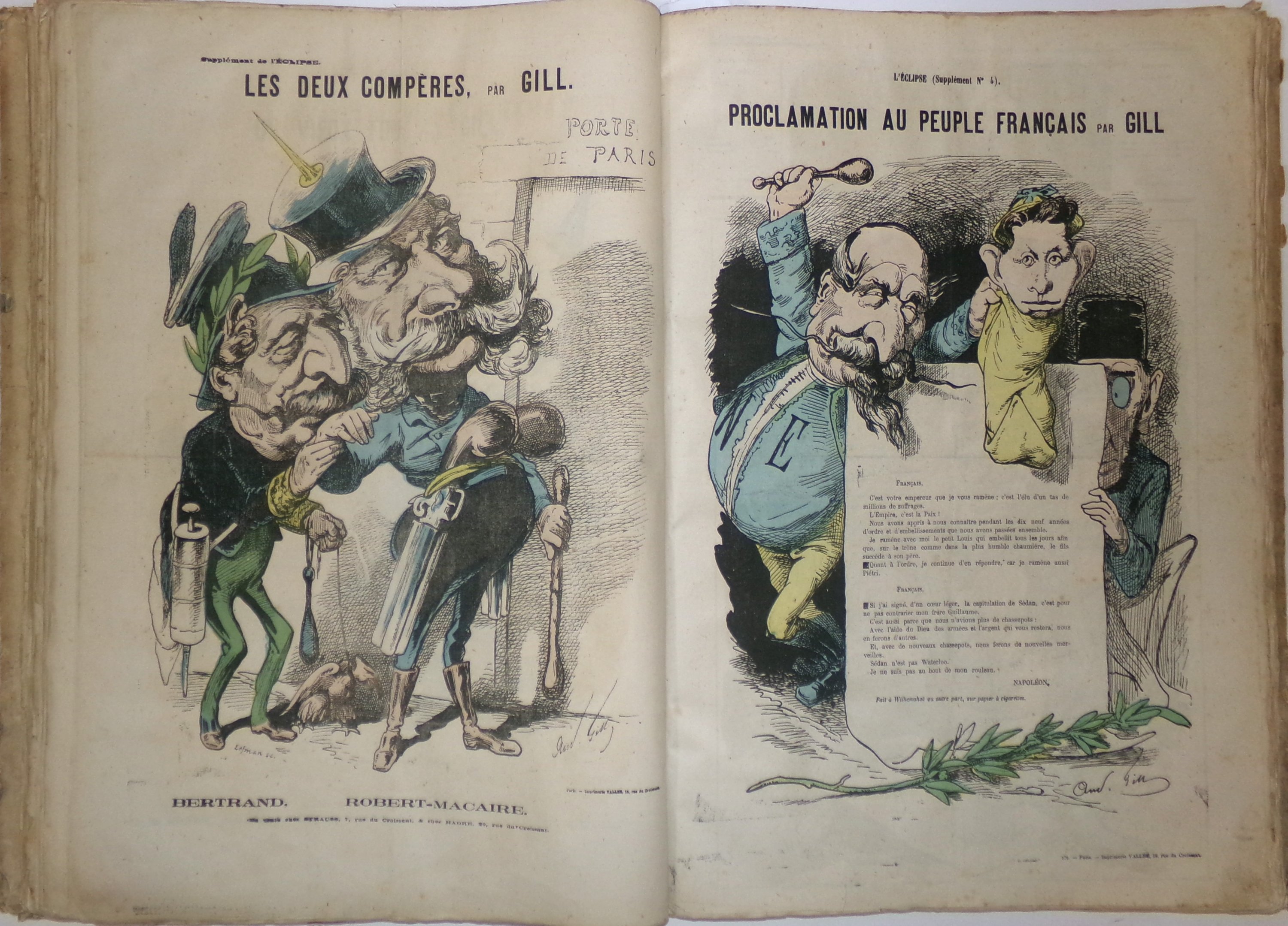 (1 vol.): n°102 (2 janvier 1870) au n° 139 (18 septembre 1870) suivi des suppl. n°1 à 5 (du 18 septembre 1870 à juin 1871, l’Eclipse ne parut pas, mais elle publia durant ces neuf mois d’interruption, 5 feuilles supplémentaires) ; du n°140 (juin 1871) au n°166 (31 décembre 1871) y compris suppl. du n°119, n°103bis, 105bis, 106bis, 114bis, 116bis, 128bis, 129bis, 132bis, 133bis, 134bis, 149bis, 151bis, 156bis, 158bis, 160bis et 164bis. Couv. et pages de titre de l’éditeur. T.B.E. (légères rousseurs, qqs déchirures et petits mques en marge).