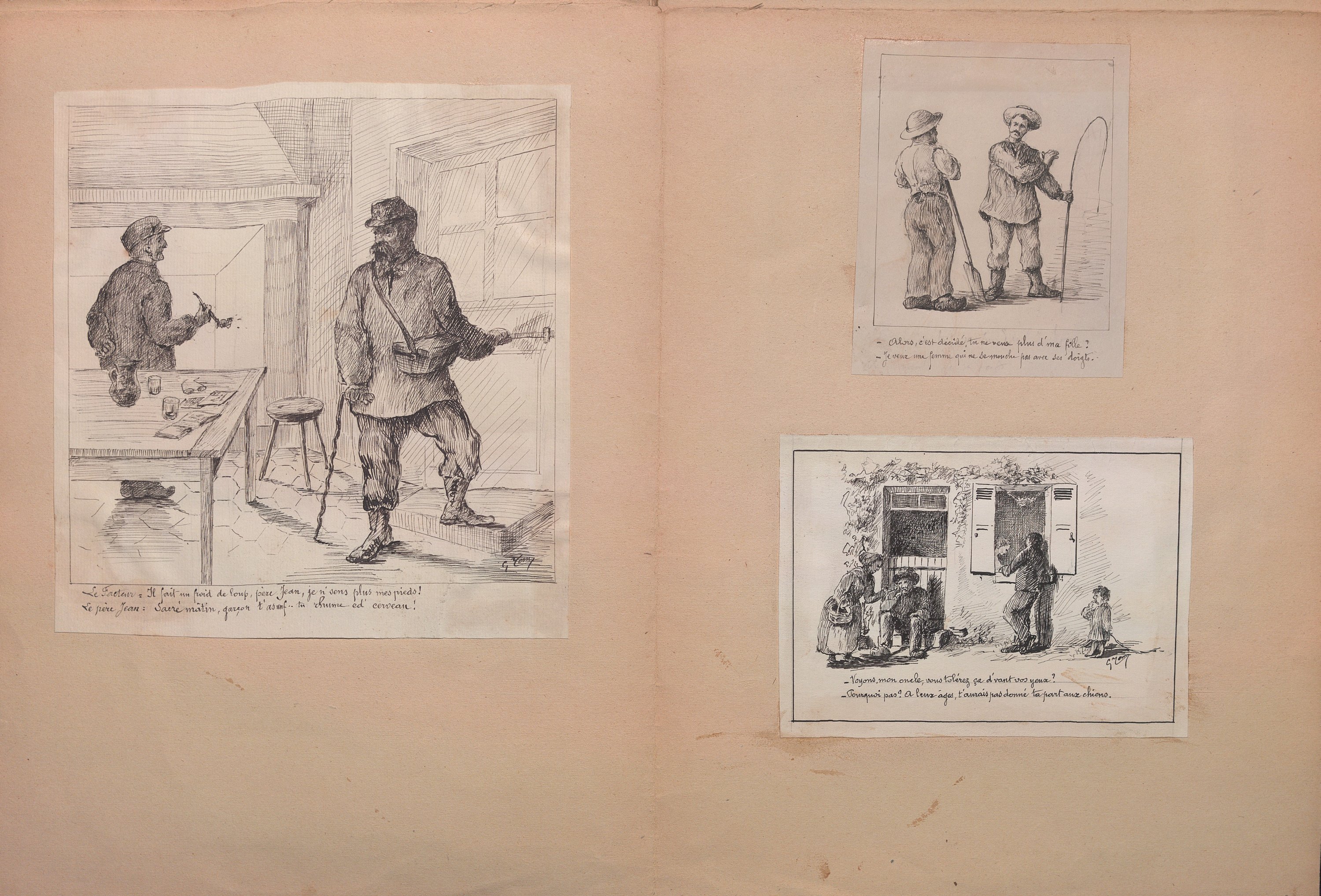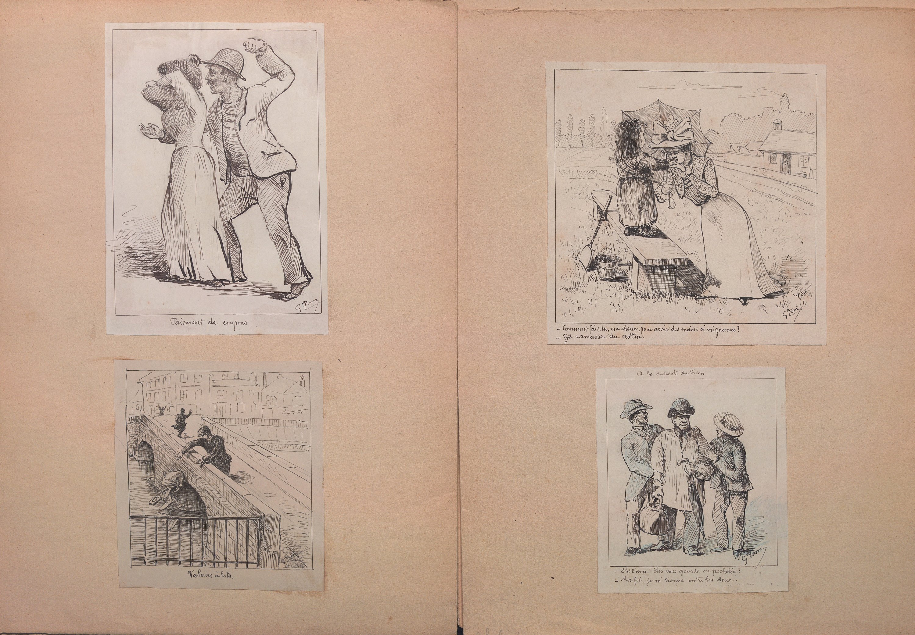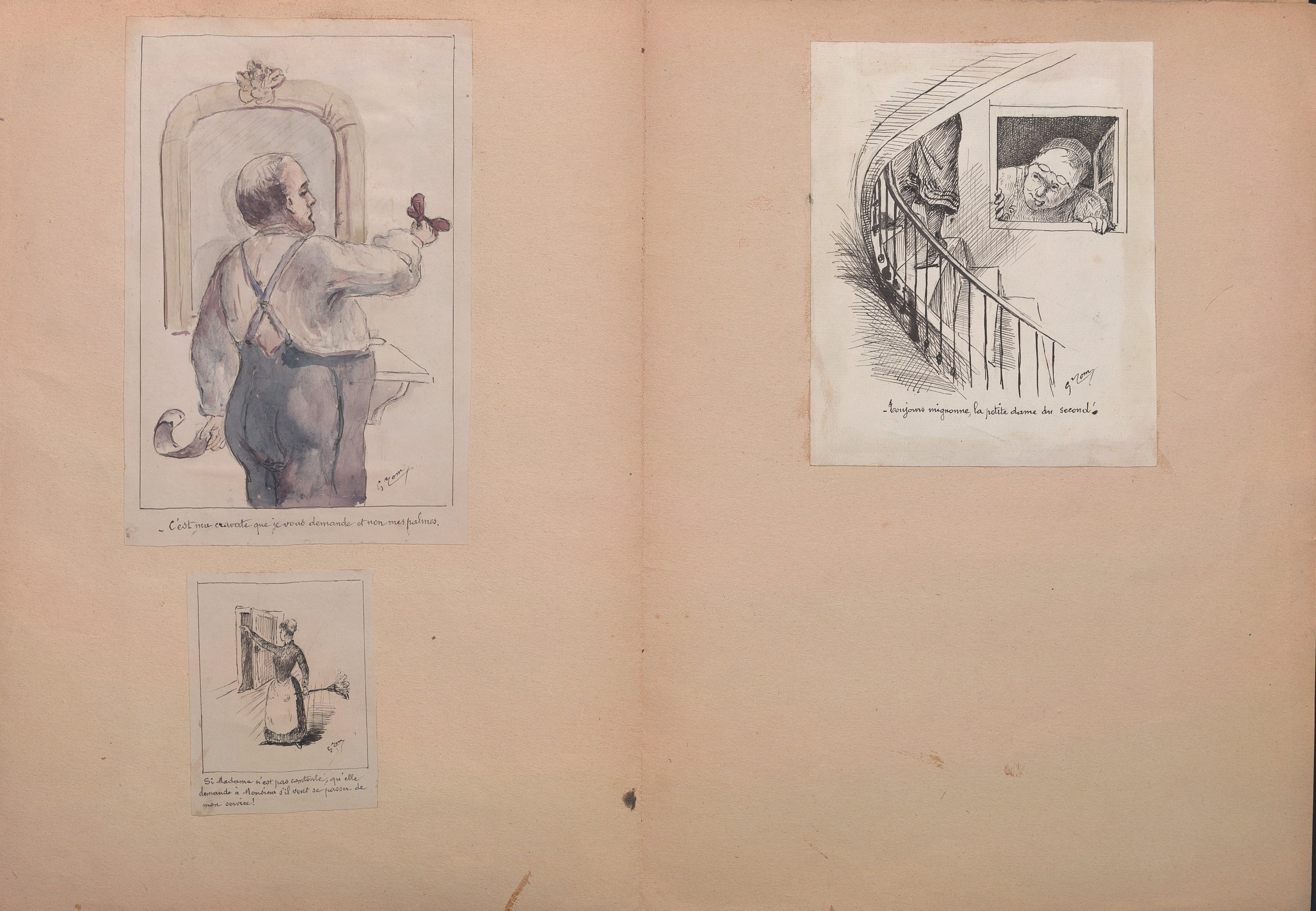 43 dessins originaux humoristiques et divers, encre et aquarelle, formats divers, contrecollés sur feuillet épais 38 x 28 cm, tous signés G. Tom ou G. Thomas, légendés dont La Lot & Garonnaise.