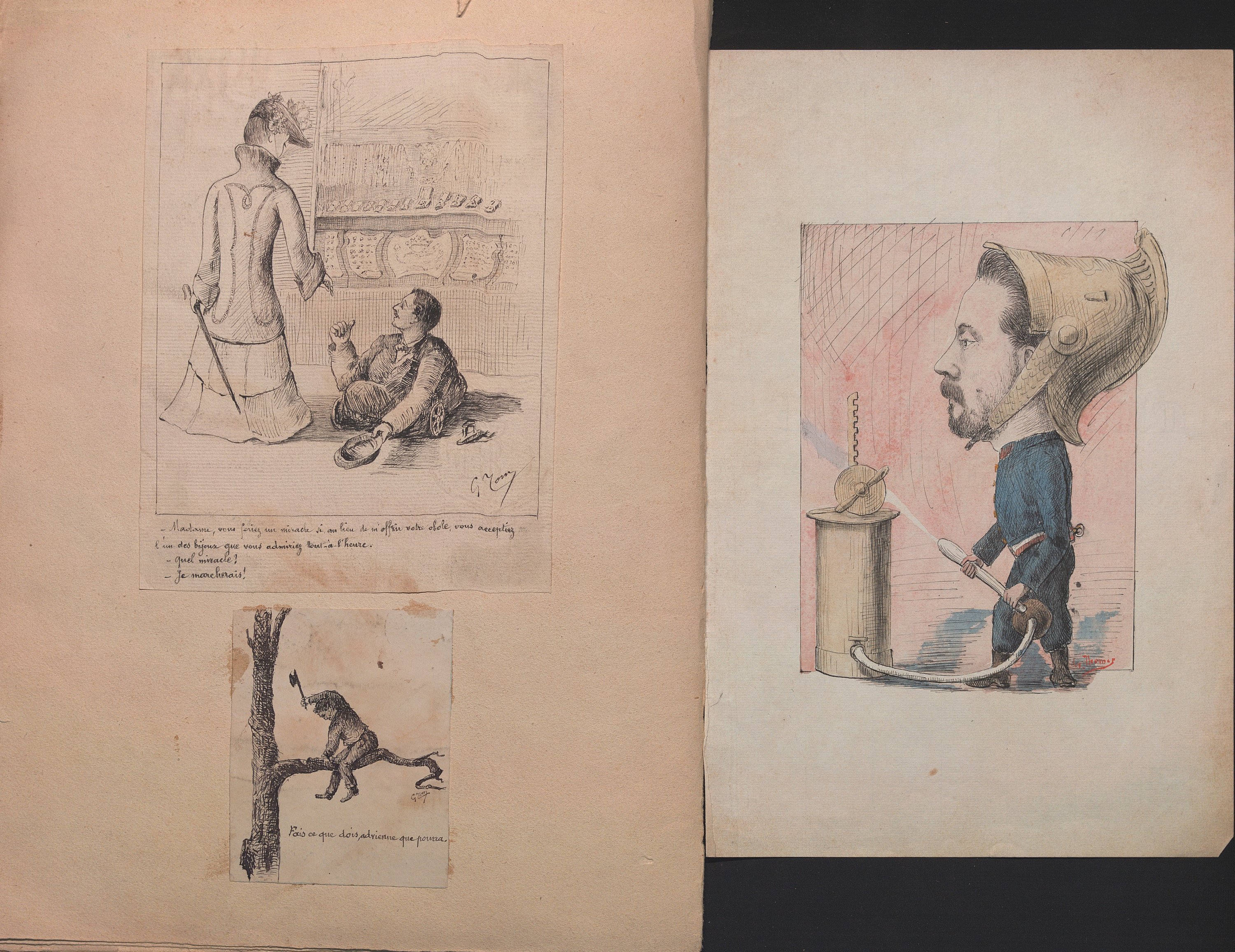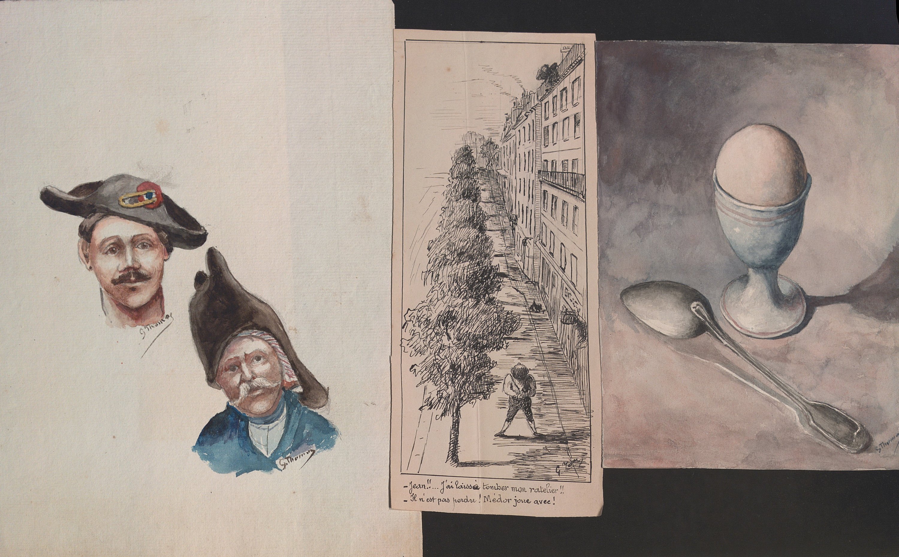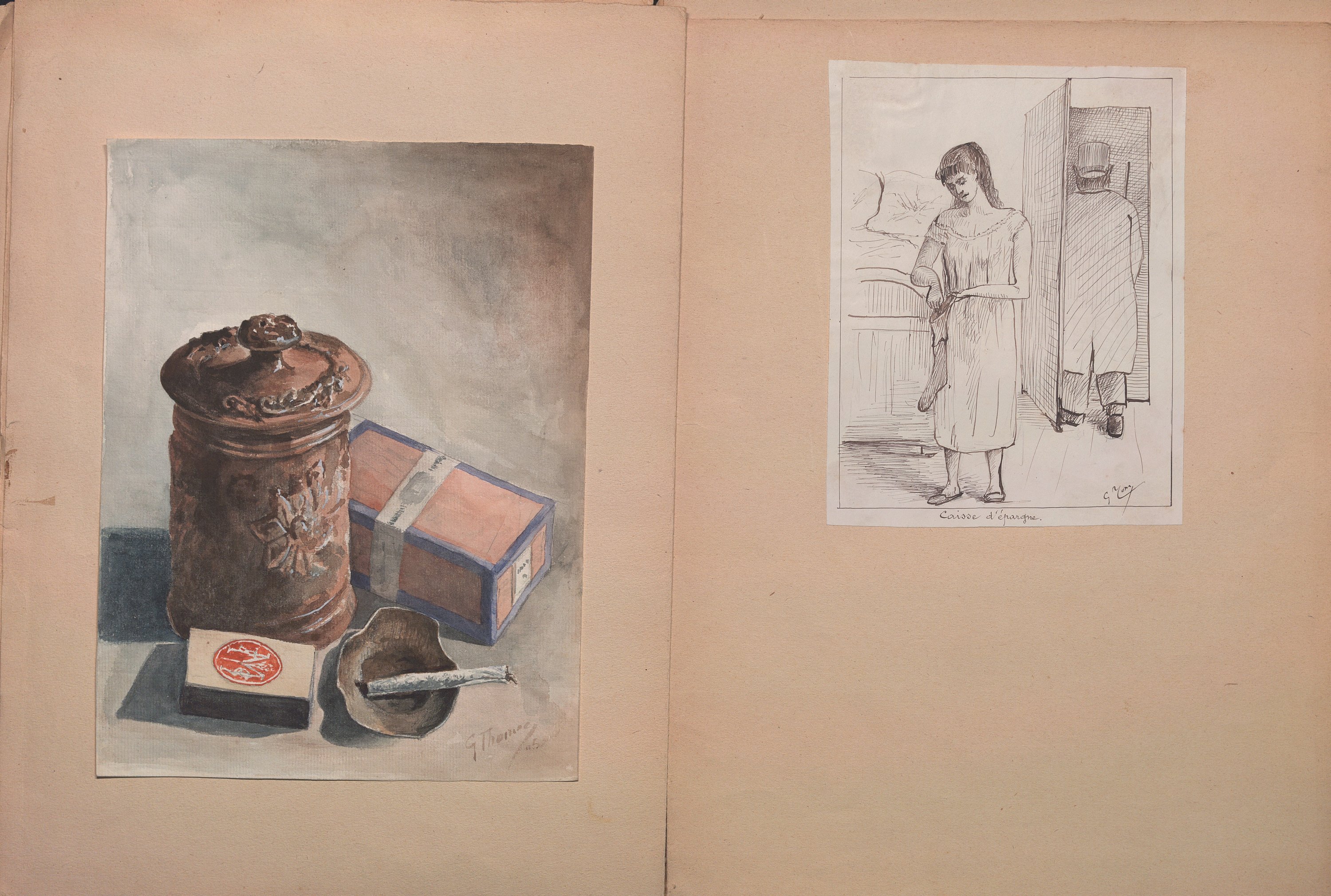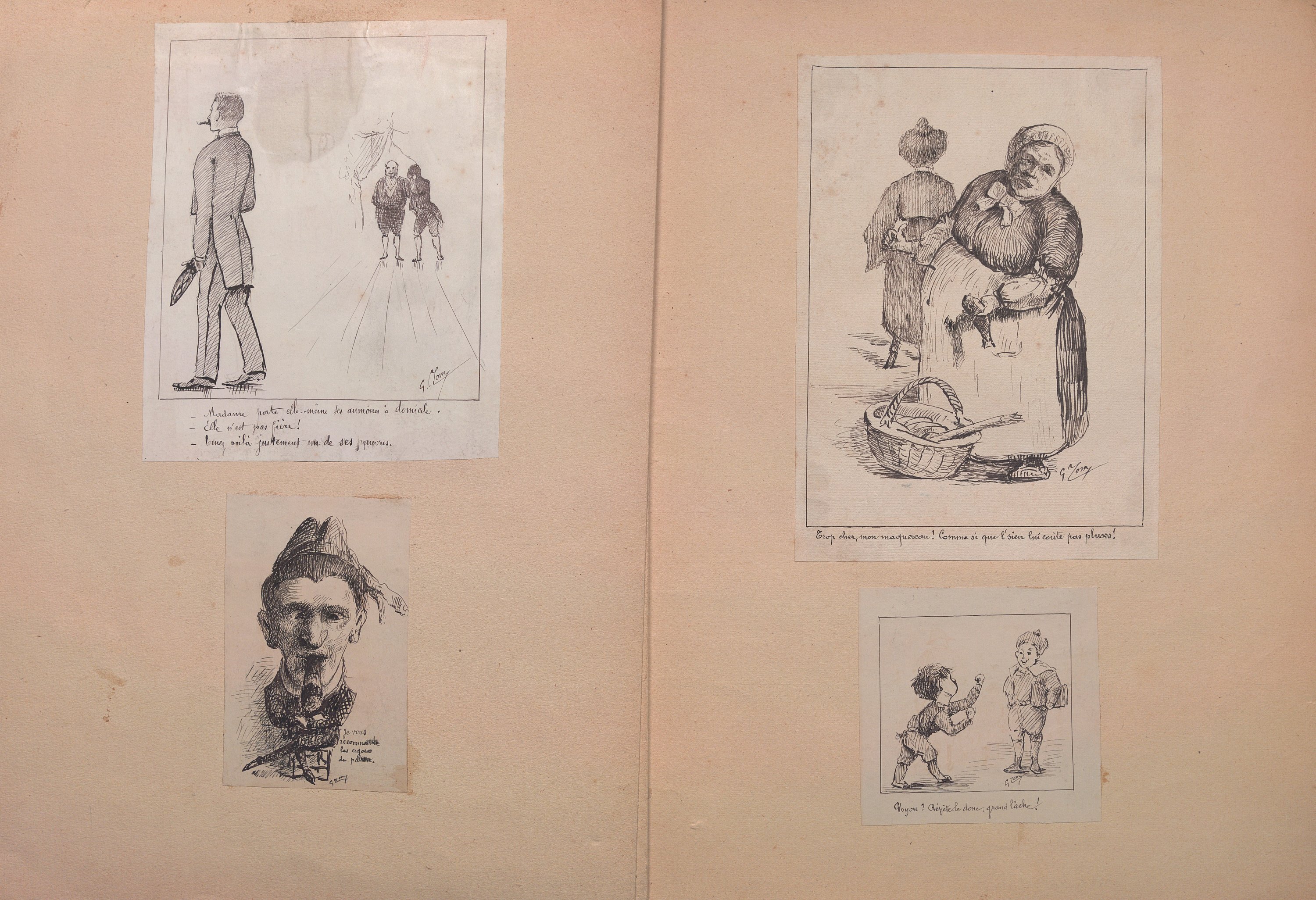 43 dessins originaux humoristiques et divers, encre et aquarelle, formats divers, contrecollés sur feuillet épais 38 x 28 cm, tous signés G. Tom ou G. Thomas, légendés dont La Lot & Garonnaise.