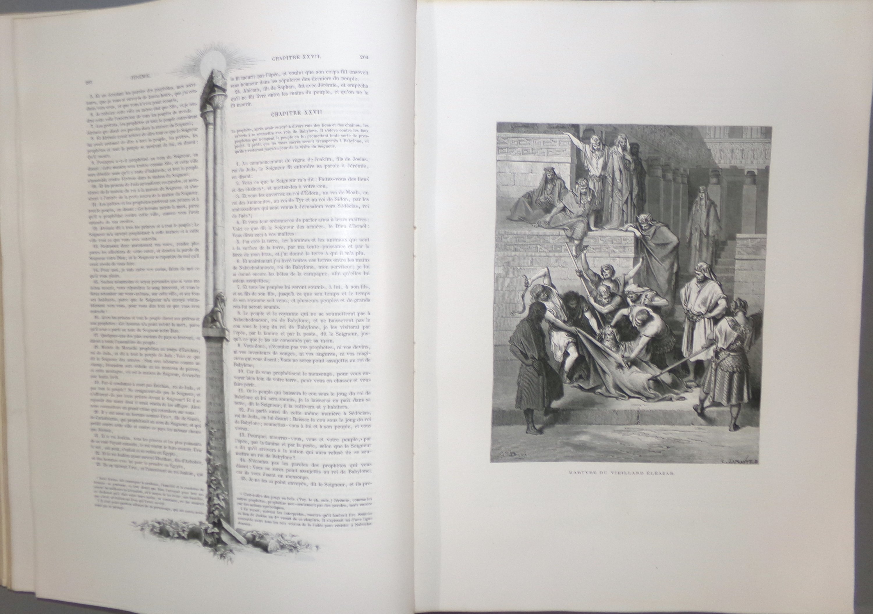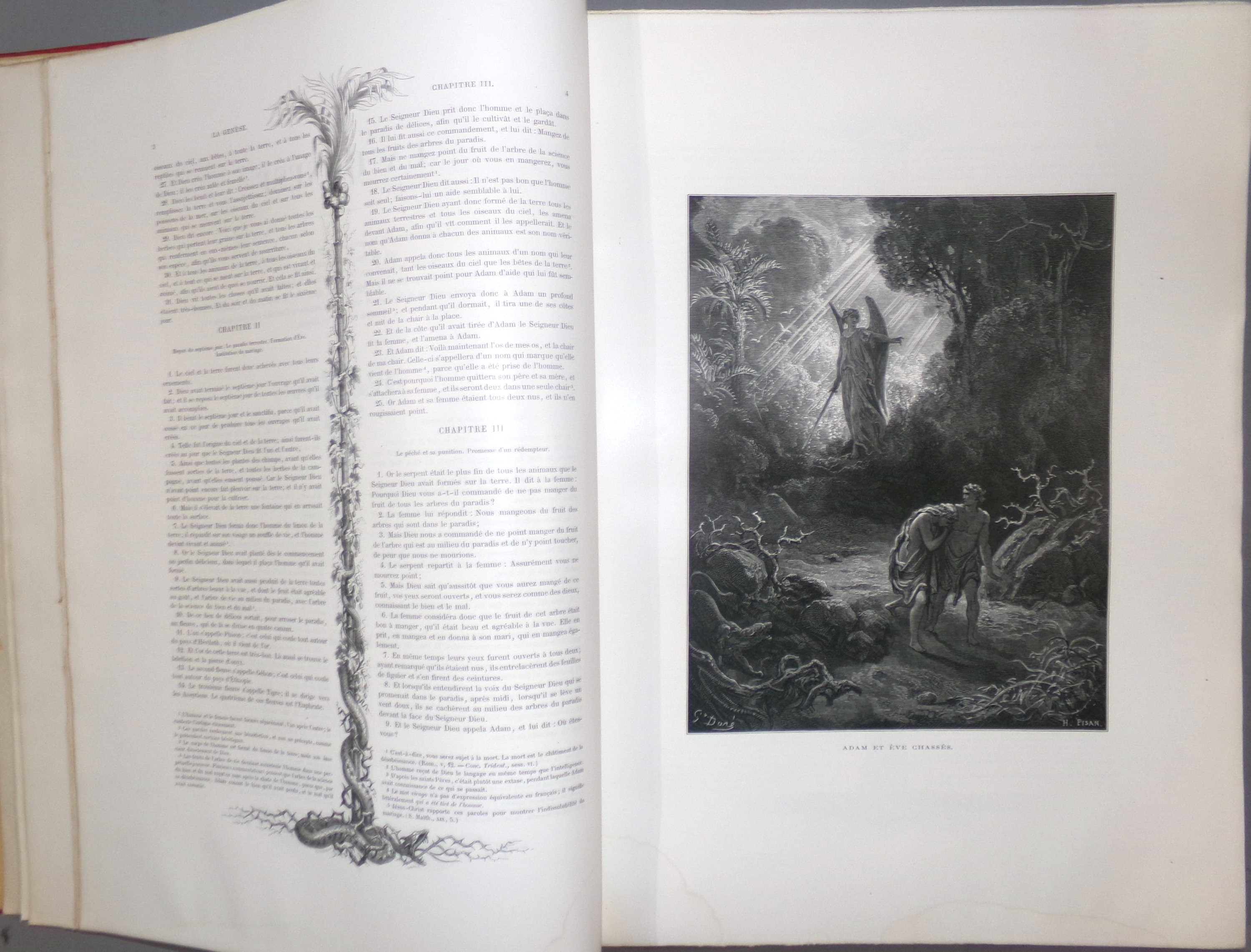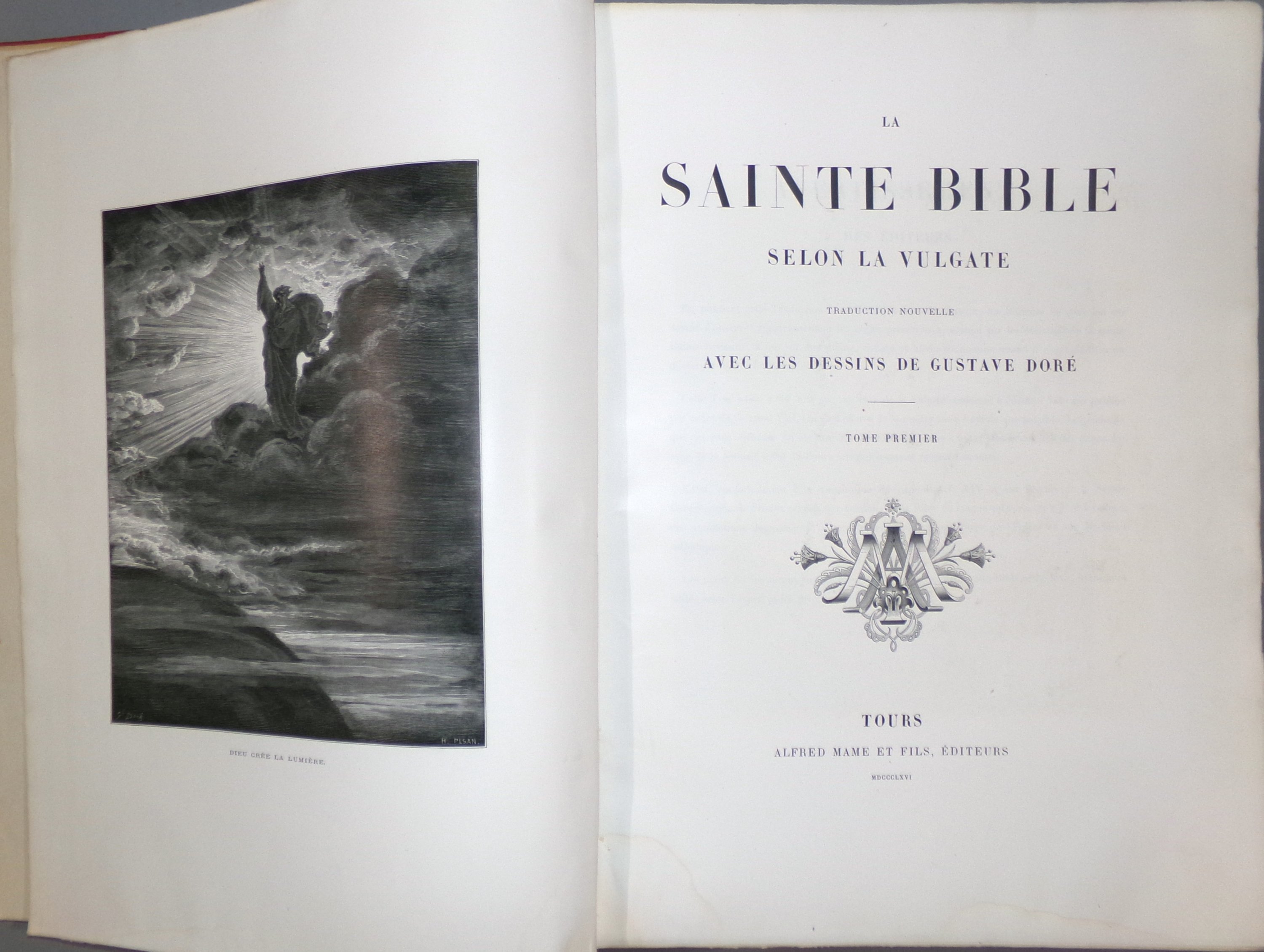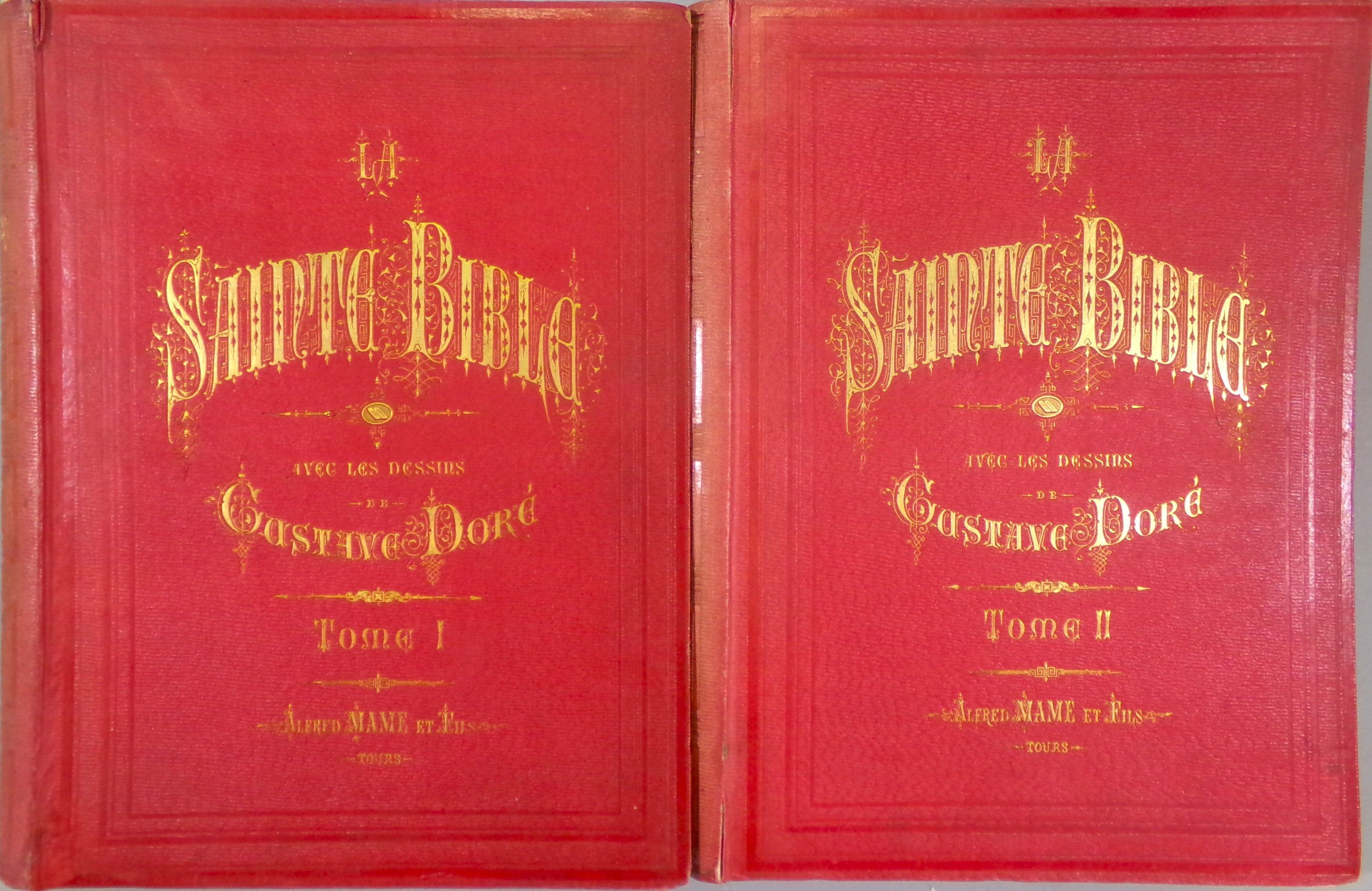 La Sainte Bible. 2 tomes en 2 vol. Tours, Mame, 1866. Fort in-fol. percaline rouge couv. éditeur. Ornementation du texte par Giacomelli et planches de Gustave Doré.