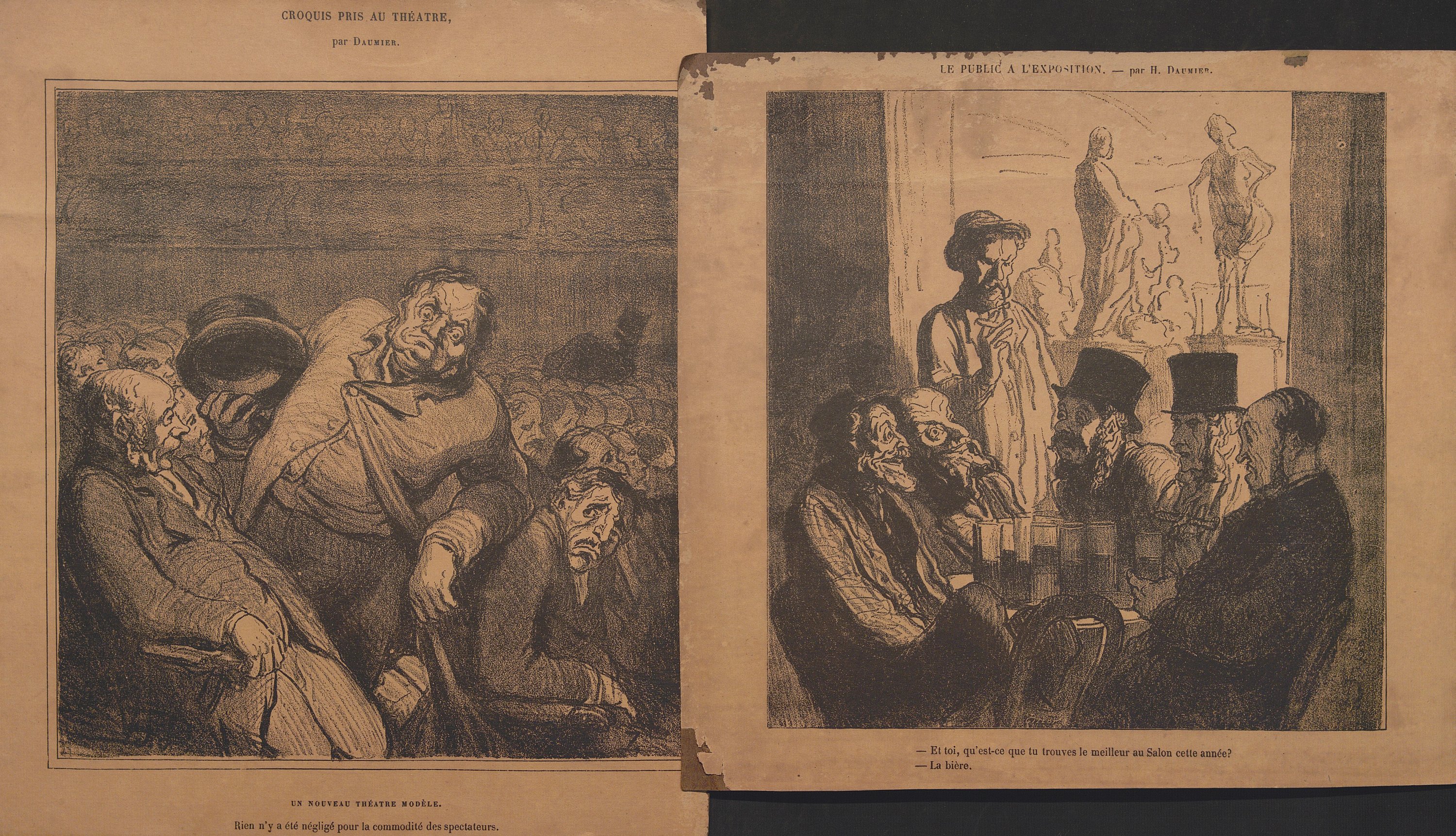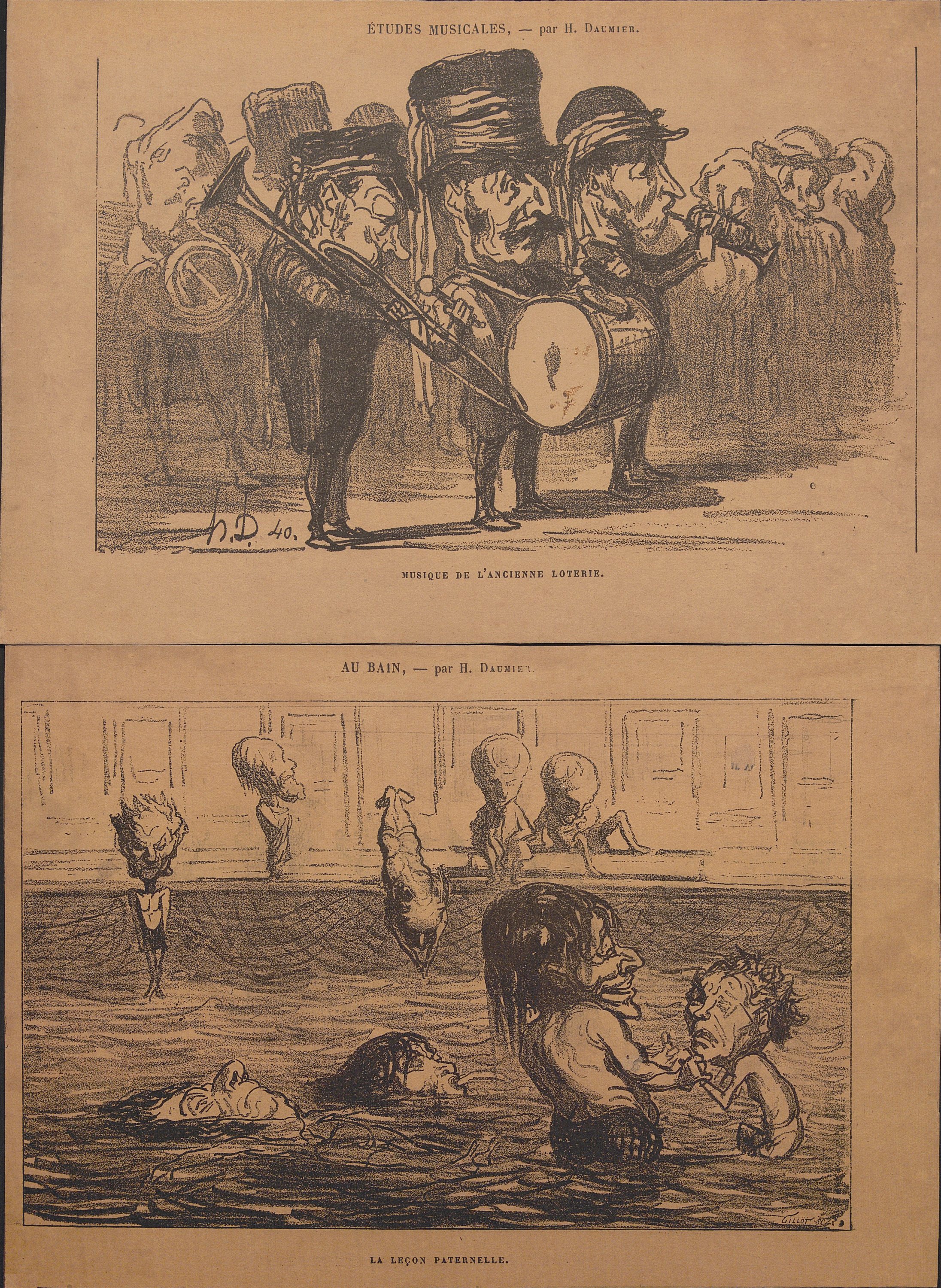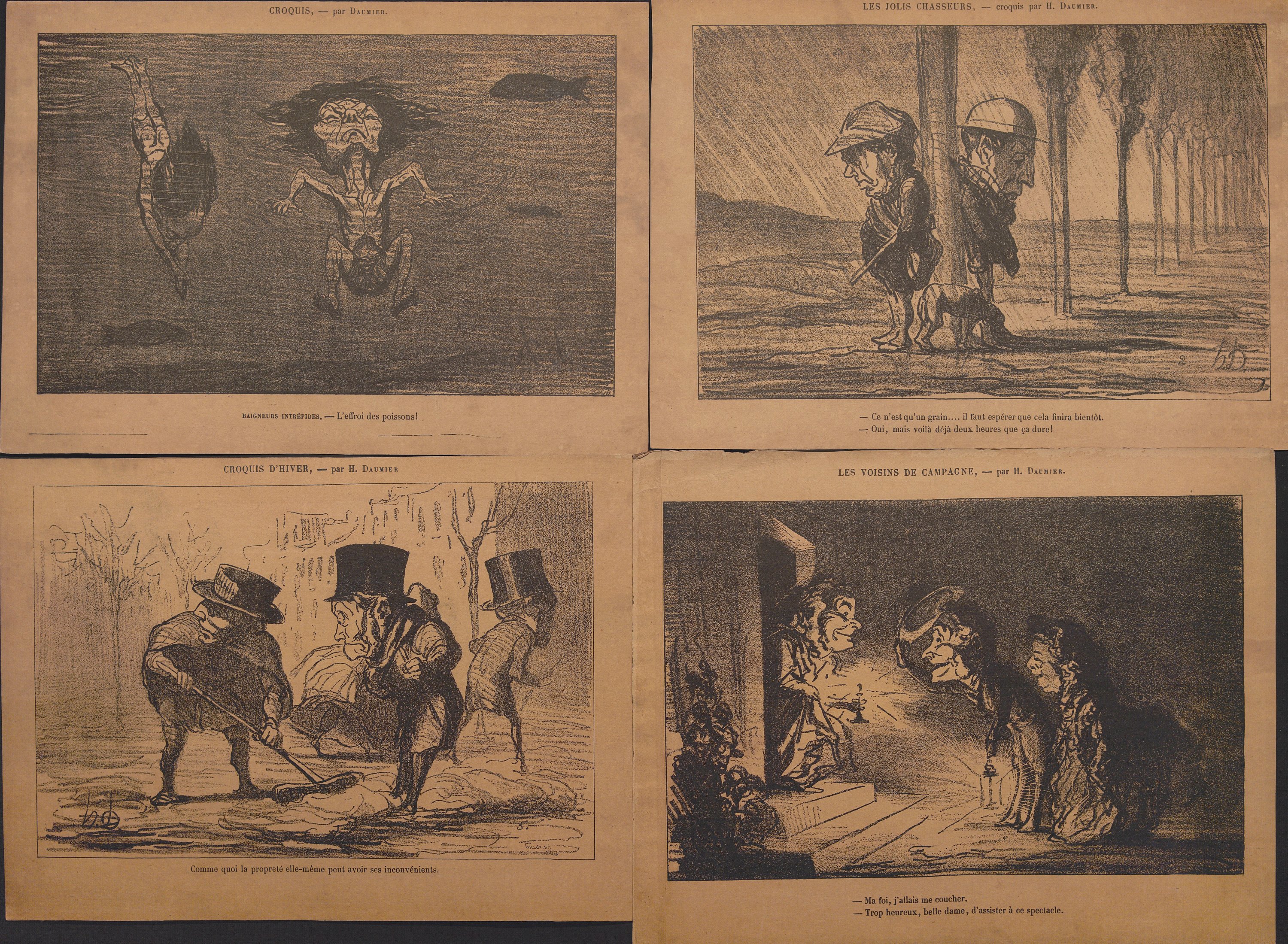 48 caricatures d’après Honoré Daumier, extraites des journaux d’époque comme le Charivari, contrecollées sur carton fort, env. 21 x 28 et 26 x 28 cm ;
