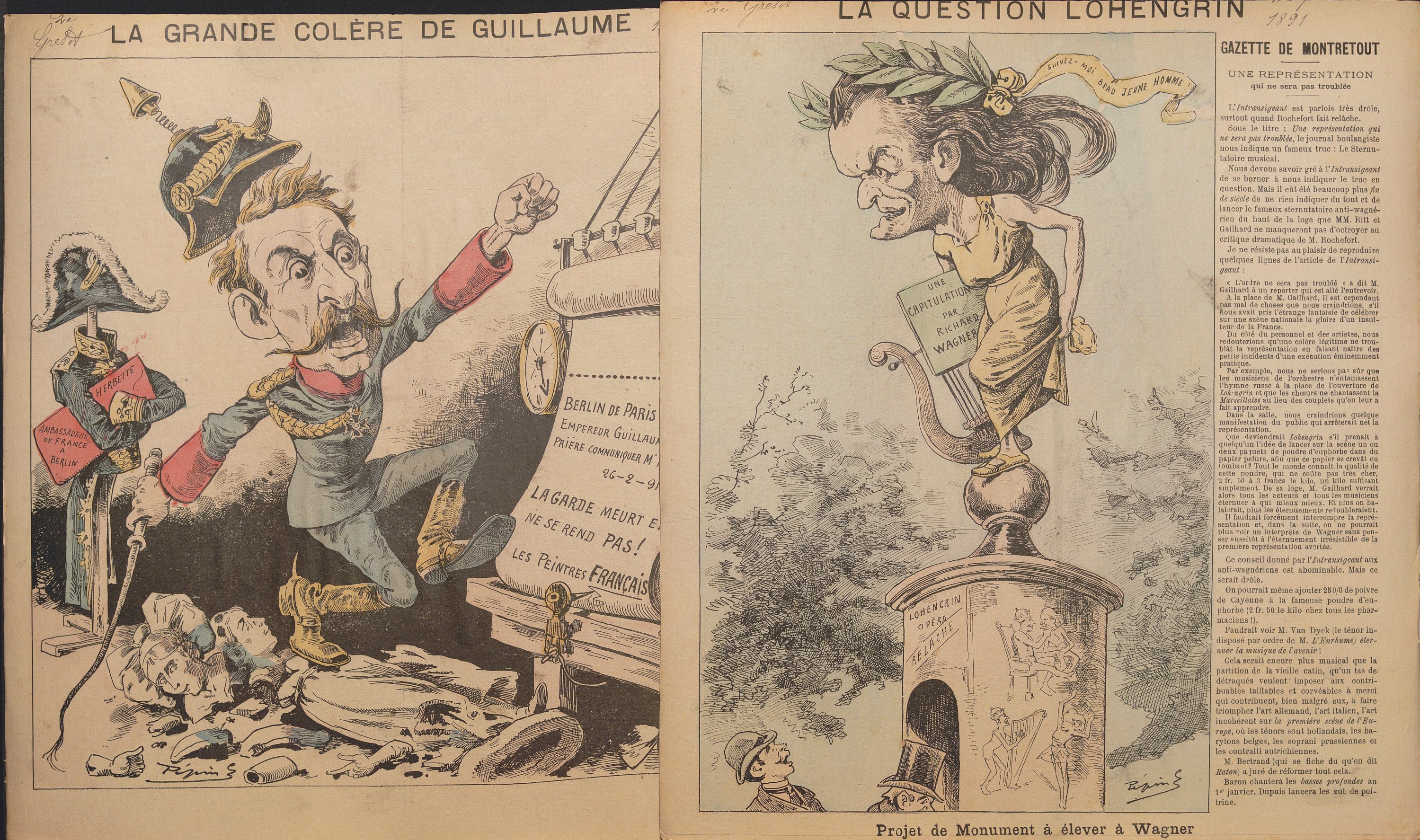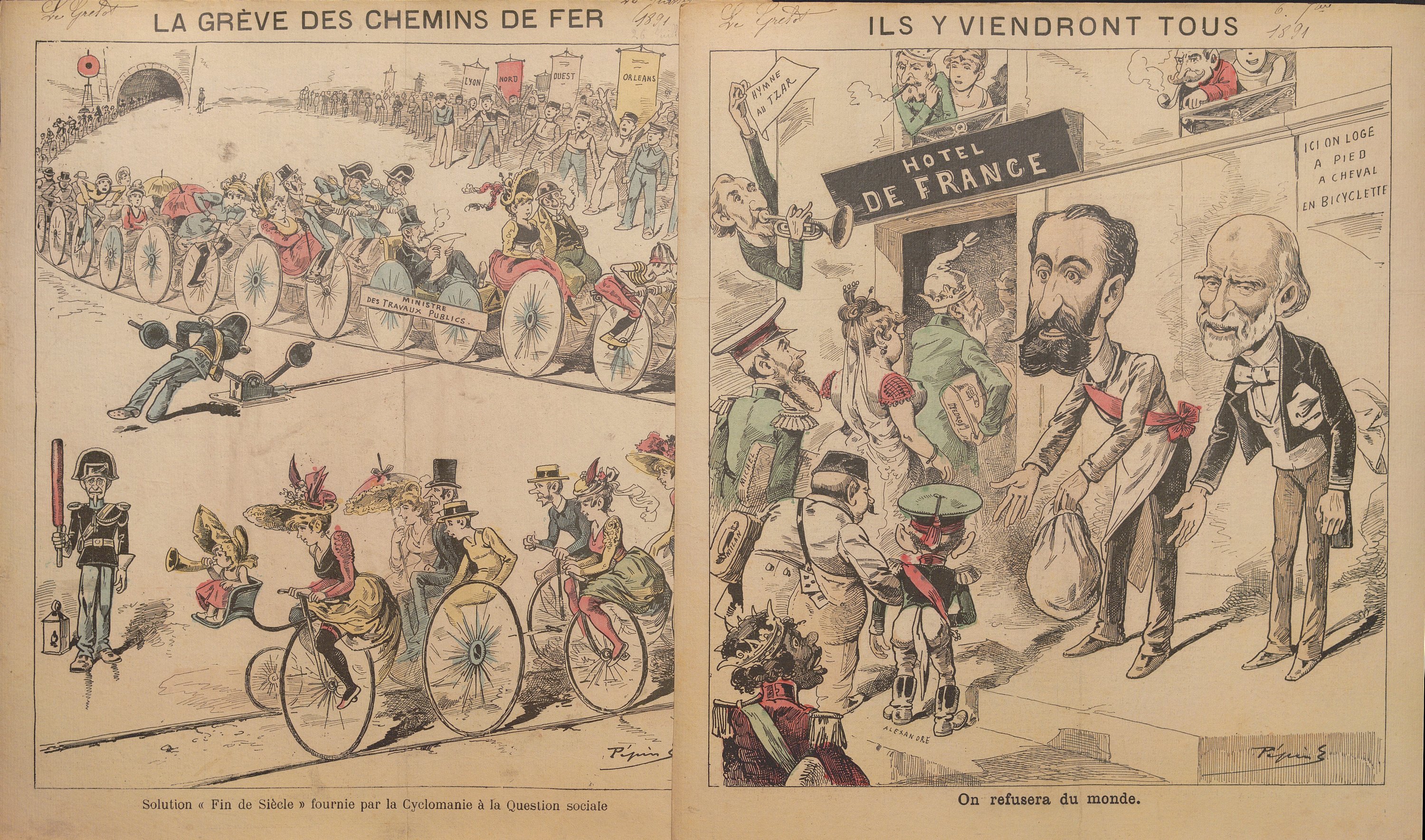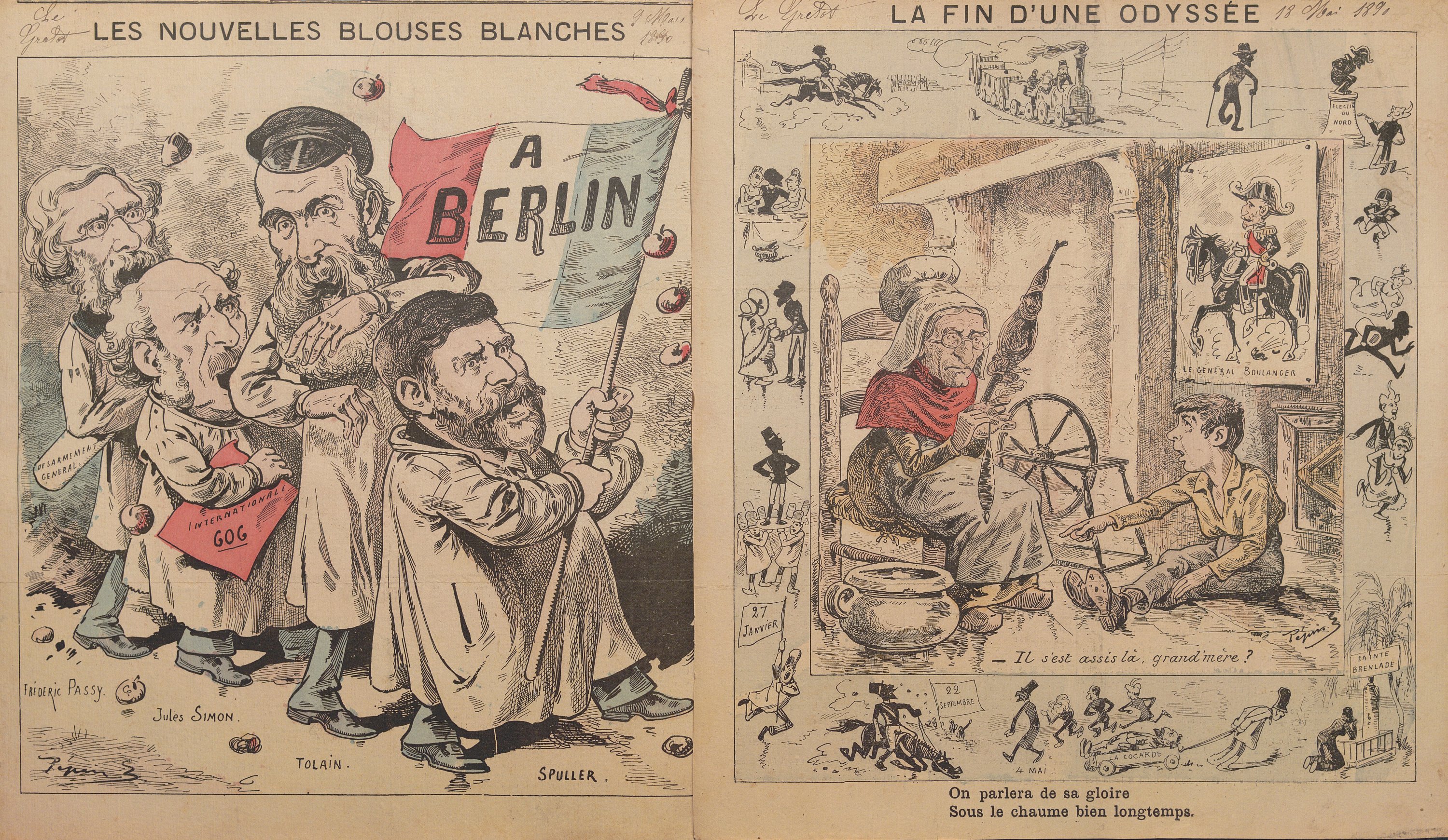 39 caricatures d’après Edouard Pépin à rehauts de couleurs d’époque au pochoir, extraites de la Une du journal Le Grelot, parues au cours de l’année 1891, contrecollées sur carton fort, env. 35 x 32 cm.