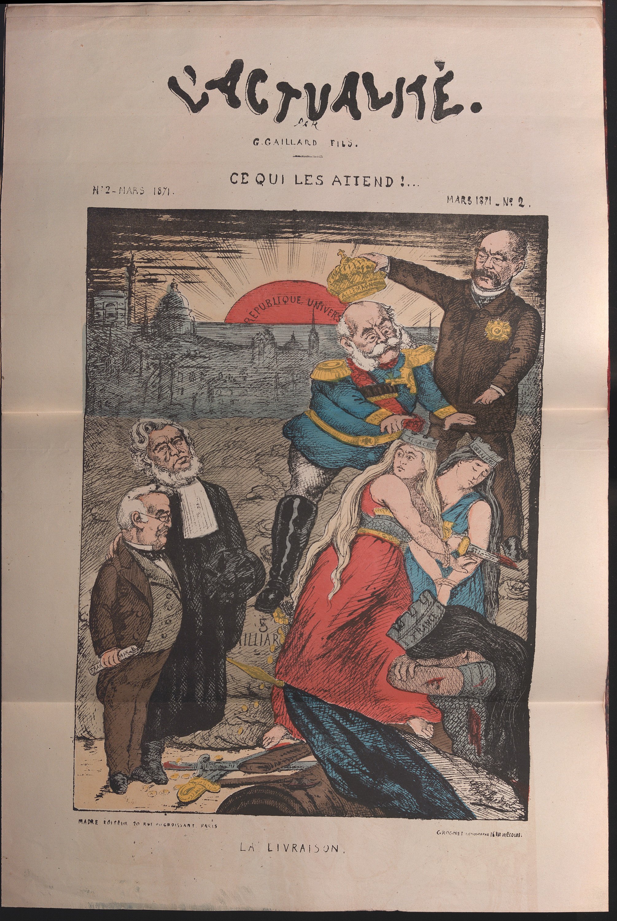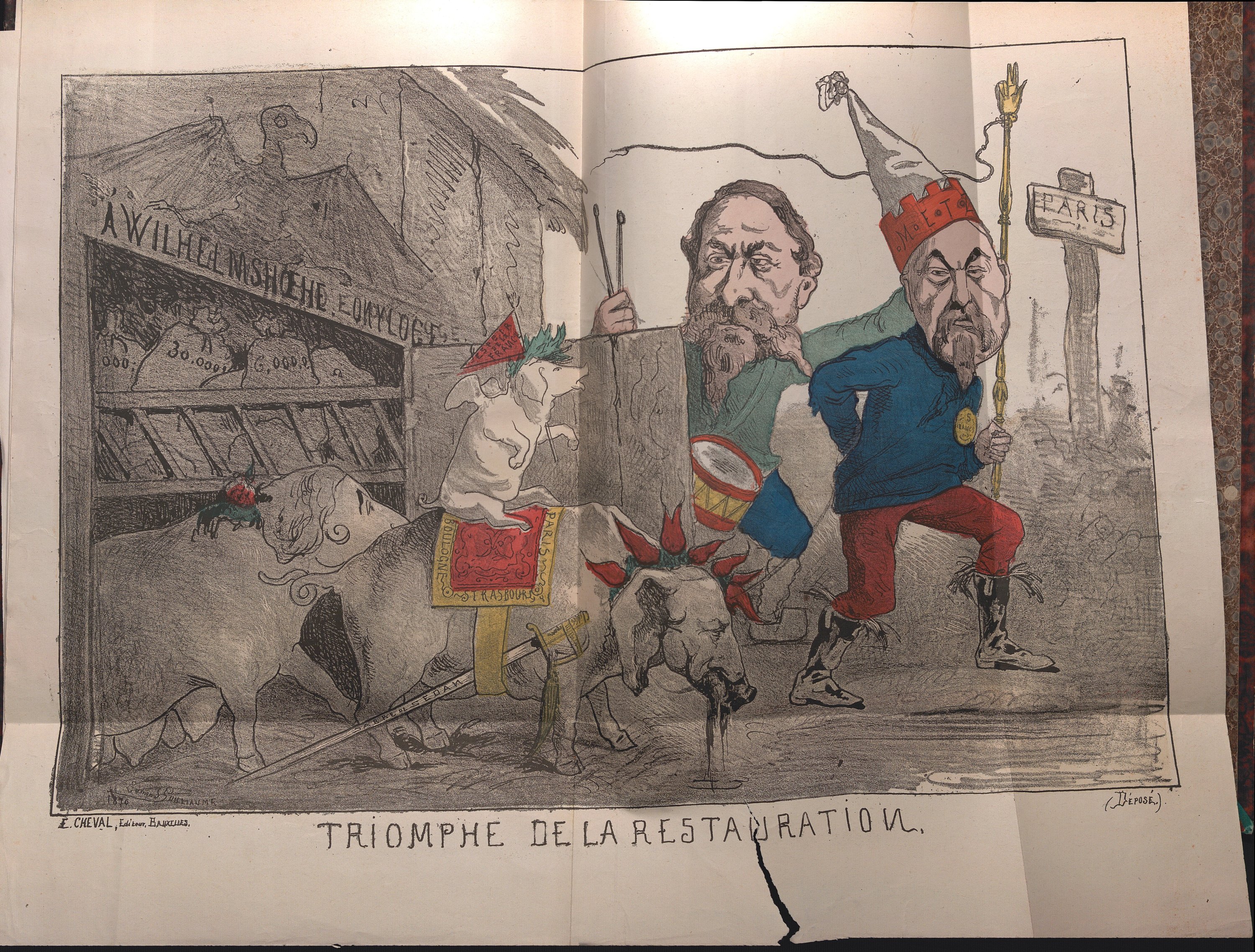 « Avec l’effondrement de l’Empire, l’avancée des armées prussiennes sur la capitale française, la proclamation de la République à Paris le 4 septembre 1870, le journalisme satirique imagé reconquiert son champ d’action originel: la rue. La feuille volante domine par rapport à la caricature incluse dans un journal. Parmi les quelque 4 000 publications parues entre septembre 1870 et l’écrasement de la Commune, fin mai 1871, de nombreuses feuilles volantes ont pu atteindre le tirage-record de 50 000 exemplaires. Pour les satiristes ces événements sont naturellement l’occasion de régler leurs comptes avec le régime déchu. Leur discours en image ne se borne pas à évoquer les 20 années de règne dictatorial, il dénonce aussi le maintien de l’appareil militaire et administratif bonapartiste » [La caricature entre République et censure, 2019]