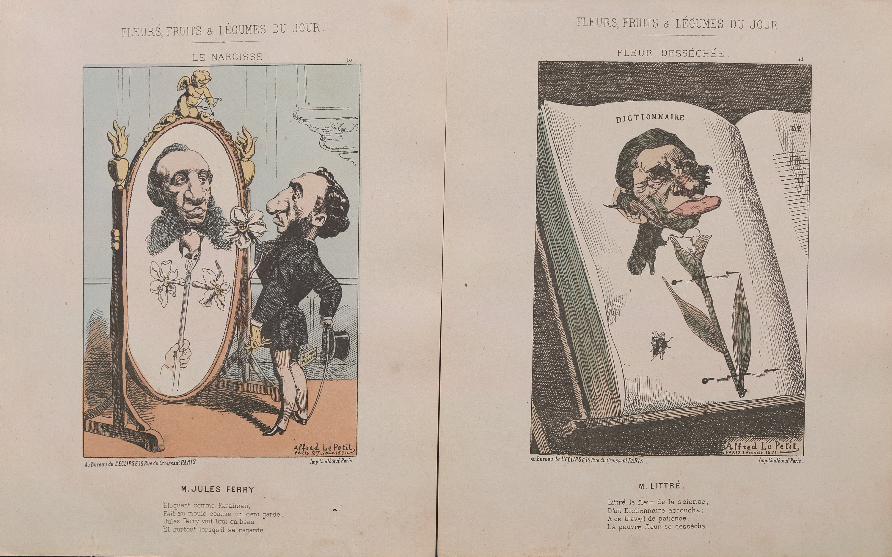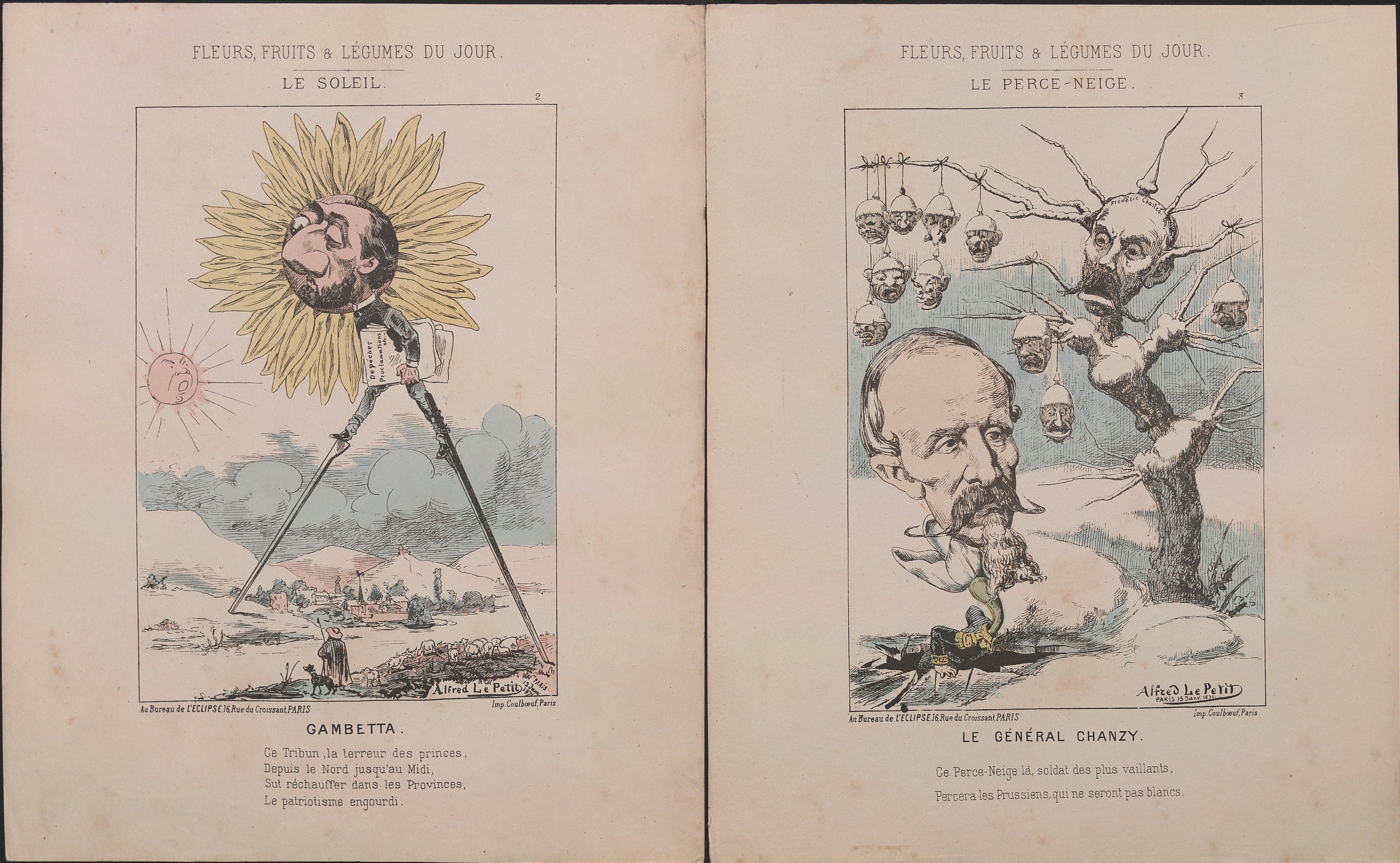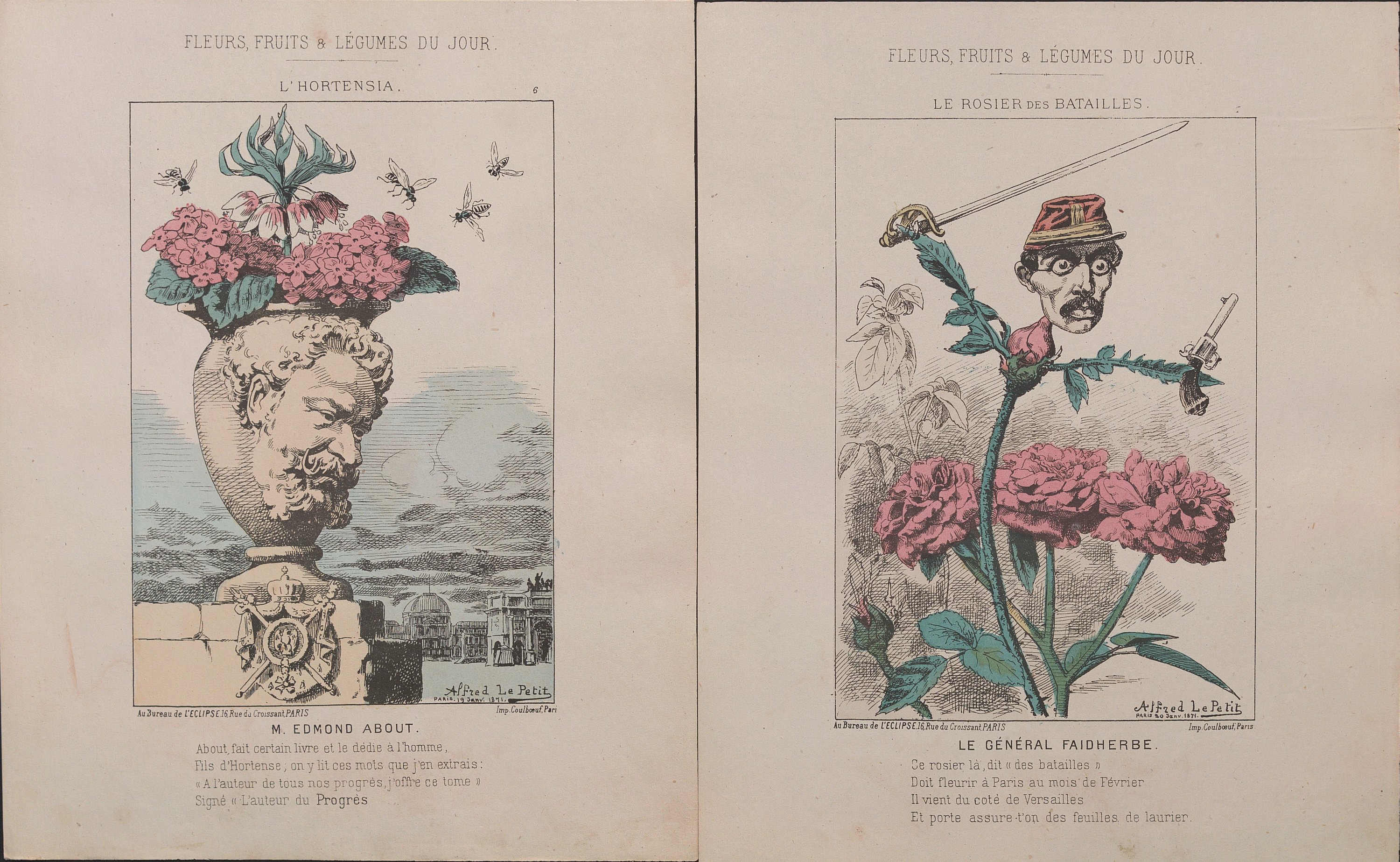 Suite complète de 32 planches datées de janvier à juin 1871. 31 caricatures figurant en fleur, fruit ou légume chaque personnalité dont Gambetta, Edmond About, Félix Pyat, Jules Ferry, Henri Rochefort, Adolphe Thiers, Victor Hugo, Emile Littré, etc.