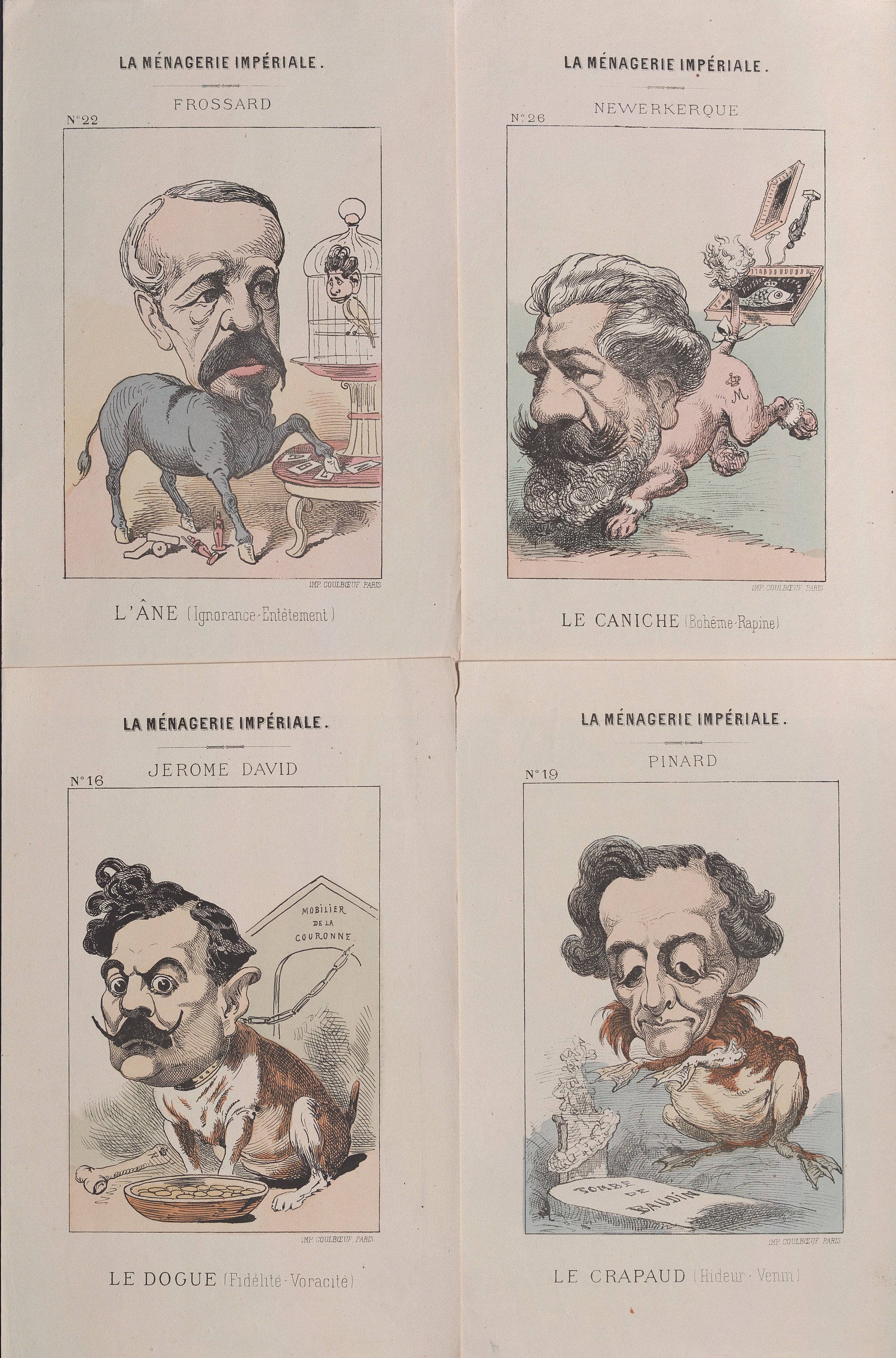 Paul Hadol, série La Ménagerie Impériale, 17 pl. (sur 31 pl.) lithographiées en noir et blanc, 27,5 x 18 cm ;