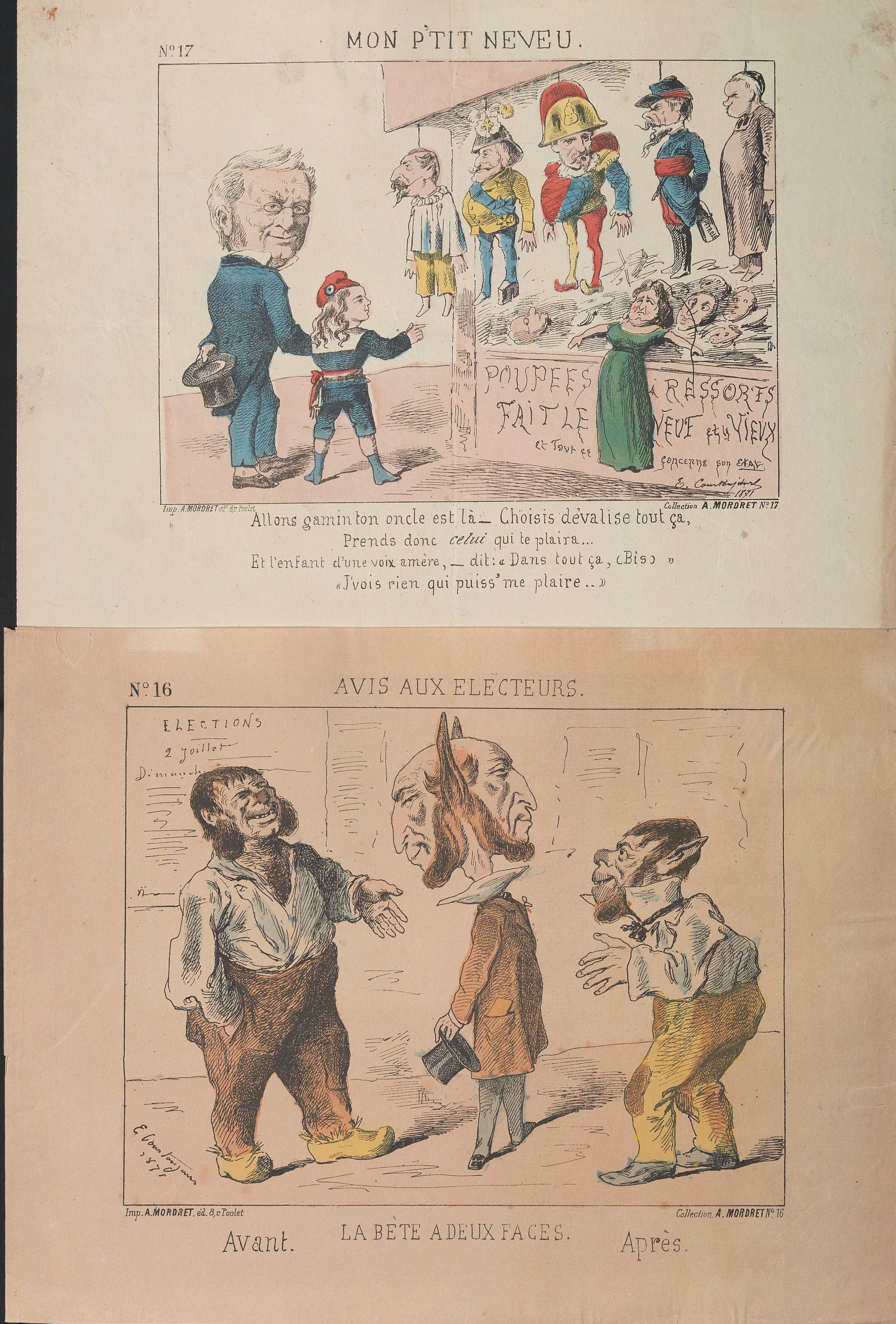 Charles Vernier (1813-1892), 6 feuilles volantes, 35 x 27 cm: n°13 Le contraste ; n°13 Napoléon et Frédéric ; n°14 Prenez mon ours ; n°15 Le futur gouverneur de Paris ; n°16 Avis aux électeurs La Bête à deux faces ; n°17 Mon p’tit neveu.