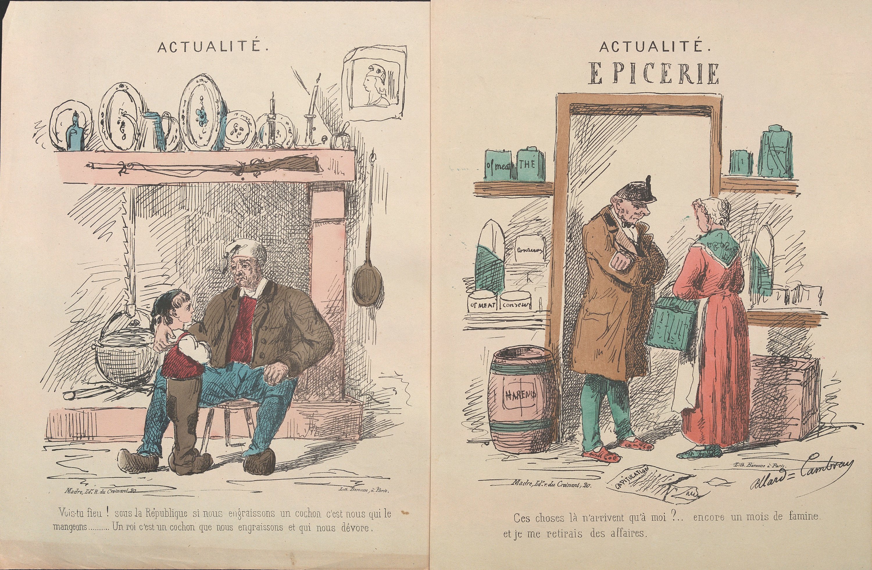 Célestin Allard-Cambray (1840-1881), 3 feuilles volantes: Actualité - Vois-tu fieu! sous la République si nous engraissons un cochon c’est nous qui le mangeons Un roi c’est un cochon que nous engraissons et qui nous dévore, 33 x 25 cm (non signée) ; Actualité - Ces choses-là n’arrivent qu’à moi?... encore un mois de famine et je me retirais des affaires, 33 x 25 cm ; Actualité - M’ame Thiers entremetteuse à Versailles, la chambre au fond du colidor, 36,5 x 27 cm ;
