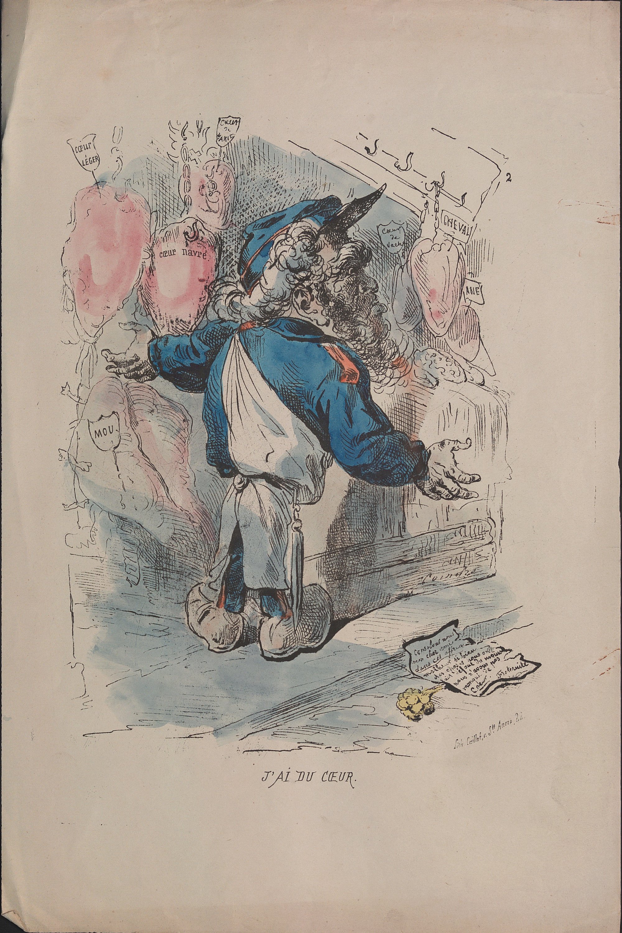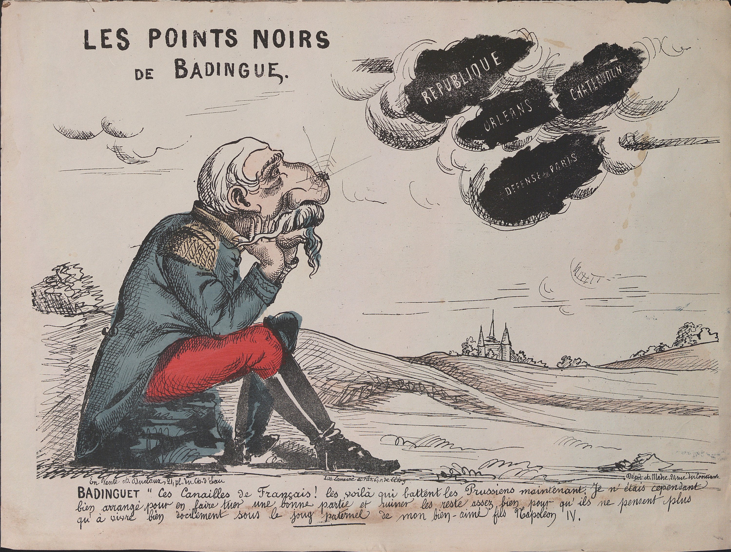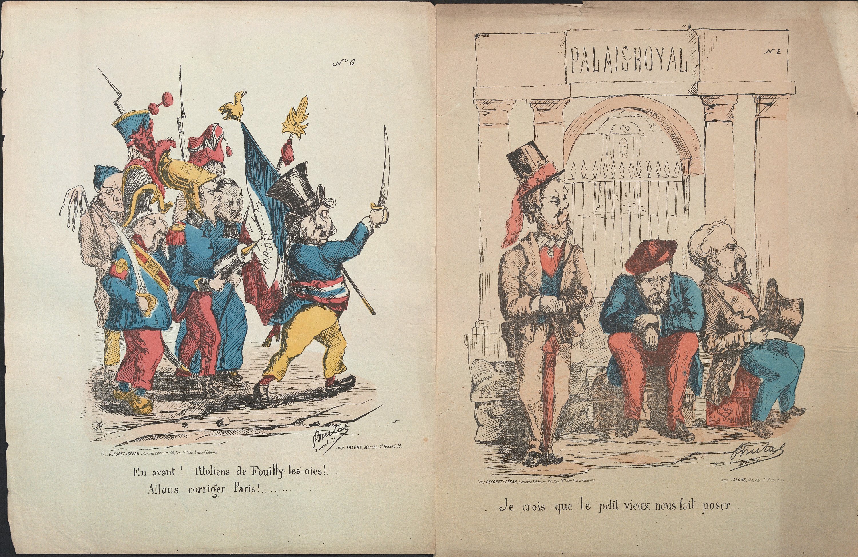 Brutal, 4 feuilles volantes, 36 x 27 cm: n°2 Je crois que le petit vieux nous fait poser ; n°3 Le généralisme des armées de terre et de mer s’en va chercher ses soldats ? (plis et déchirures en marge) ; n°5 Approche! si tu l’oses!!... ; n°6 En avant! Citoyens de Fouilly-les-Oies! Allons corriger Paris!... ;