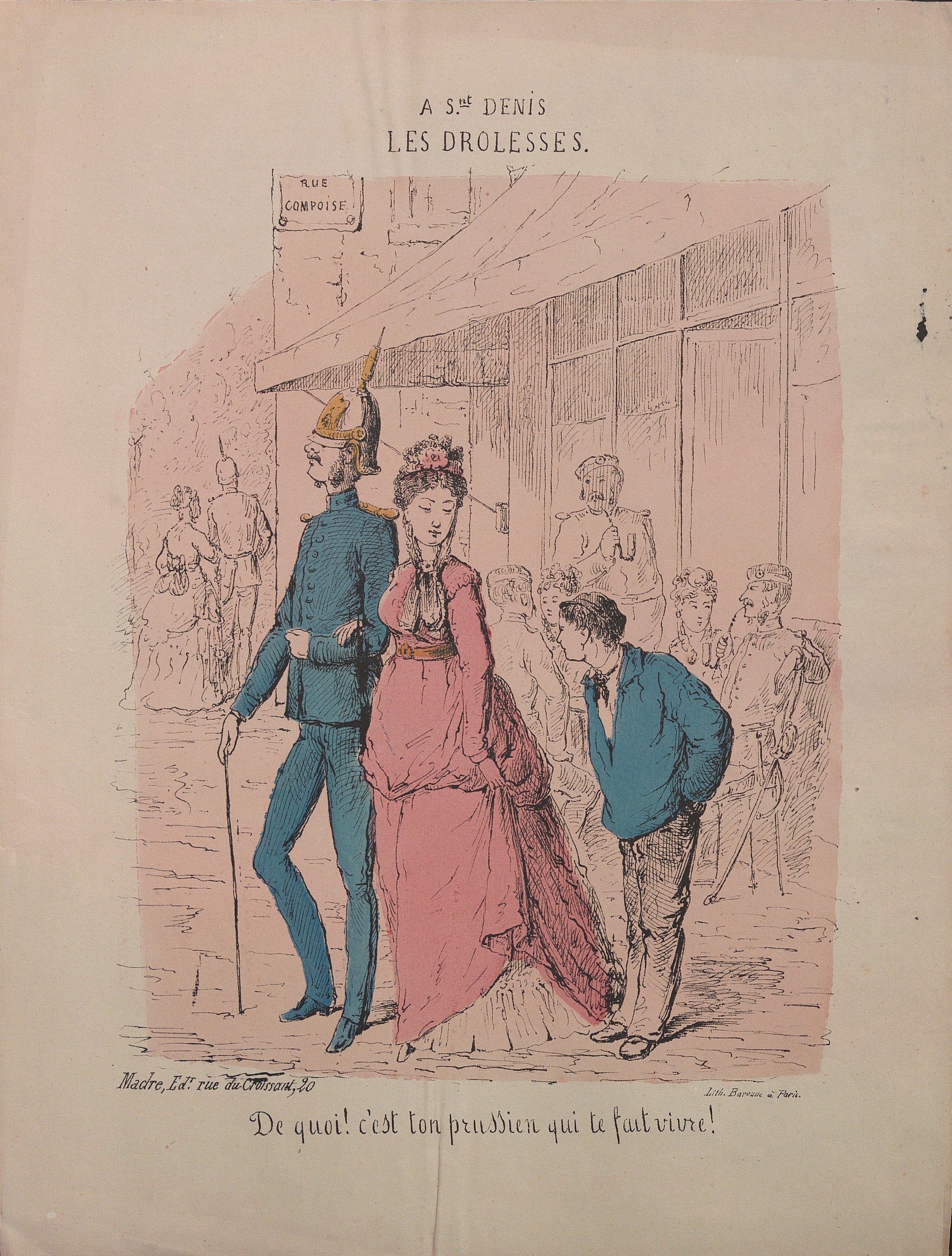 Henri Demare (1846-1888), 4 feuilles volantes: 3 ex. série Nos vainqueurs: n°1, 2 et 4 (sur 4), 32 x 24 cm ; A Saint-Denis, les Drolesses, 36 x 27 cm (non signée, attr. à).