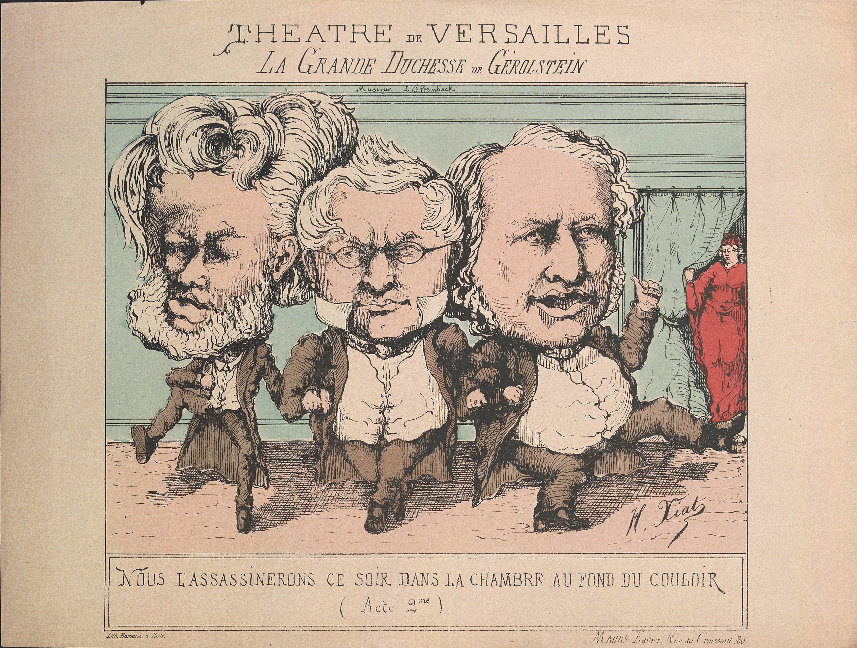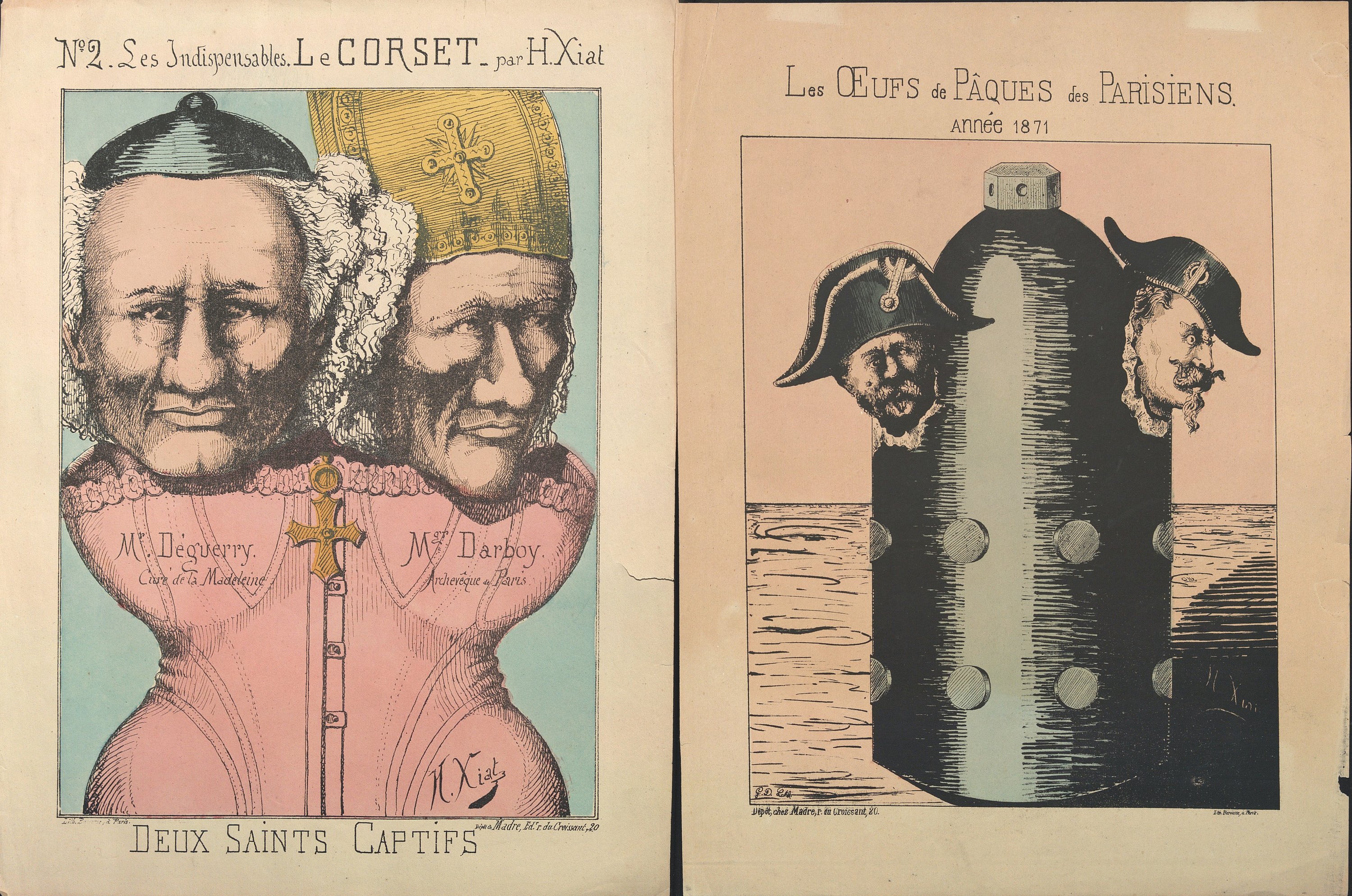 Henri Nérac dit H. Xiat, 4 feuilles volantes, 35 x 27 cm: n°1 Les Indispensables L’Eponge de Toilette (petite déchirure et petit manque en marge) ; n°2 Les Indispensables Le corset / Deux saints captifs ; Théâtre de Versailles La grande duchesse de Gerolstein (petite déchirure en marge) ; Les Œufs de Pâques des Parisiens, année 1871 (petite déchirure et petit manque en marge) ;