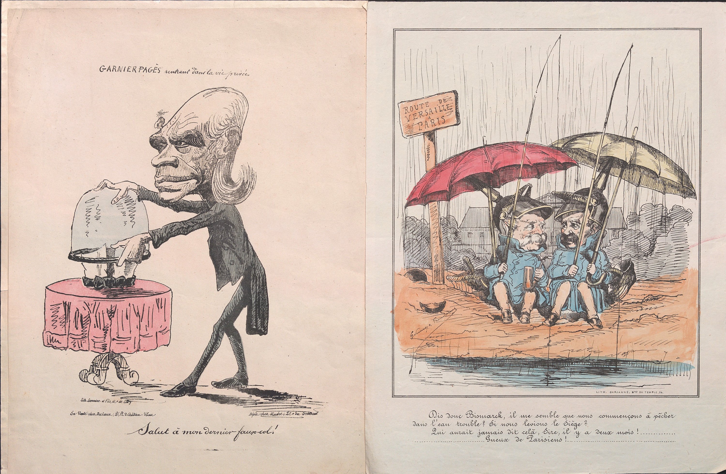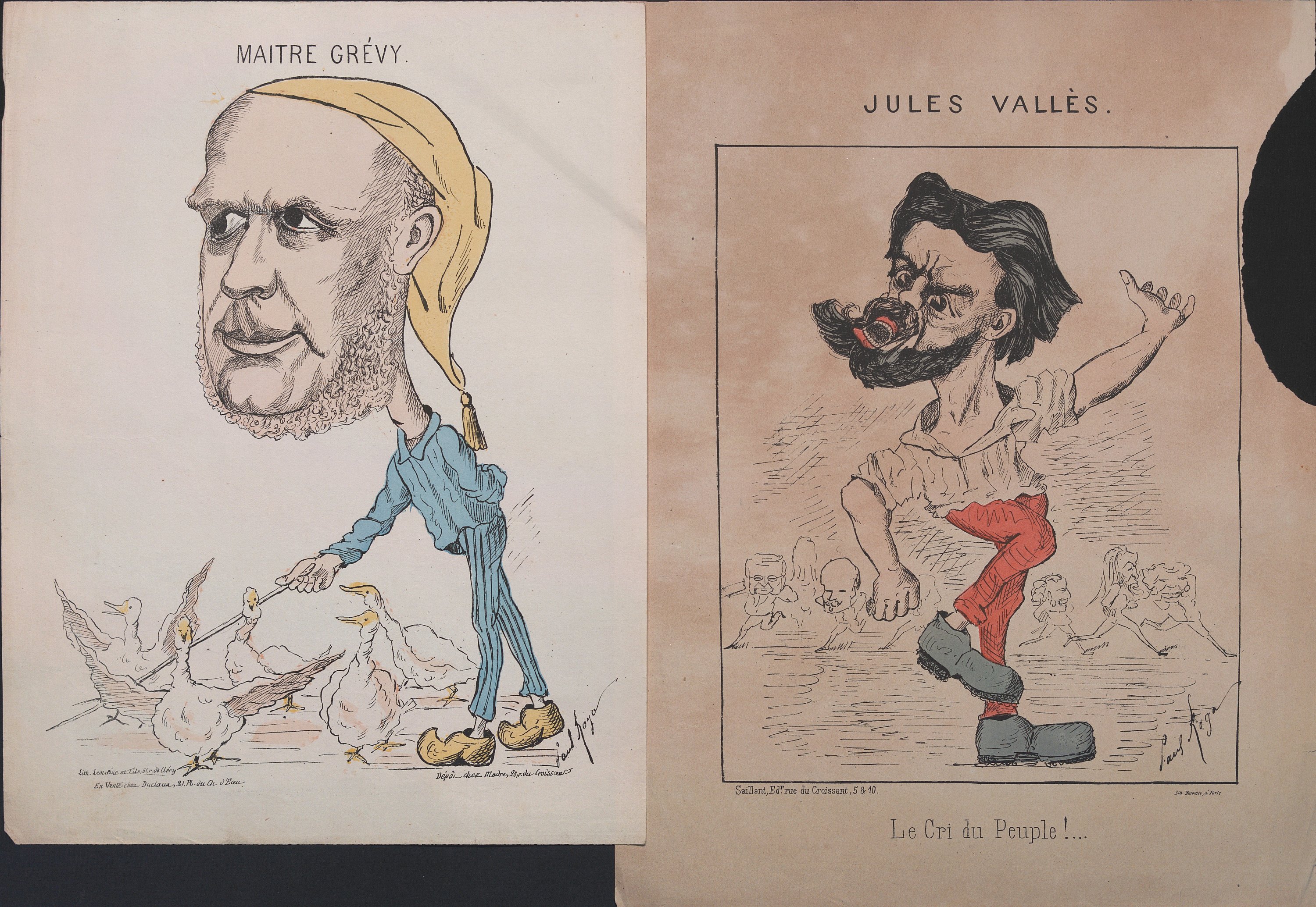 Henri Boutet (1851-1919) dit Paul Roga, 3 feuilles volantes, env. 32/35 x 27 cm: Les deux font la paire [portrait-charge de Jules Favre et Adolphe Thiers] (manques en marge, légères tâches) ; Maître Grévy [portrait-charge de Jules Grévy, président de l’Assemblée nationale] ; Jules Vallès, Le Cri du Peuple! [Député de la Commune de Paris et fondateur du journal Le Cri du Peuple] (manque en marge à droite) ;