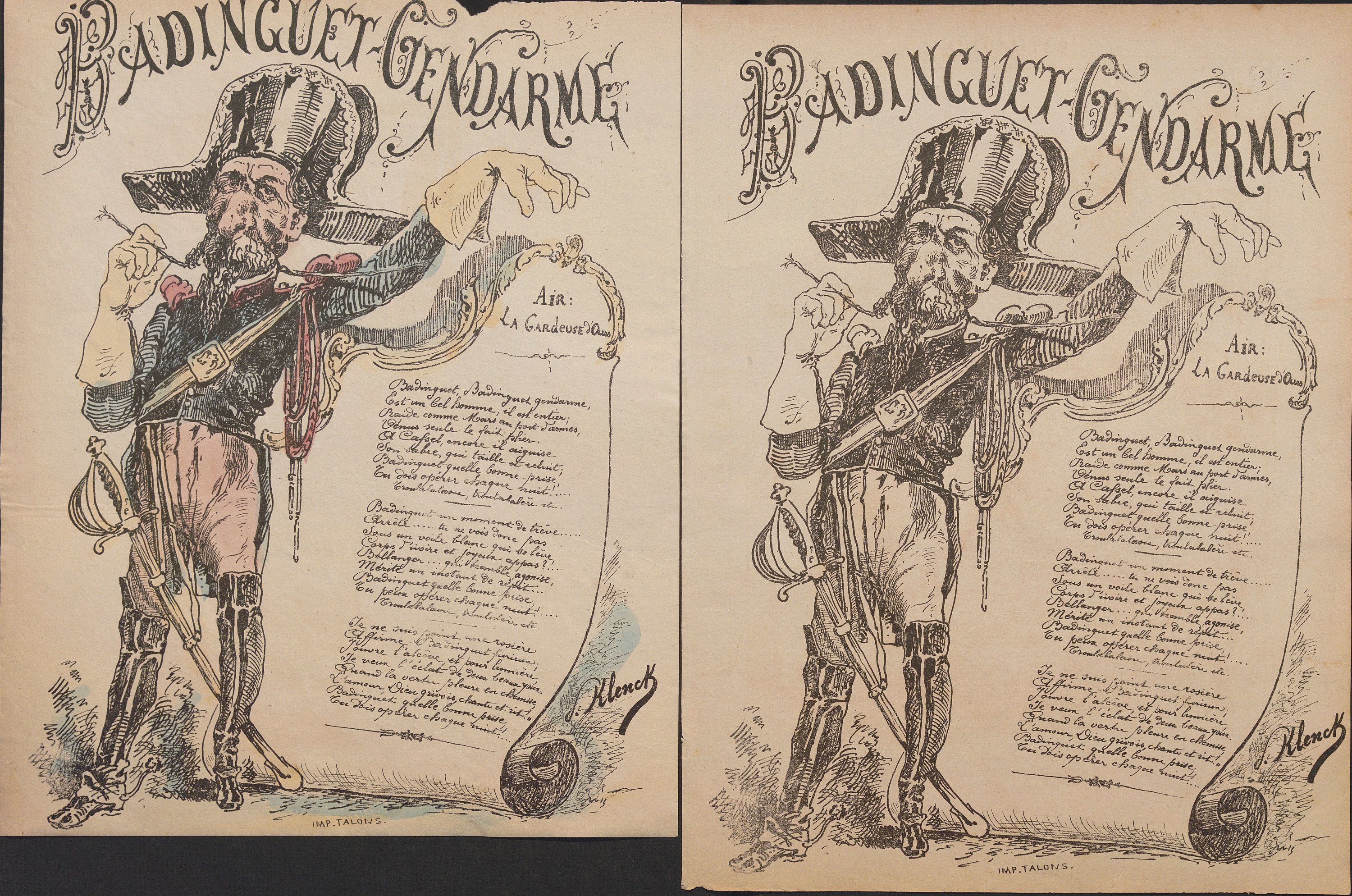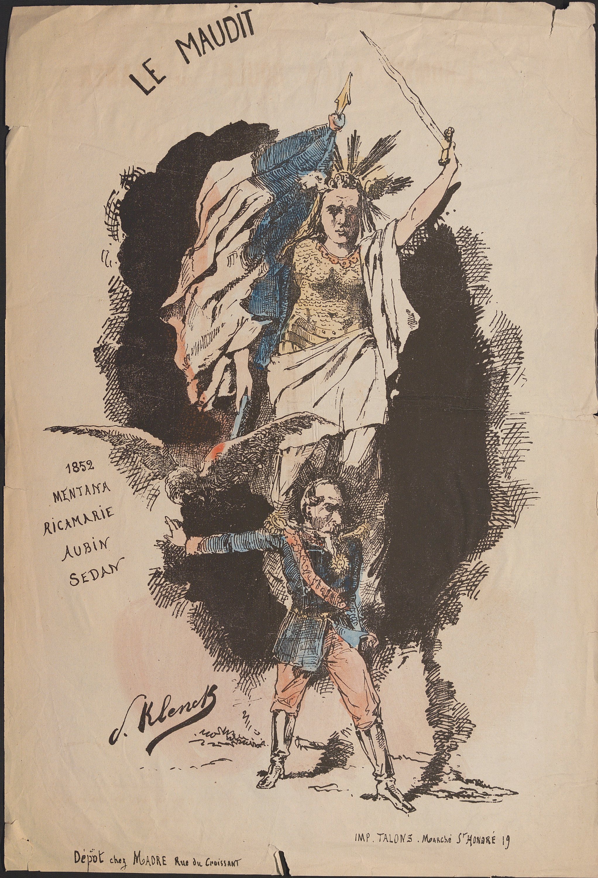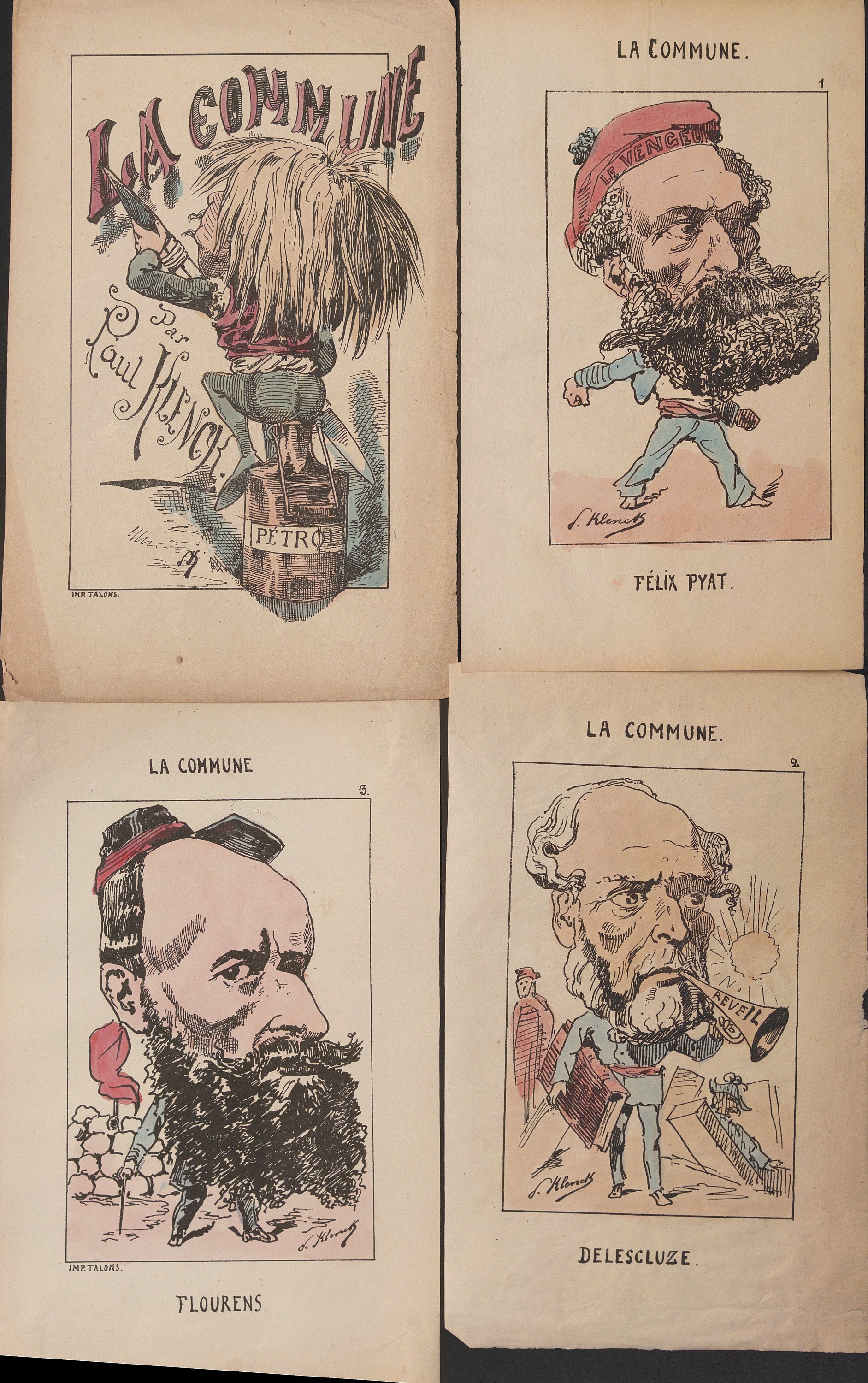 Le plan Trochu (document historique) , Badinguet gendarme, 2 ex. (1 en N&B et 1 en couleurs), 34,5 x 26 et 32,5 x 26 cm ; Restauration pontificale, plan de Charrette (en N&B) ; La Résurrection ; Versailles ; Le père Thiers (petites déchirures) ; Le paladin paladines ; Le Nouveau Mangin (petit mque en marge) ; Une séance à la Chambre ; La famille Badingue ou les derniers beaux jours (en N&B) (petites déchirures en marge) ; Le faussaire (petite déchirure) ; Un mauvais rêve du Père Guillaume ; La St Guillaume ; La Boue ; Le Maudit, 43,5 x 30 cm (petits déf.) ; Monseigneur Darboy archevêque de Paris assassiné ; La France trahie: Vous pouvez entrer il dort ; 29e proclamation désespérée du Fou Guillaume , 44,5 x 29 cm (petits déf.) ; Garibaldi approvisionne son armée ; Les premiers exploits de Bonaparte ; Souscription républicaine ; La force lutte avec le droit ; Qui aime bien châtie bien (en N&B) ; Nos sauveurs!... (en N&B) ; Les Prussiens après l’attaque, venez donc goûter ; Les Prussiens après l’attaque, Bataille du ; Augusta monte à sa tour, Guillaume ne revient pas ; Le mat de cocagne politique 1871 ; Pauv’ Badingue, Dégommé! (en N&B) ; Actualités n°1, Dernier degré de l’échelle impériale ; L’homme à la perche ; Nouvelles de Versailles ; Actualité, Le retour du vainqueur ; Actualités, l’armée de la Loire met les Prussiens en déroute (en N&B et en couleurs) ; Actualités, Père et fils ; Actualité, la Débâcle ; Le départ de la Commune et de ses communiants ; Actualités, c’est y pour l’enfant ; Actualités,; Les trois Larrons ; L’archi-monseigneur ; Les valets de l’Empire n°1 ; Hure III ; Un pétroleur ; Une pétroleuse ; Musée burlesque n°1, Faust et Marguerite ; Musée burlesque n°2, Les absents ont tort ; Musée Burlesque n°3, Condamné à ; Panorama anti-bonapartiste n°1 ;