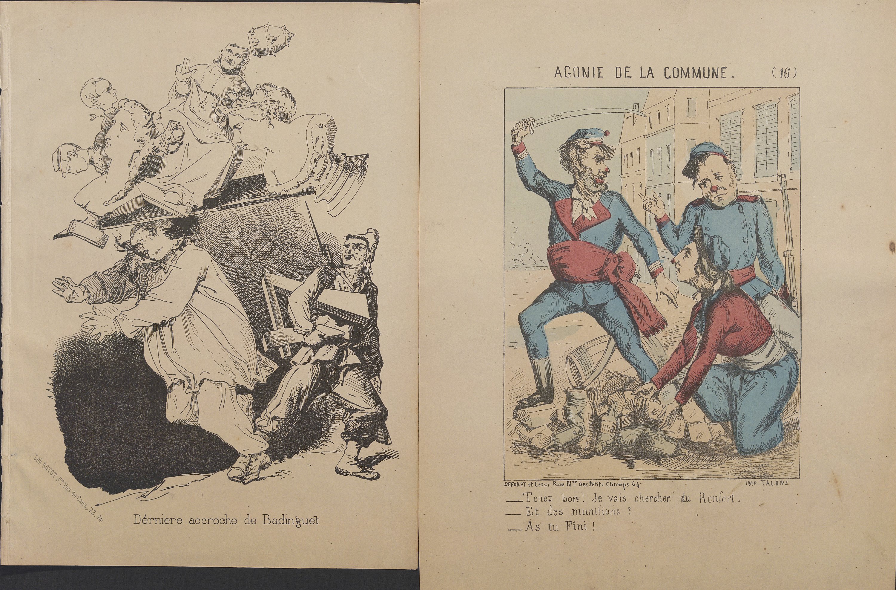 Bar (G.), 10 lithog. en couleurs: Actualités, Six d’un coup!!!..., 34,5 x 28 cm (petite déchirure en marge) ; Actualité, Samson et Dalila, 37,5 x 26,5 cm ; Actualité, L’auteur des châtiments ne connaissant pas son français , 34 x 24,5 cm ; Actualité, Mode de transport adopté par l’Exécutif , 30,5 x 28,5 cm, contrecollé ; Actualité, O Richard, O mon Roi!..., 31 x 22,5 cm ; Souvenir du siège , 29,5 x 22,5 cm, contrecollé sur feuillet épais ; Actualité, Picard avocat , 34 x 26 cm ; Actualité n°70, Excellence notre destinée , 31,5 x 23 cm ; Actualité n°71 Marche triomphale , 33,5 x 26,5 cm ; Actualité n°73, Donnez-moi le commandement de l’armée , 32 x 27,5 cm (petite déchirure en marge) ;