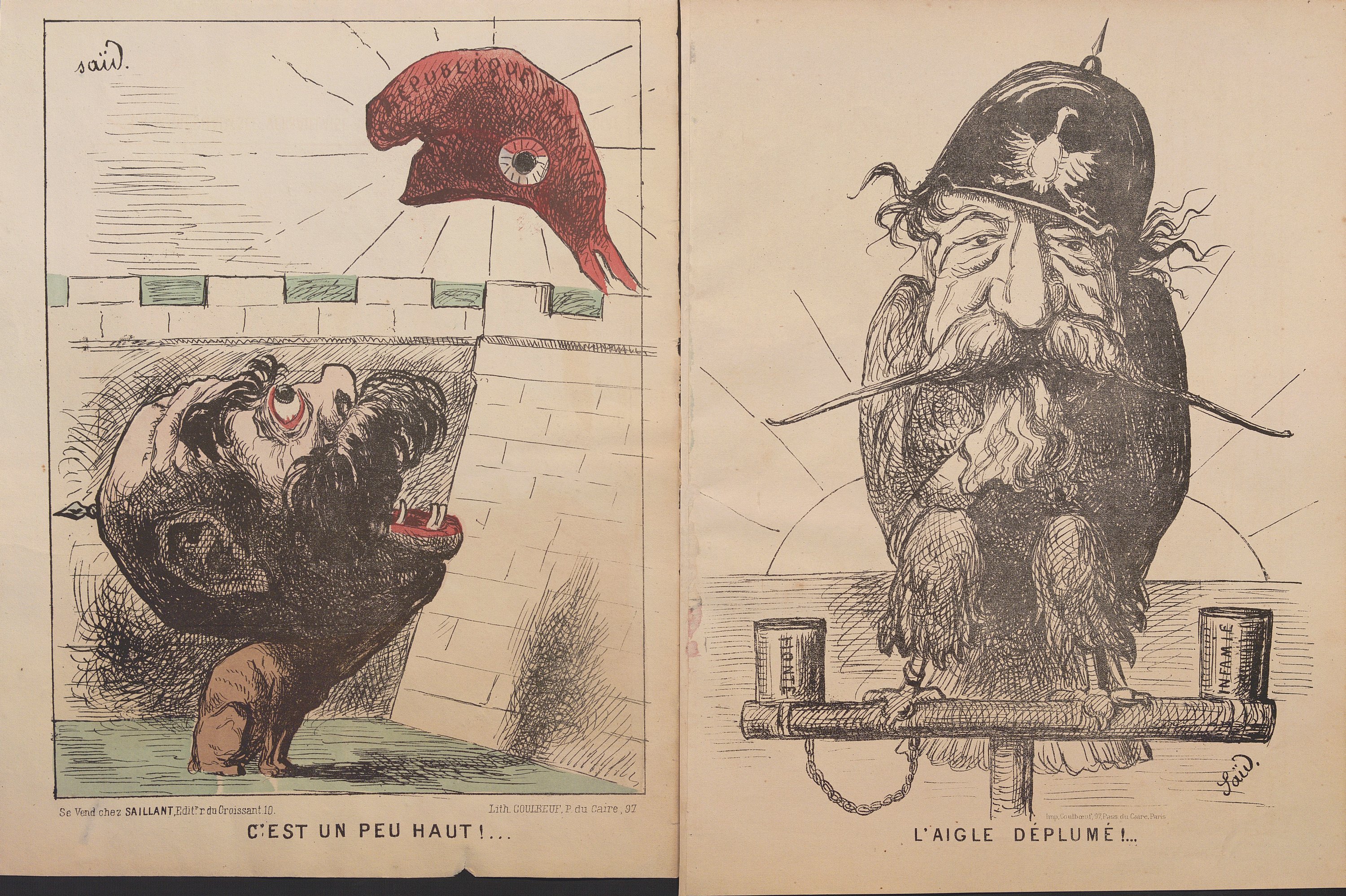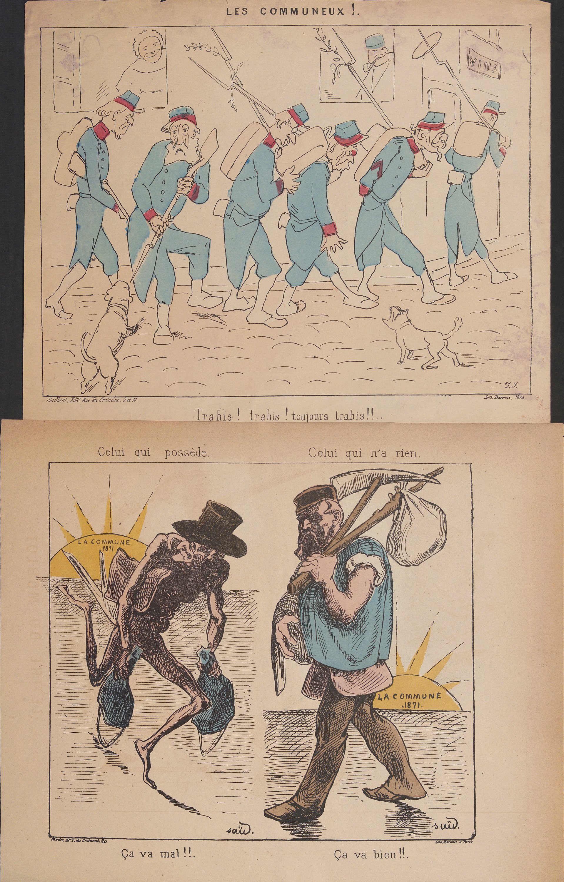 Actualités n°2, Quelle tuile!, 32,5 x 25,5 cm ; Actualités n°3, Tape dur!elle n’aurait qu’à revenir!!!, en N&B, 35 x 27 cm ; Actualité, c’est vrai que la grande Ville de Paris est maintenant en commune comme cheux nous?, 33 x 25 cm ; Actualité, Si nous causions un brin!, 34,5 x 27 cm (petite déchirure) ; Versailles paris, embrassons nous et que ça finisse, 34 x 27,5 cm ; Celui qui possède, celui qui n’a rien , 27,5 x 33,5 cm ; Hommes politiques, le dessert de M. Thiers, (2 ex.), env. 34 x 26 cm ; Les 2 font la paire , 35,5 x 28 cm (petits déf.) ; L’homme-Sedan , 37,5 x 28 cm ; L’aigle déplumé!, en N&B, 34 x 25,5 cm ; L’ogre de Prusse , 31,5 x 23,5 cm ; C’est un peu haut!, 33,5 x 26 cm ; Les Communeux!, Trahis! Trahis! toujours trahis!!, 25,5 x 31,5 cm ; Les angoisses de Félix Pyat, contrecollé sur feuillet, 35 x 27,5 cm.