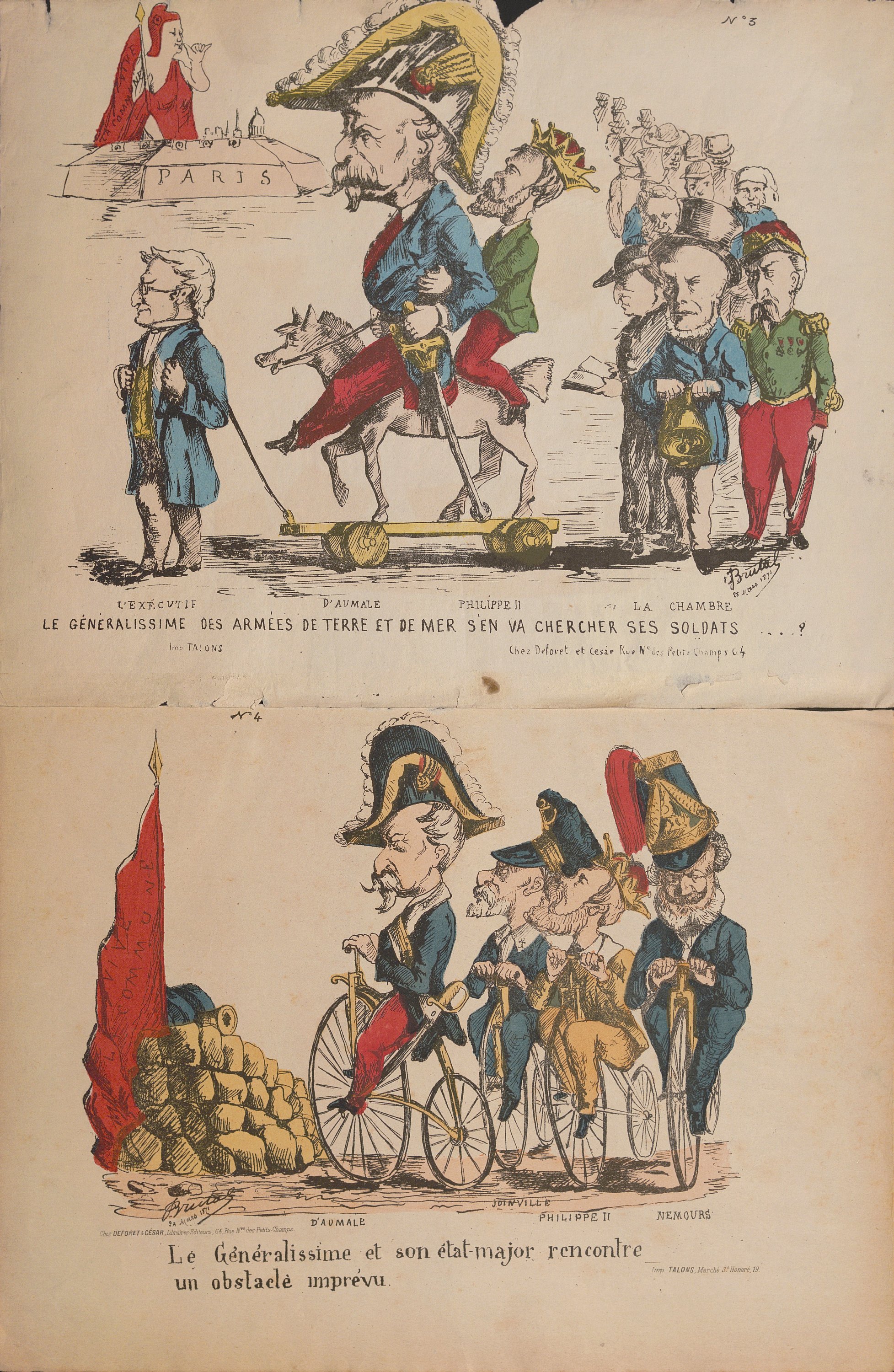 Achille Belloguet: Pilori-Eternel, 3 lith. en couleurs, série complète, env. 32 x 23 cm ; Phrénologie-Topographie de la France 1871, 2 lith. en couleurs, série complète, 36,5 x 27,5 cm (petite déchirure en marge, froissures) ; Fantaisies satiriques, 4 lith. en couleurs, série complète, env. 33 x 27 cm (petit mque en coin) ;