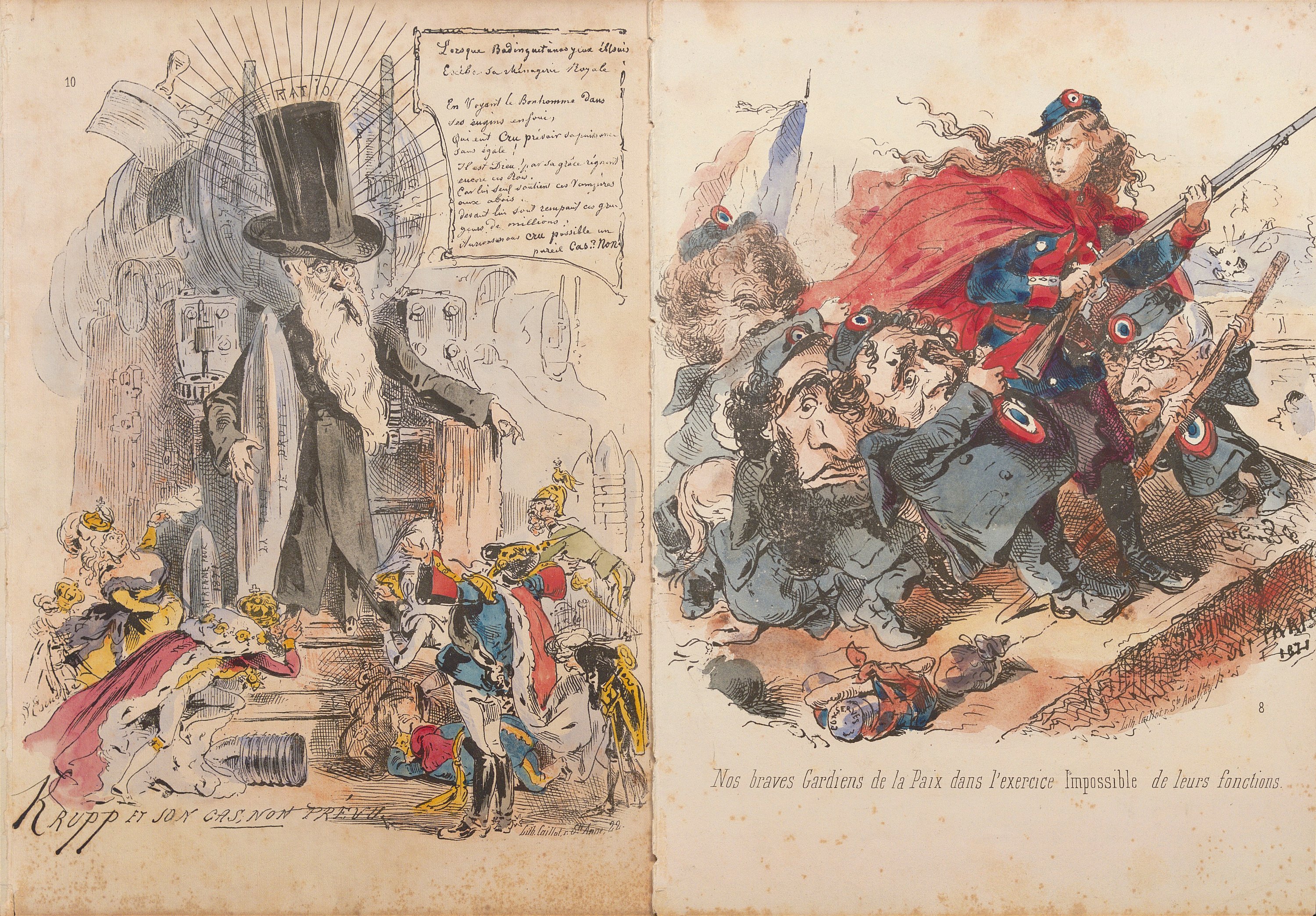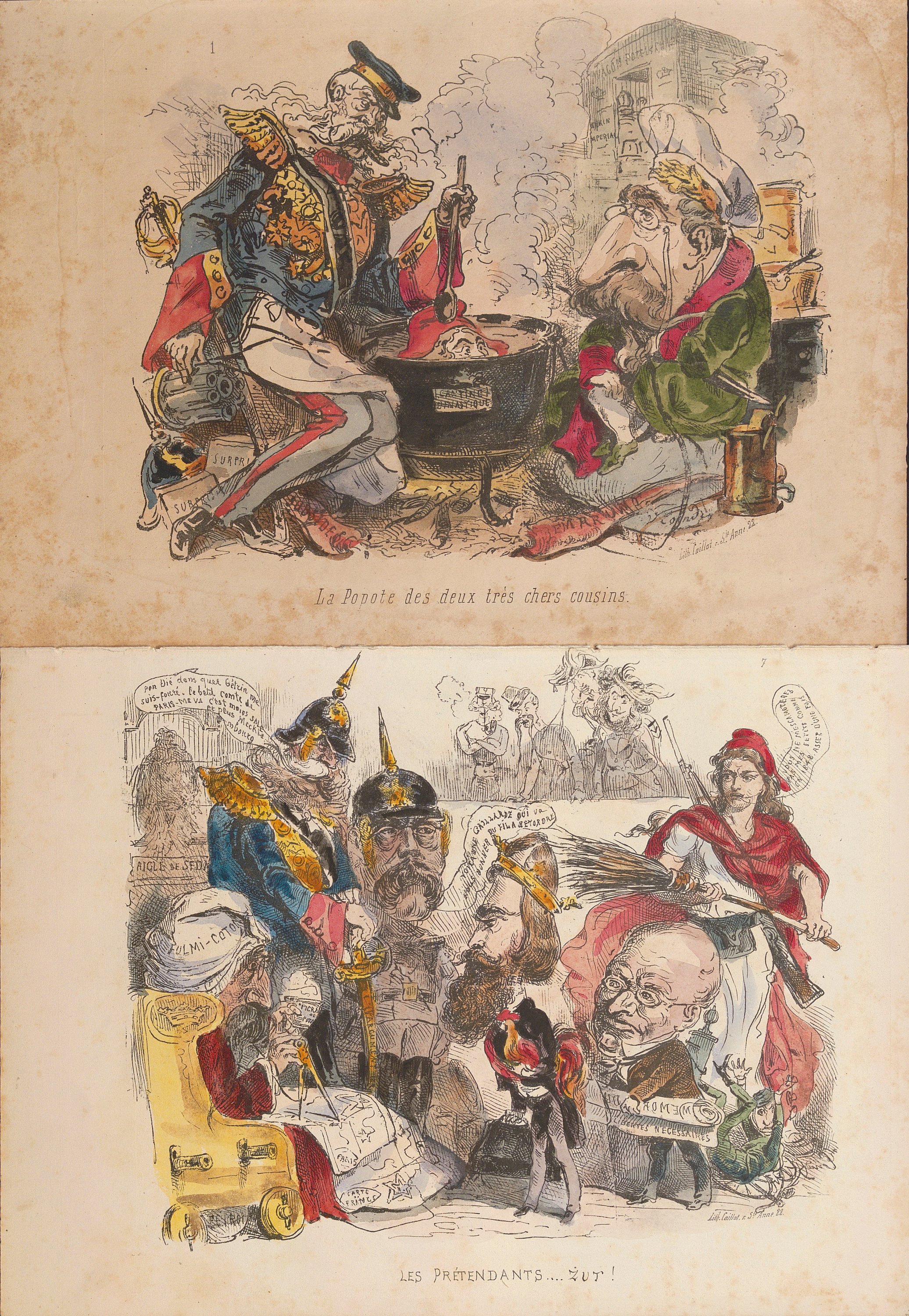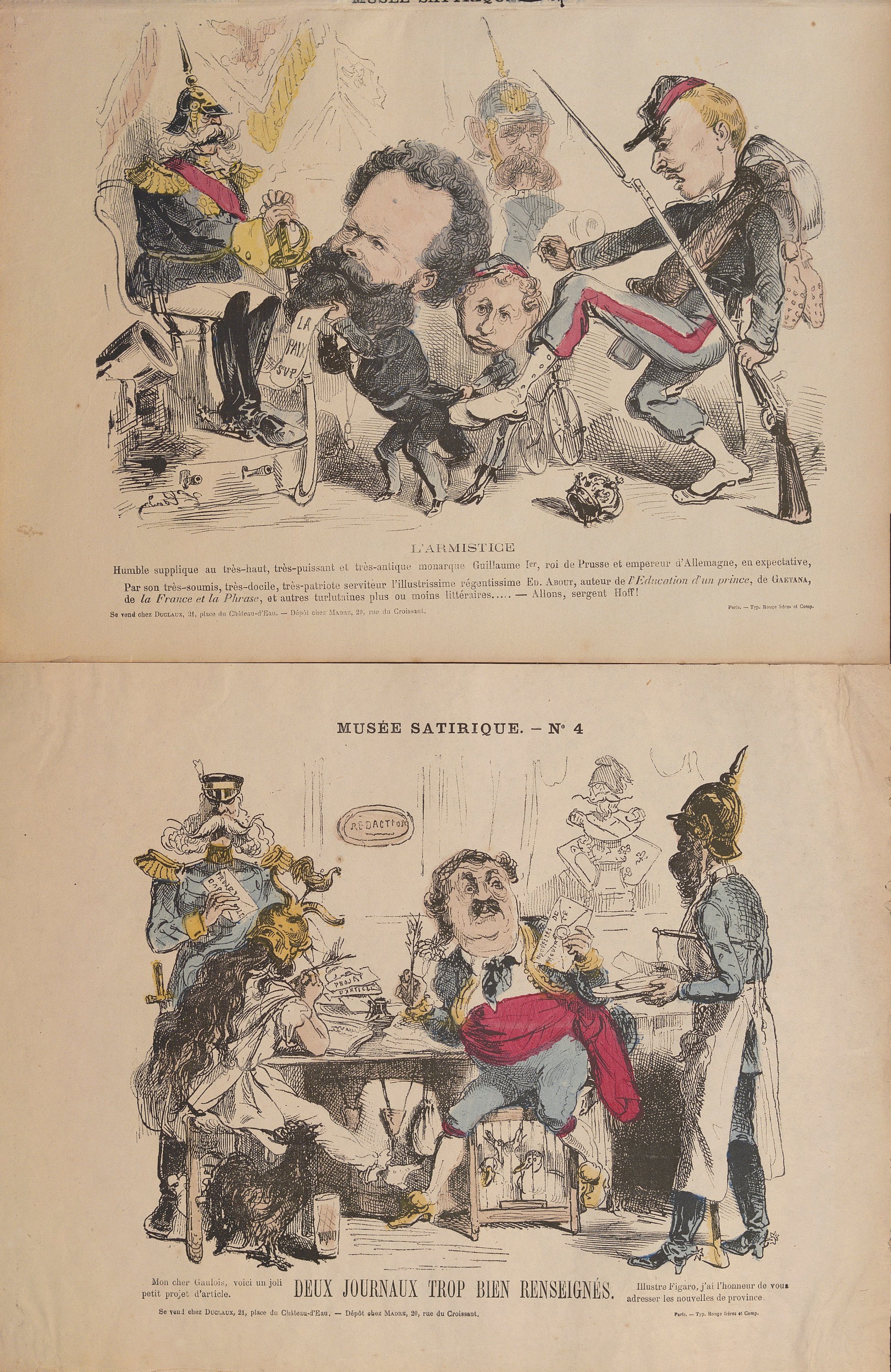 Série du Musée satirique: Elevées sur les genoux de l’Eglise , 34,5 x 26 cm (petite déchirure), n°2 L’Armistice, 26 x 34,5 cm (marge courte), n°3 Douceur évangélique de l’éducation congréganiste, 34 x 25 cm, contrecollé sur feuillet épais ; n°4 Deux journaux trop bien renseignés, 27,5 x 35 cm, contrecollé sur feuillet (plis), n° 5 Ho! Franc Picard, 35 x 26 cm (petite déchirure, plis) ; La popote des deux très chers cousins, 23,5 x 31 cm (rousseurs) ; Nos ravitaillements, 32 x 23 cm (rouss.) ; La plus petite trouée , 32 x 23 cm (rouss.) ; Les Prétendants zut!, 23,5 x 32 cm ; Nos braves gardiens de la Paix , 32 x 23 cm (rouss.) ; Papa Guillaume à son Augusta, 32,5 x 21,5 cm ; Krupp et son cas non prévu, 32 x 23,5 cm (rouss.) ; Leur tient-il la dragée haute!!, 32 x 23,5 cm ; Les pamphlets illustrés n°2 Les secrets dévoilés du cabinet noir, 4 pp. 34 x 26,5 cm (plis).