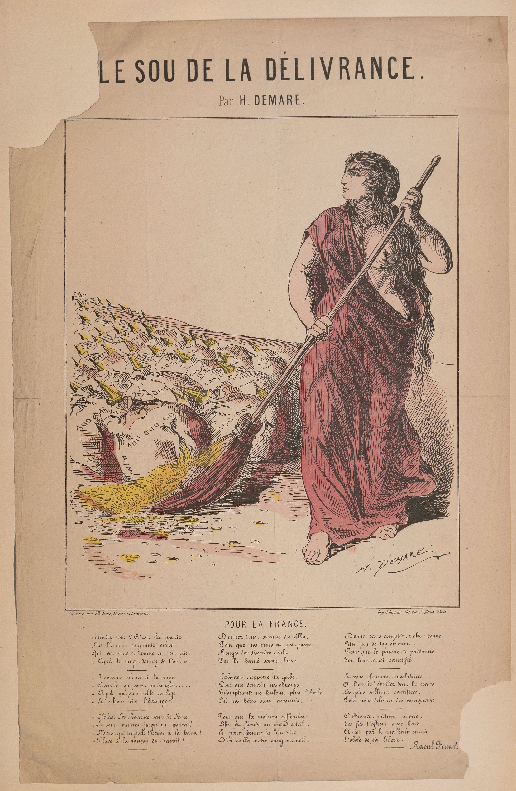 Le sou de la délivrance [chanson], 50 x 32 cm, contrecollé sur feuillet épais (mques en coins) ; Le Pilori, l’homme au plan!!!..., 36,5 x 27,5 cm, contrecollé sur feuillet épais ; Actualité, La grande colère du père Duchêne, 36 x 27 cm ; Une page d’histoire, 28,5 x 38 cm ; Une page d’histoire , 37,5 x 26 cm ; A Saint Denis les drôlesses , 36 x 27 cm ; Le blagorama, Sa dernière ressource!!, 36 x 27,5 cm, contrecollé sur feuillet épais ; Le blagorama, Temandez!! la grante entrée driomphale de Sa Machesté le roi Pendule , 45 x 54 cm, contrecollé sur feuillets épais (déchirures marginales, pli central) ; A travers Paris, Epicier à Beaucaire, 31 x 21 cm ; Nos vainqueurs n°3 , 32 x 24 cm (petite déchirure et tâche en marge) ; série Communardiana, n°1-7, 10, 13 et 15, 29,5 x 22 cm.
