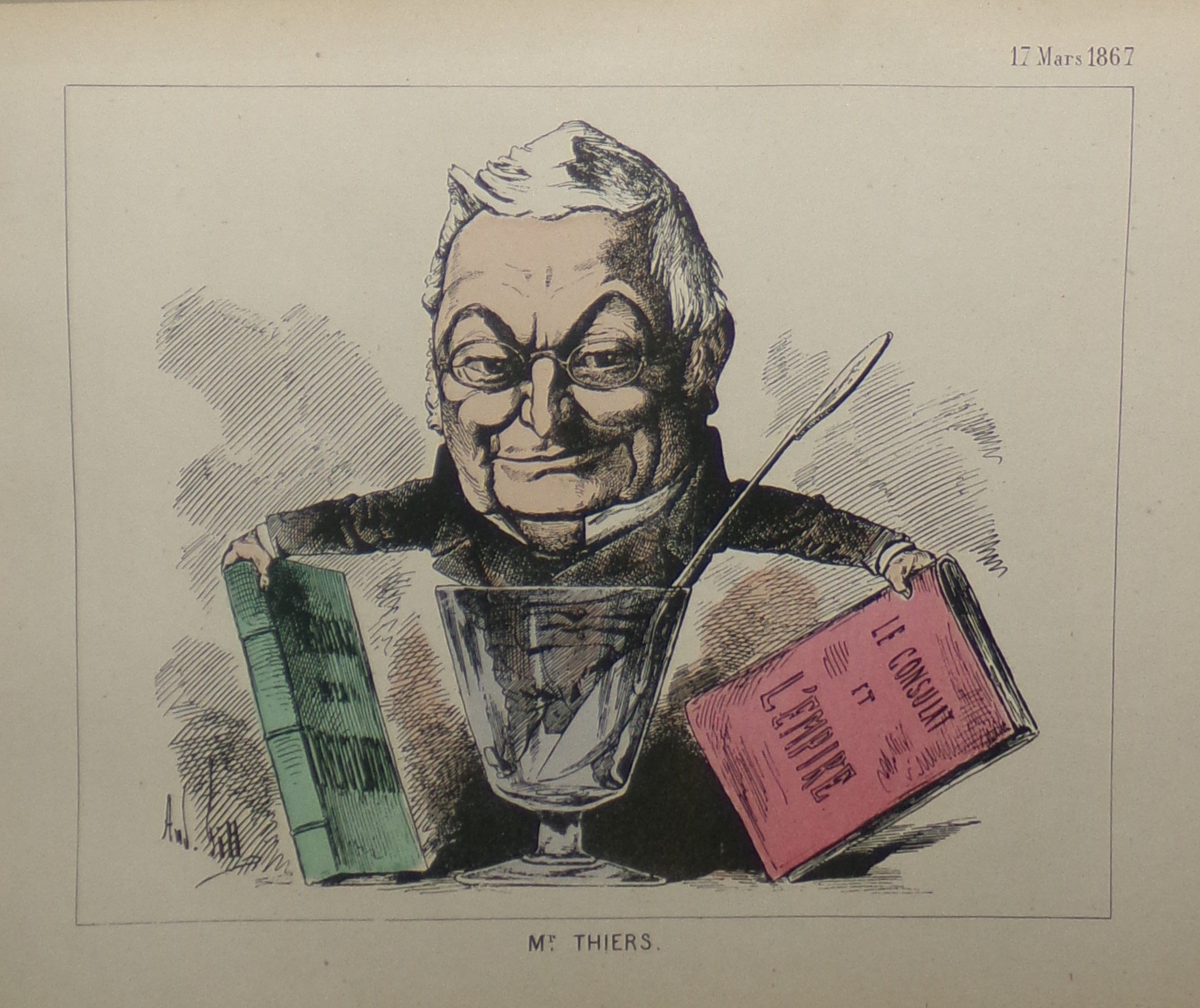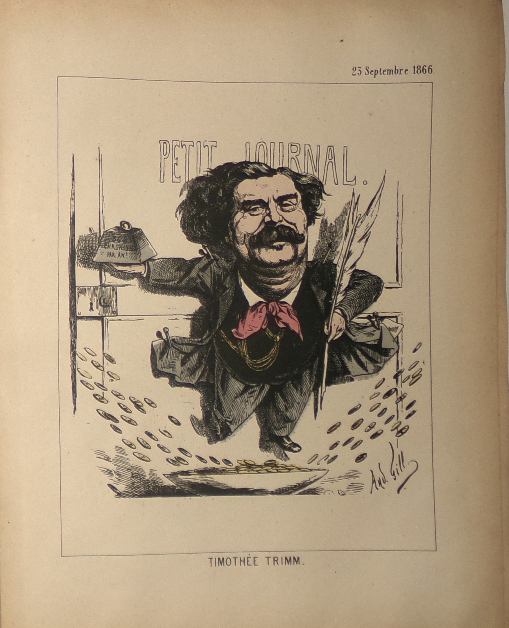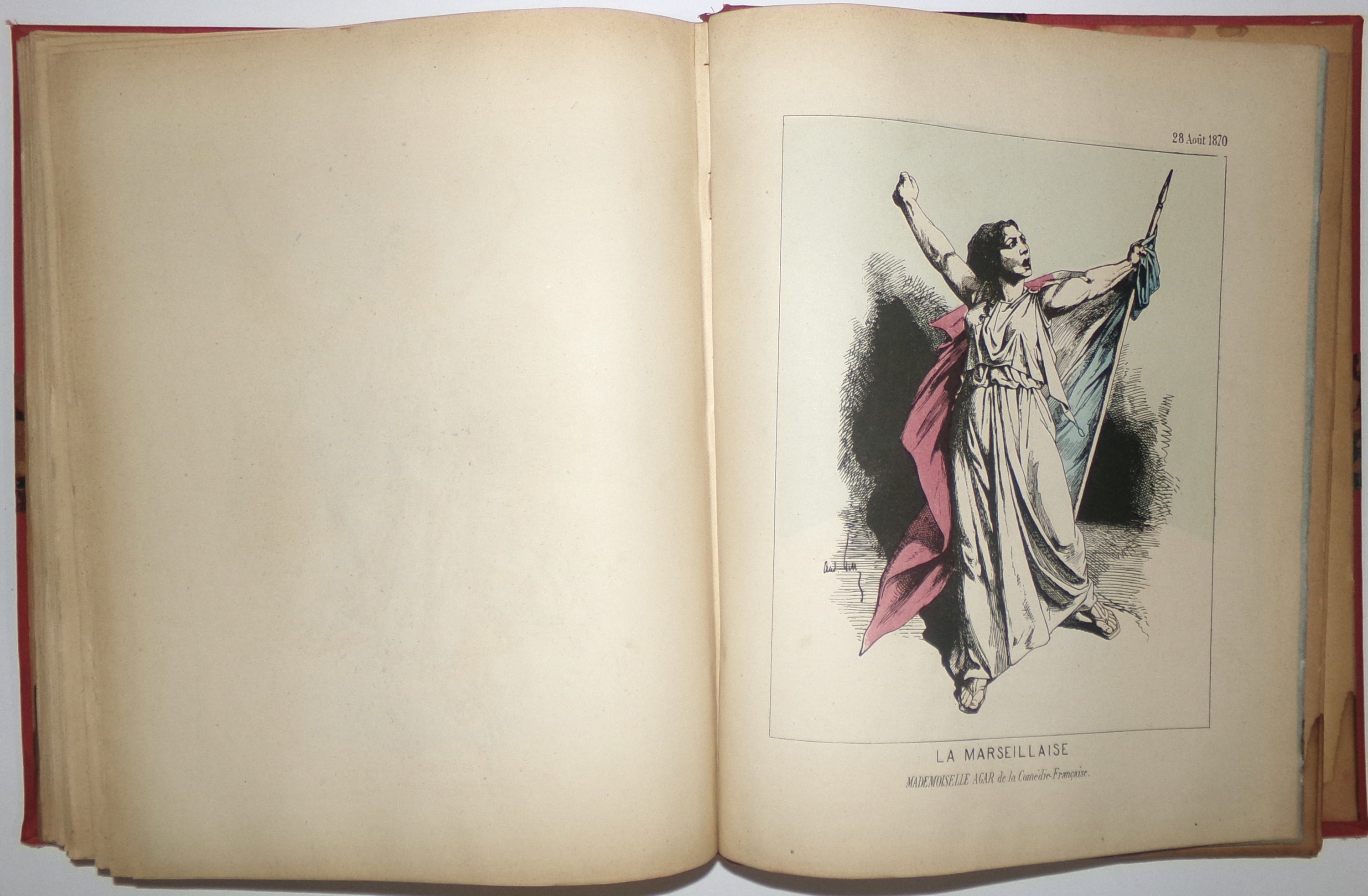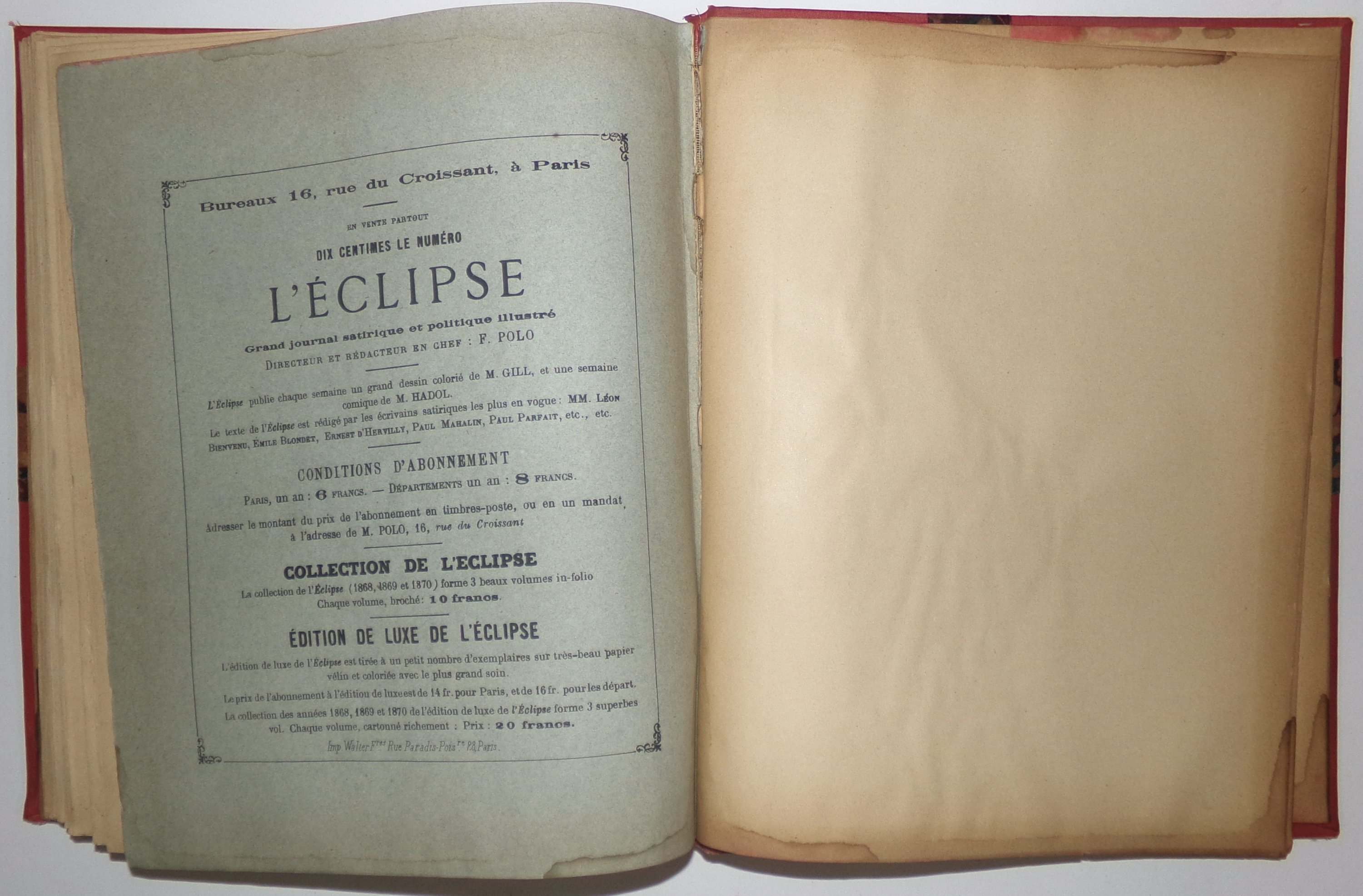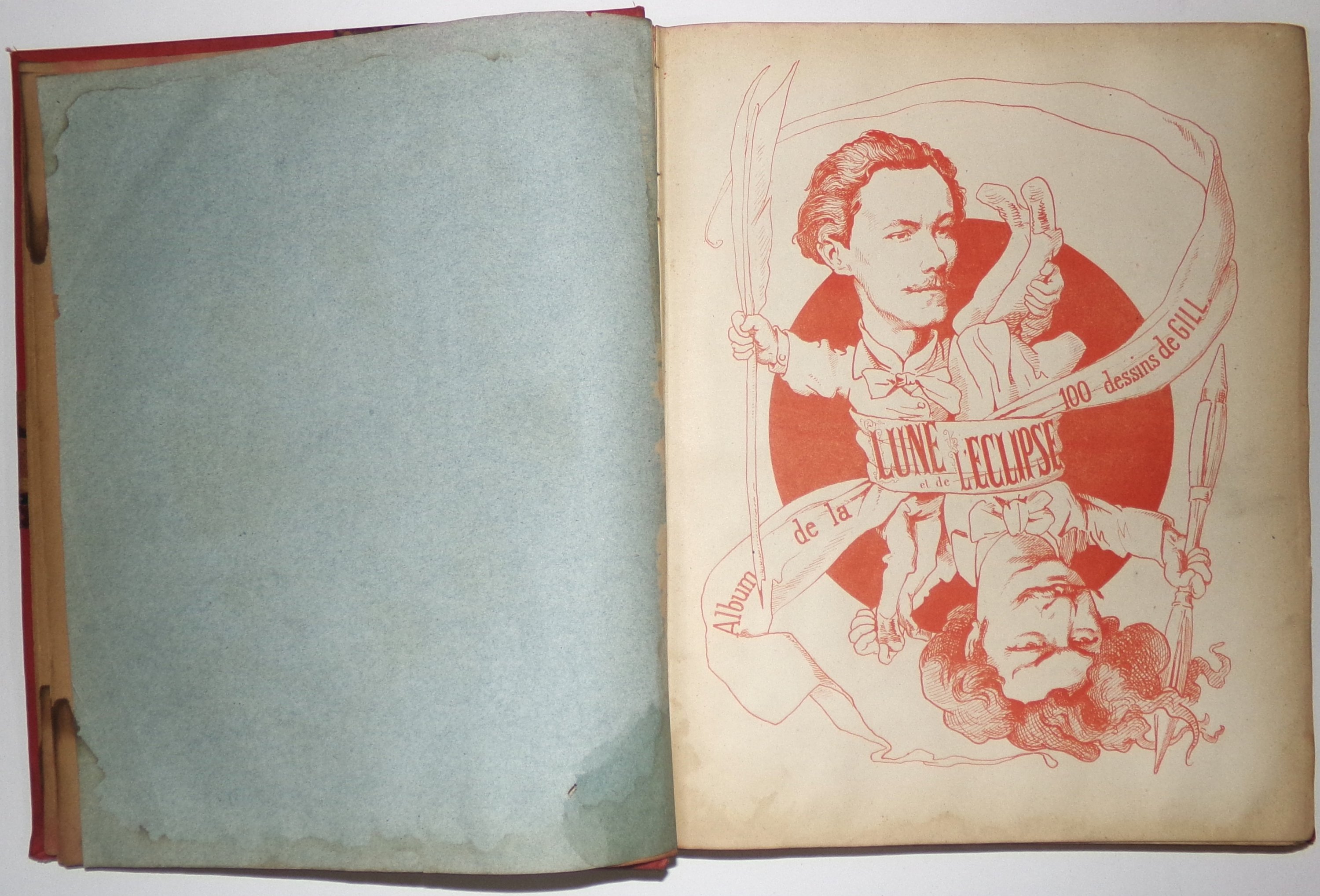 Album de La Lune et de l’Eclipse - 100 dessins de Gill. Paris, rue du Croissant, 16, [1872]. Rel. in-4 ½ toile (mouillures). Réunion de 100 dessins, coloriés et réduits ; Débute par le portrait de Timothée Trimm (23 septembre 1866) et se termine par « La Marseillaise » (28 août 1870) dont Gustave Courbet, Jules Ferry, Victor Hugo, André Gill (autoportrait), Rossini, Offenbach, Nadar, Bismarck, Jules Favre, Richard Wagner, Gustave Doré, etc. Double page de couv. bleutée (mouillures, rest.) et page de titre.