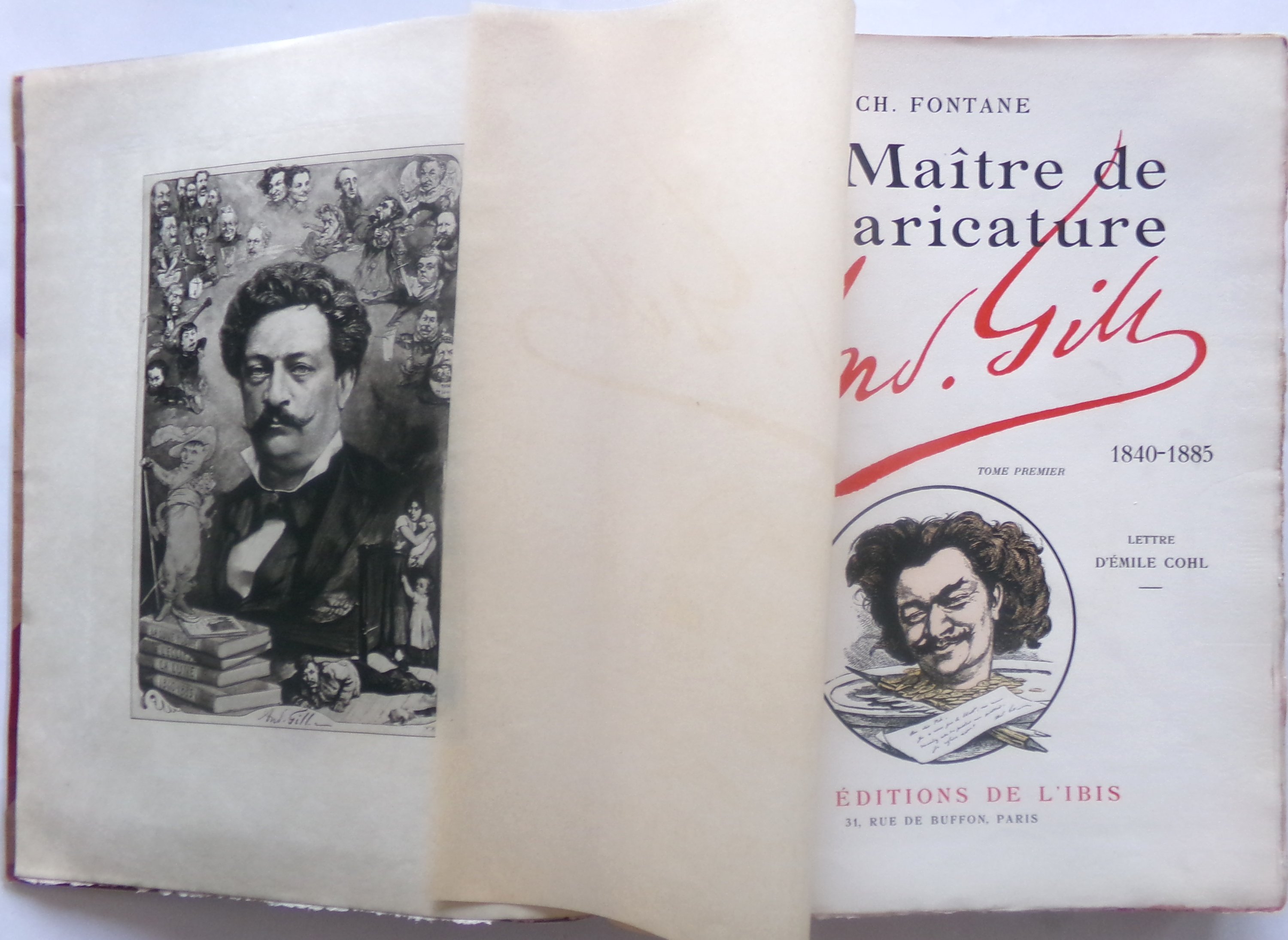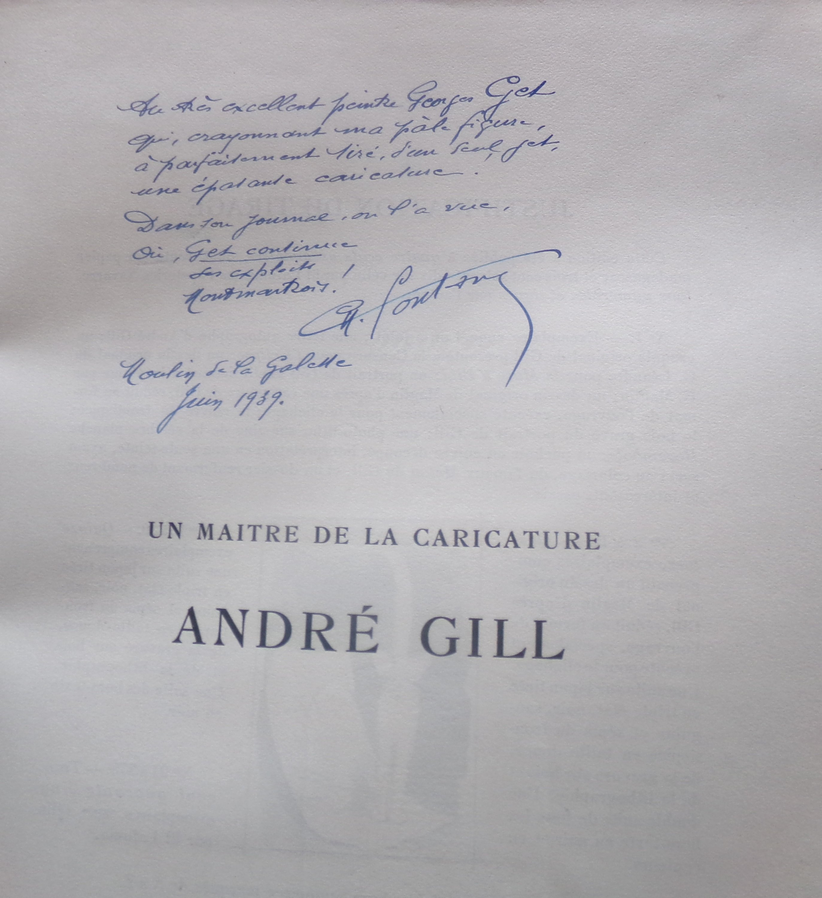 Charles Fontane, Un Maître de la Caricature, André Gill, préface de Ch. Léandre, lettres d’Emile Cohl. 2 tomes en 2 vol. Paris, aux Editions de L’Ibis, 1927/28. In-4 broch. (couv. usées et tâchées, dos fendus et détaché pour le 2nd tome), 311 et 344 p. Intérieur propre. Avec envoi dédicacé, daté et signé au peintre montmartrois Georges Get ;
