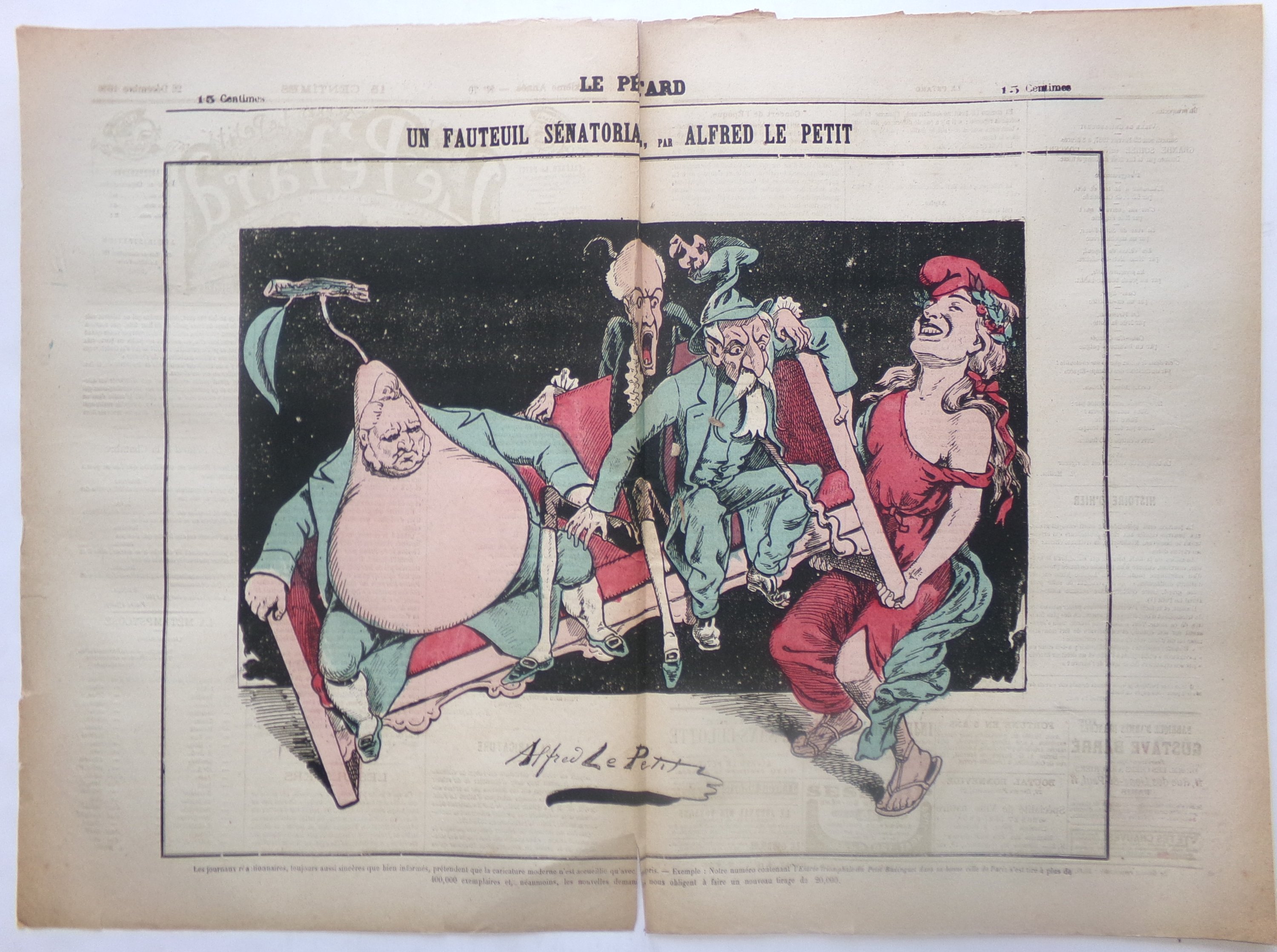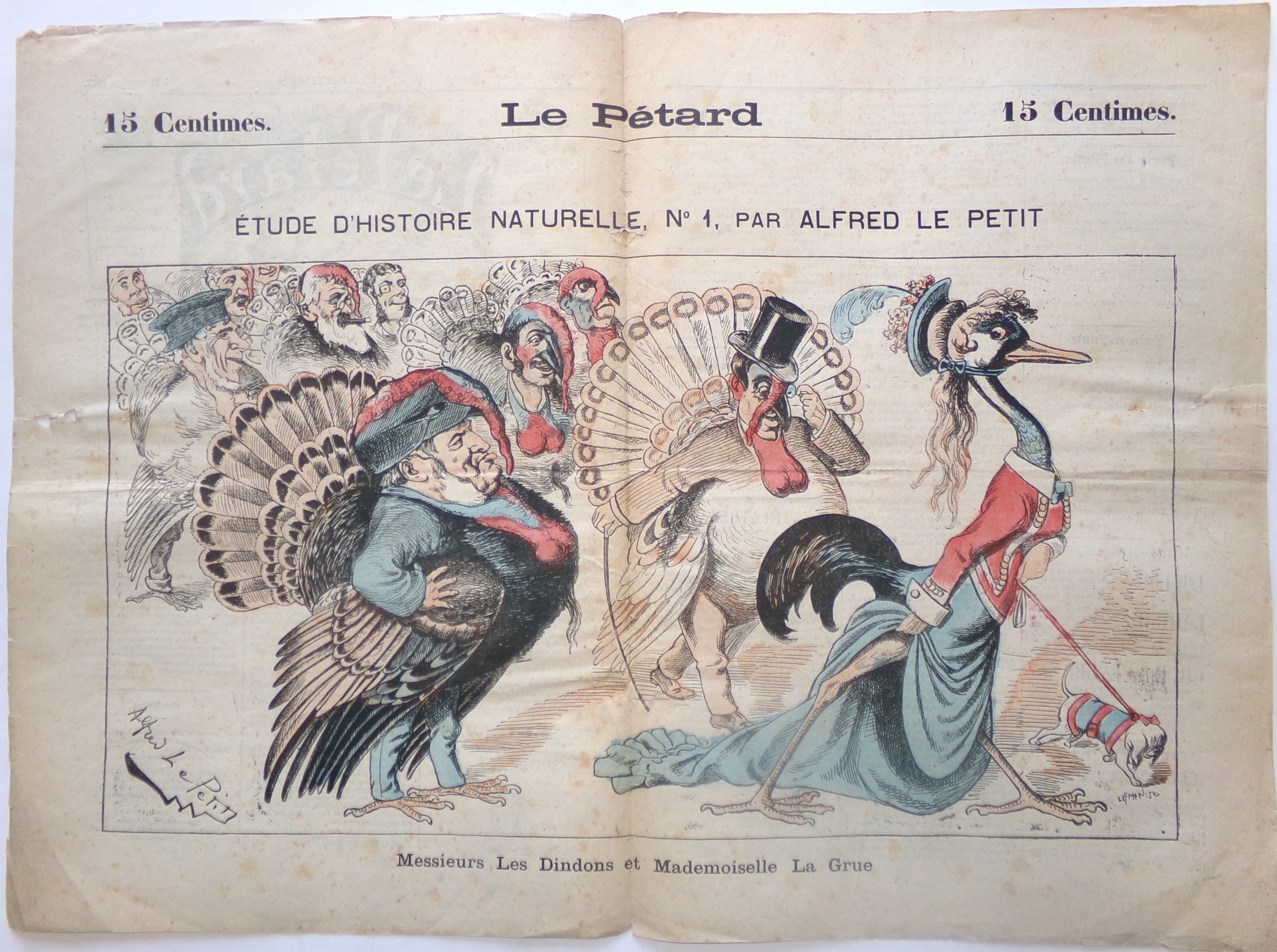 Le Pétard, 85 numéros (avec des doubles) entre le n°2 (1er juillet 1877) et n°99. Journal satirique fait entièrement par Alfred Le Petit qui est paru régulièrement jusqu’au n°97 (1879). Il lui a fallu ensuite attendre 9 ans pour publier les 15 derniers numéros qui se termine au n°112 d’août 1888. Peu courant. Etat moyen à T.B.E.