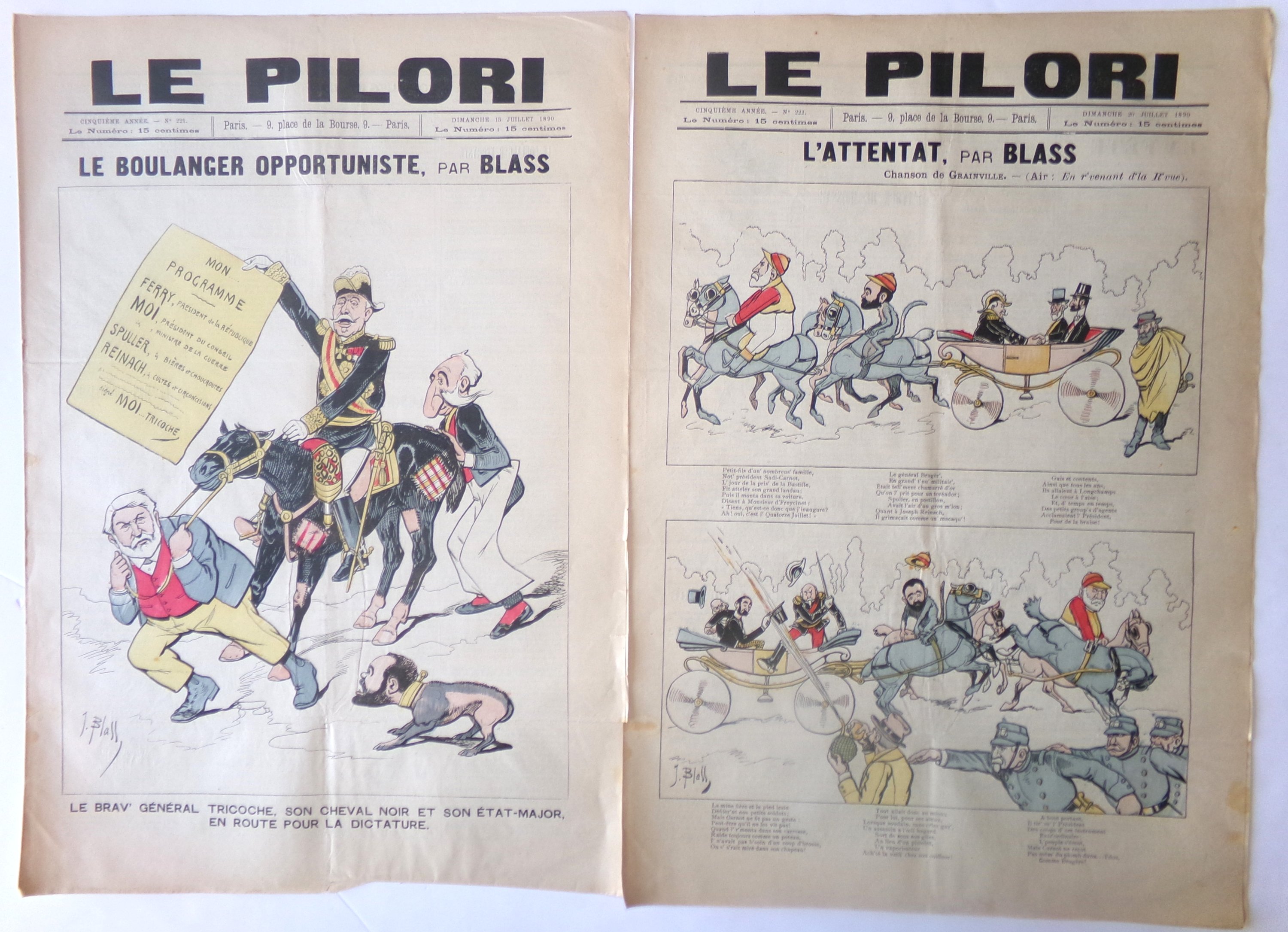 Hebdomadaire satirique fondé par le journaliste bonapartiste Armand Mariotte, Le Pilori, présentant à la Une une grande caricature illustrée par Blass, Vignola et divers, est très vite confronté à plusieurs procès. Deux mois à peine après sa création, l'un de ses articles, intitulé « Vive le coup d’Etat », vaut à son rédacteur en chef d'être poursuivi pour « provocation au pillage et à commettre un attentat ayant pour but de changer la forme du gouvernement ». Clérical, antisémite, antimaçonnique et nationaliste, Le Pilori soutient le mouvement boulangiste en 1889.