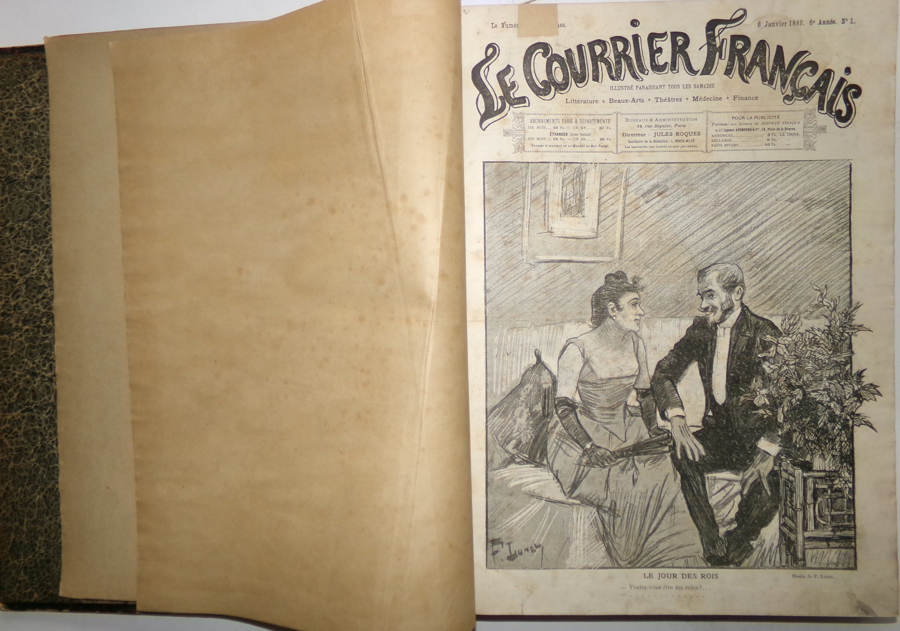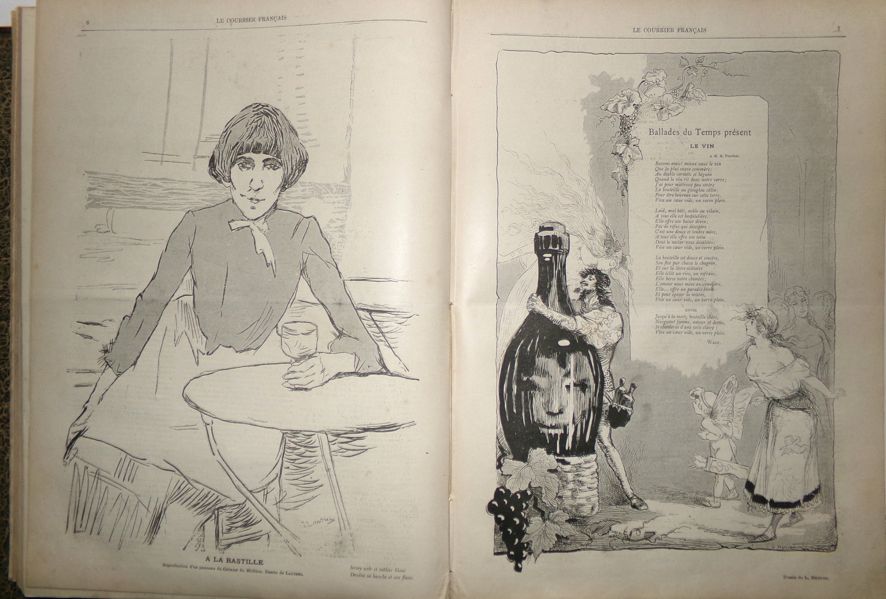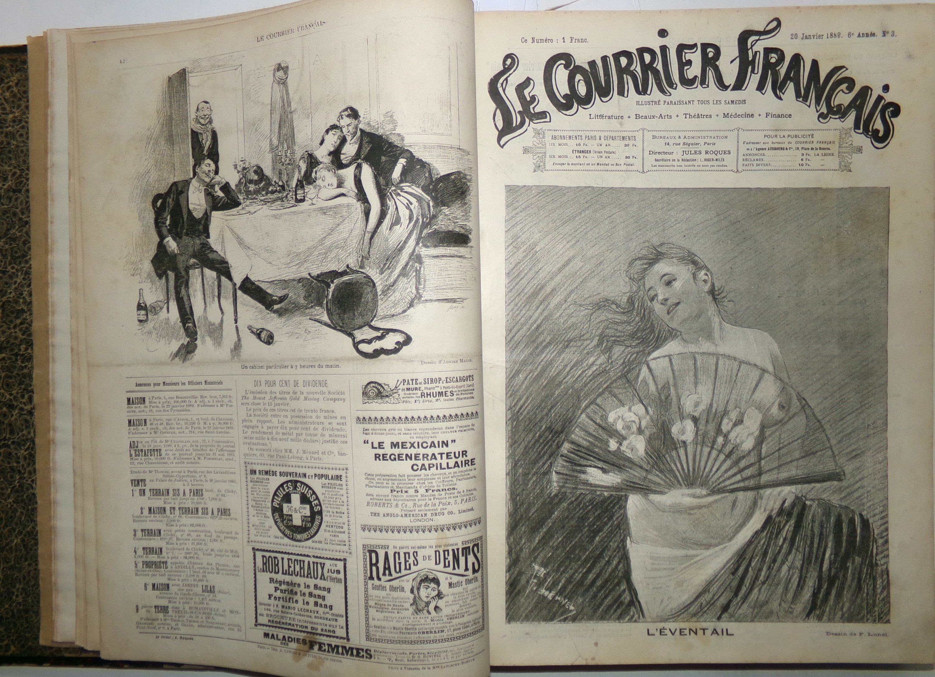 « Fondé par le publicitaire Jules Roques en novembre 1884, Le Courrier Français est un « hebdomadaire illustré humoristique, littéraire et artistique », issus de la sociabilité montmartroise des années 1880. Nous sommes donc au cœur de ce que l’on appelle improprement la « Bohème Montmartroise », même si les bureaux du journal sont au 14 rue Séguier. Sa dimension Montmartroise, outre la géographie de ses lieux d’élection et du séjour de ses auteurs, réside aussi dans les dessins qui évoquent régulièrement la population contrastée de la Butte (artistes, modèles, lingères, bourgeois, employés, ouvriers travaillant sur le chantier du Sacré Cœur), moulins, bals, cabarets artistiques et bouges infâmes, assommoirs, les salles du boulevard Rochechouart, Moulin Rouge et surtout l’Elysée Montmartre. » (Extrait « Le Courrier Français » par Laurent Bihl, 2007)