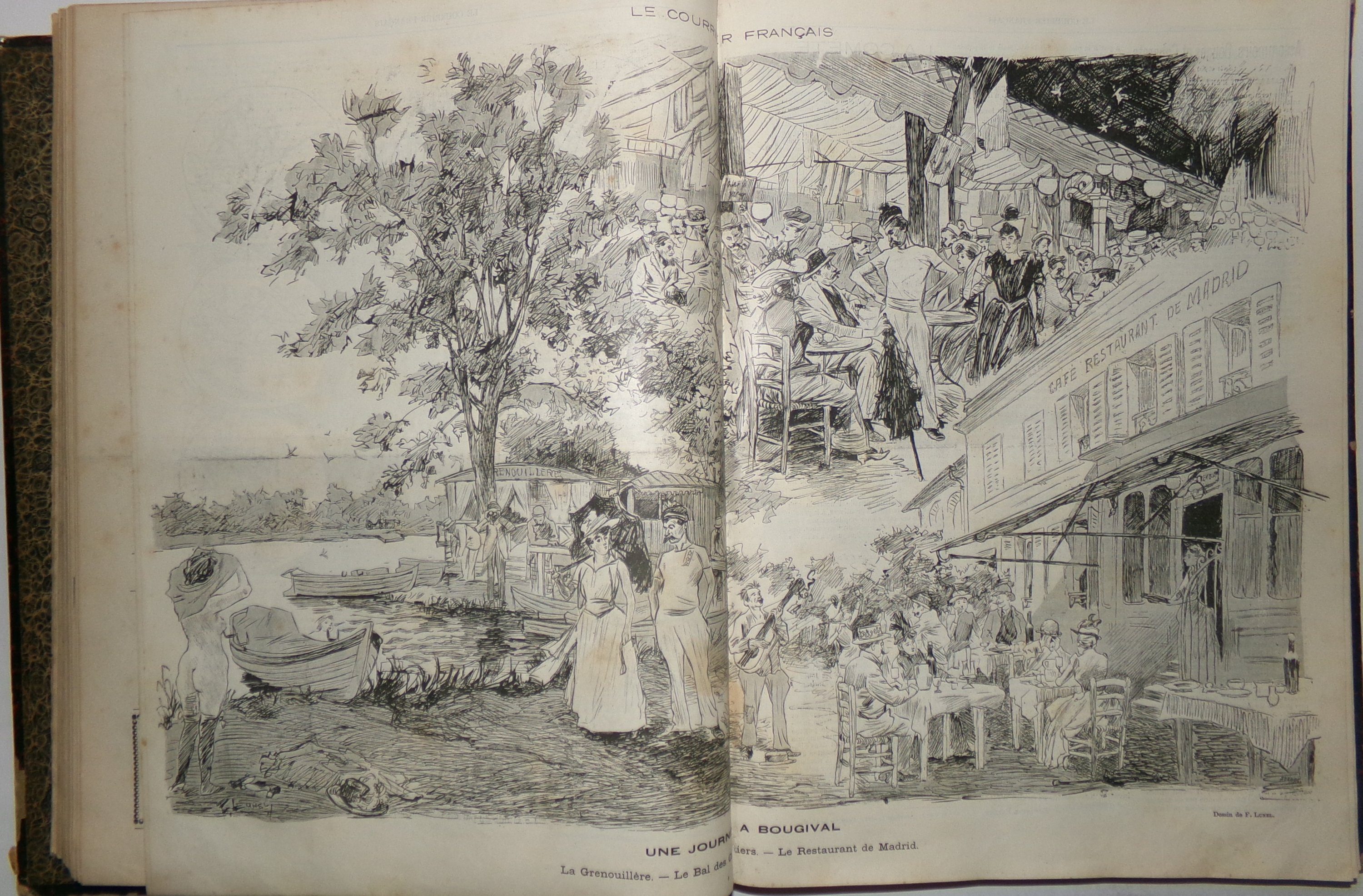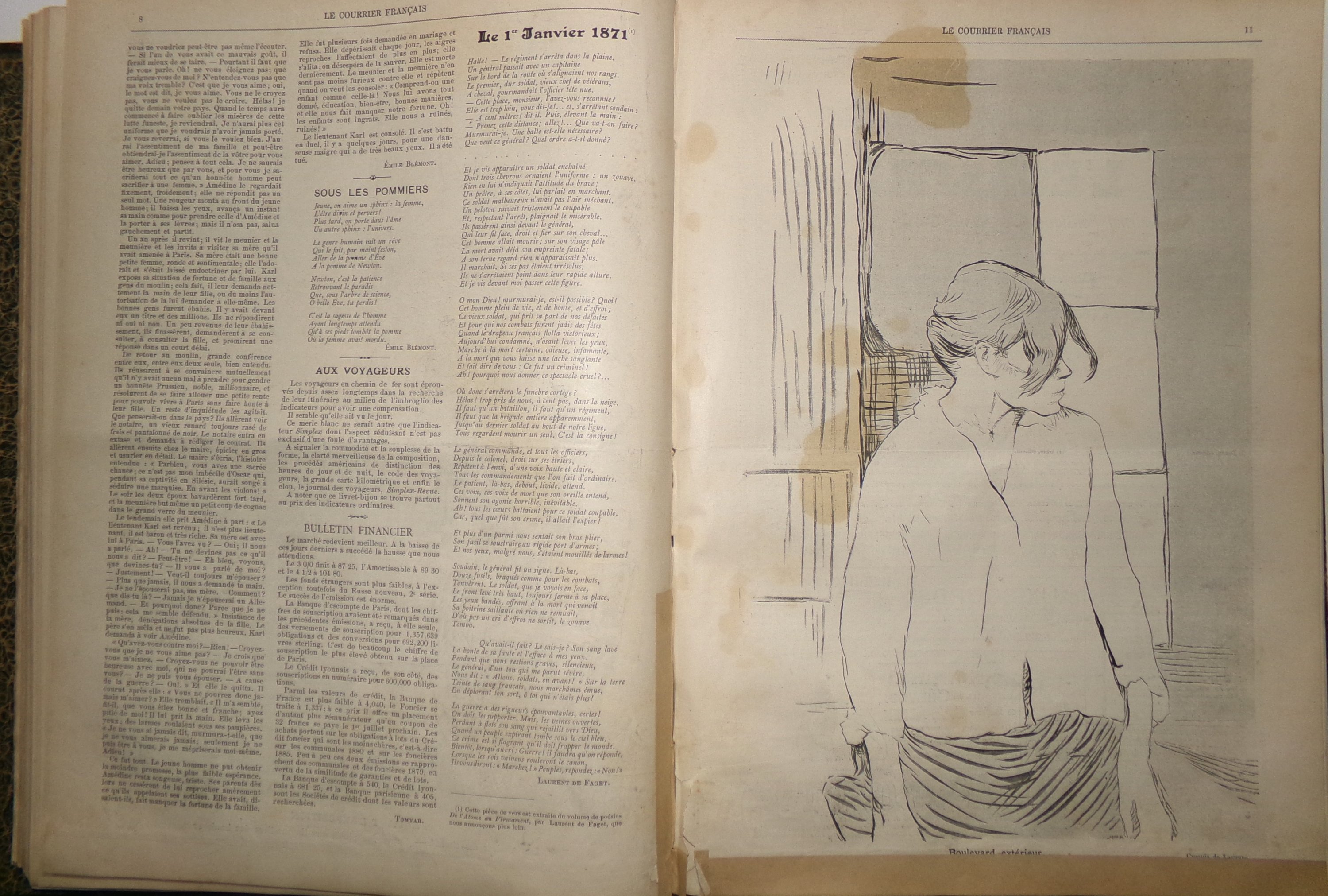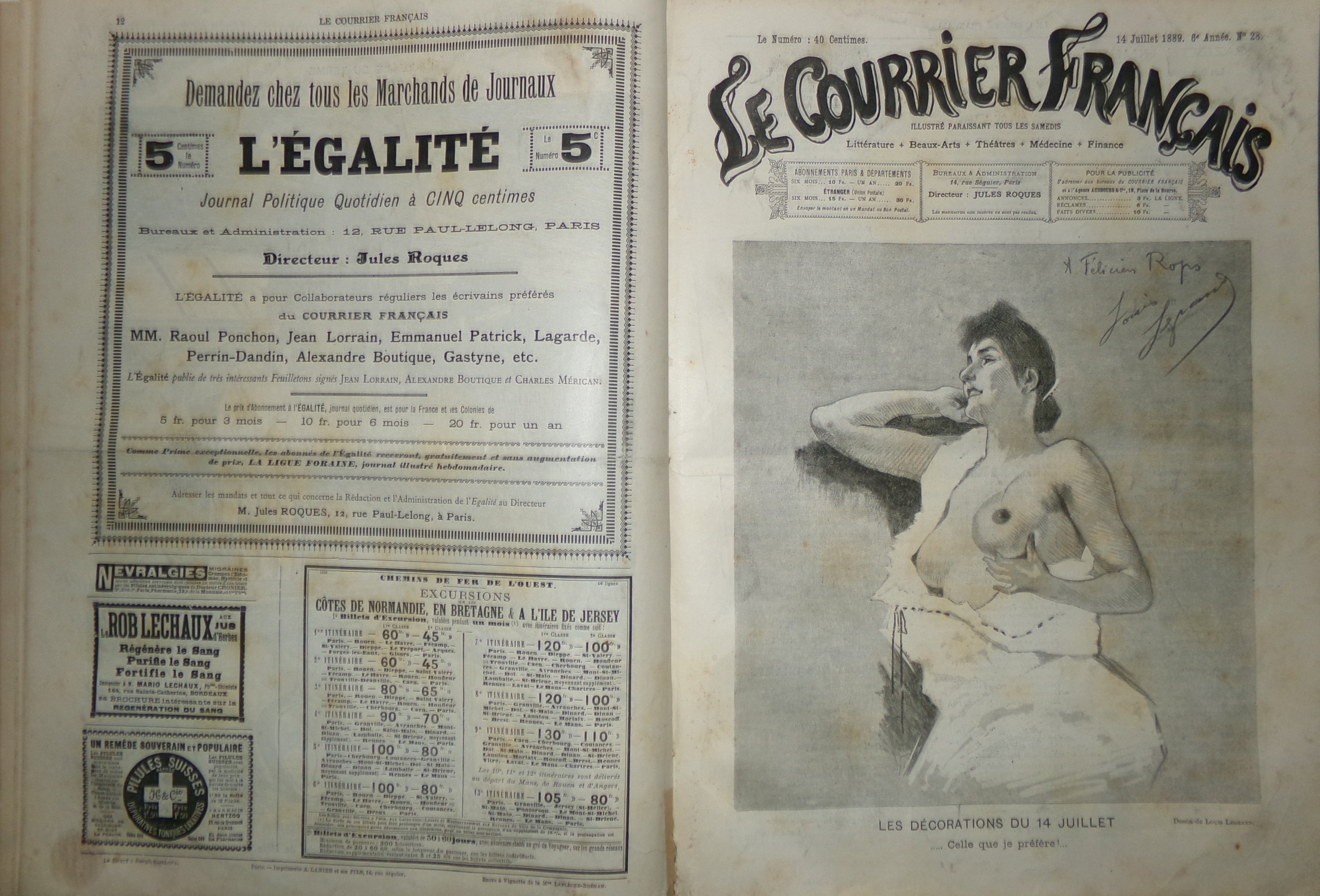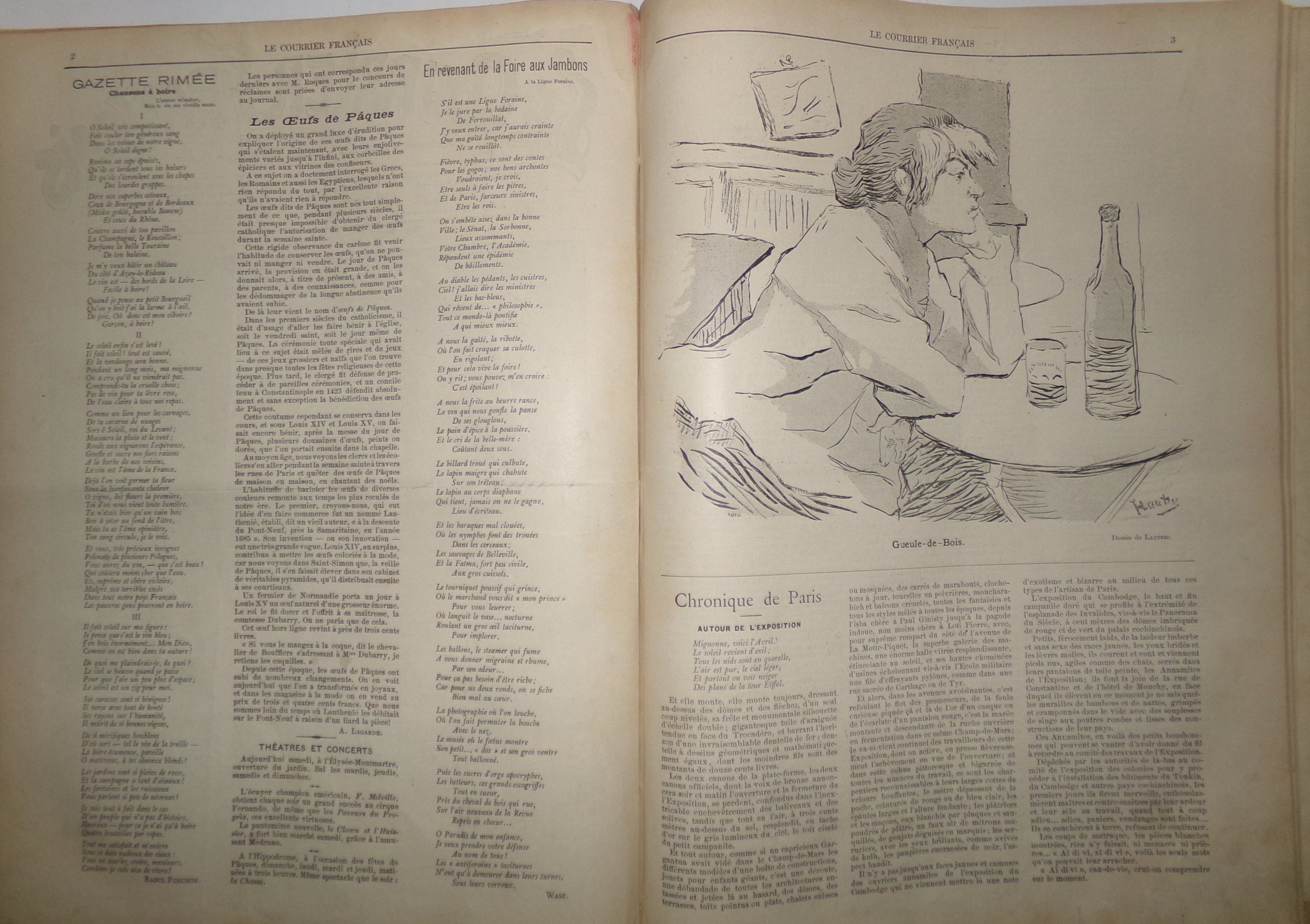 « Fondé par le publicitaire Jules Roques en novembre 1884, Le Courrier Français est un « hebdomadaire illustré humoristique, littéraire et artistique », issus de la sociabilité montmartroise des années 1880. Nous sommes donc au cœur de ce que l’on appelle improprement la « Bohème Montmartroise », même si les bureaux du journal sont au 14 rue Séguier. Sa dimension Montmartroise, outre la géographie de ses lieux d’élection et du séjour de ses auteurs, réside aussi dans les dessins qui évoquent régulièrement la population contrastée de la Butte (artistes, modèles, lingères, bourgeois, employés, ouvriers travaillant sur le chantier du Sacré Cœur), moulins, bals, cabarets artistiques et bouges infâmes, assommoirs, les salles du boulevard Rochechouart, Moulin Rouge et surtout l’Elysée Montmartre. » (Extrait « Le Courrier Français » par Laurent Bihl, 2007)