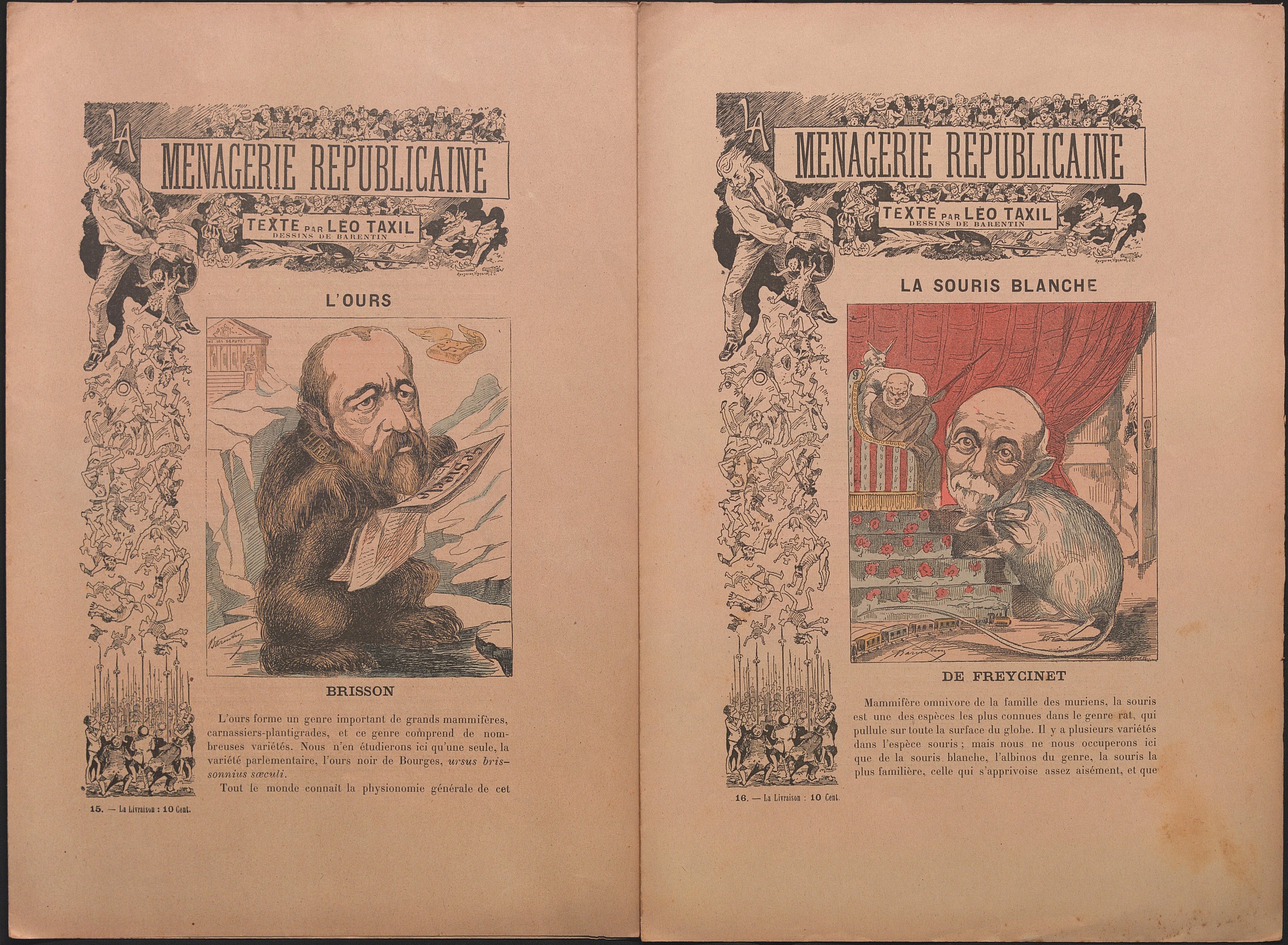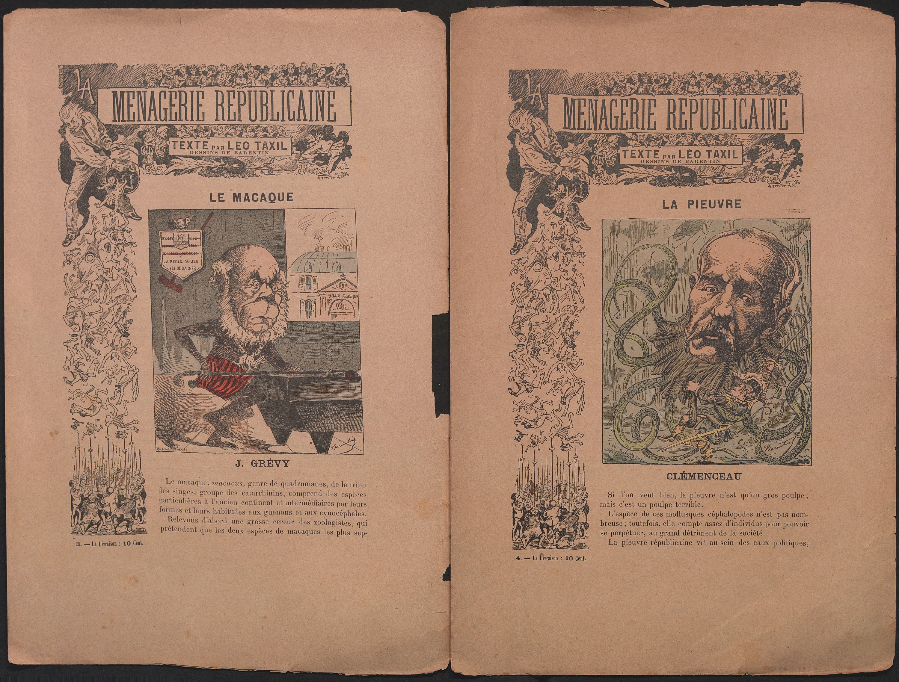 Véritable kaléidoscope à la manière de la Ménagerie Impériale de Paul Hadol publiée en 1870, l’auteur livre un portrait très ressemblant de l’homme politique visé, combinant la physionomie du personnage avec le corps de l’animal auquel la verve satirique de Léo Taxil l’assimilé: Jules ferry le vampire ; Jules Grévy le macaque ; Jules Simon le caméléon...