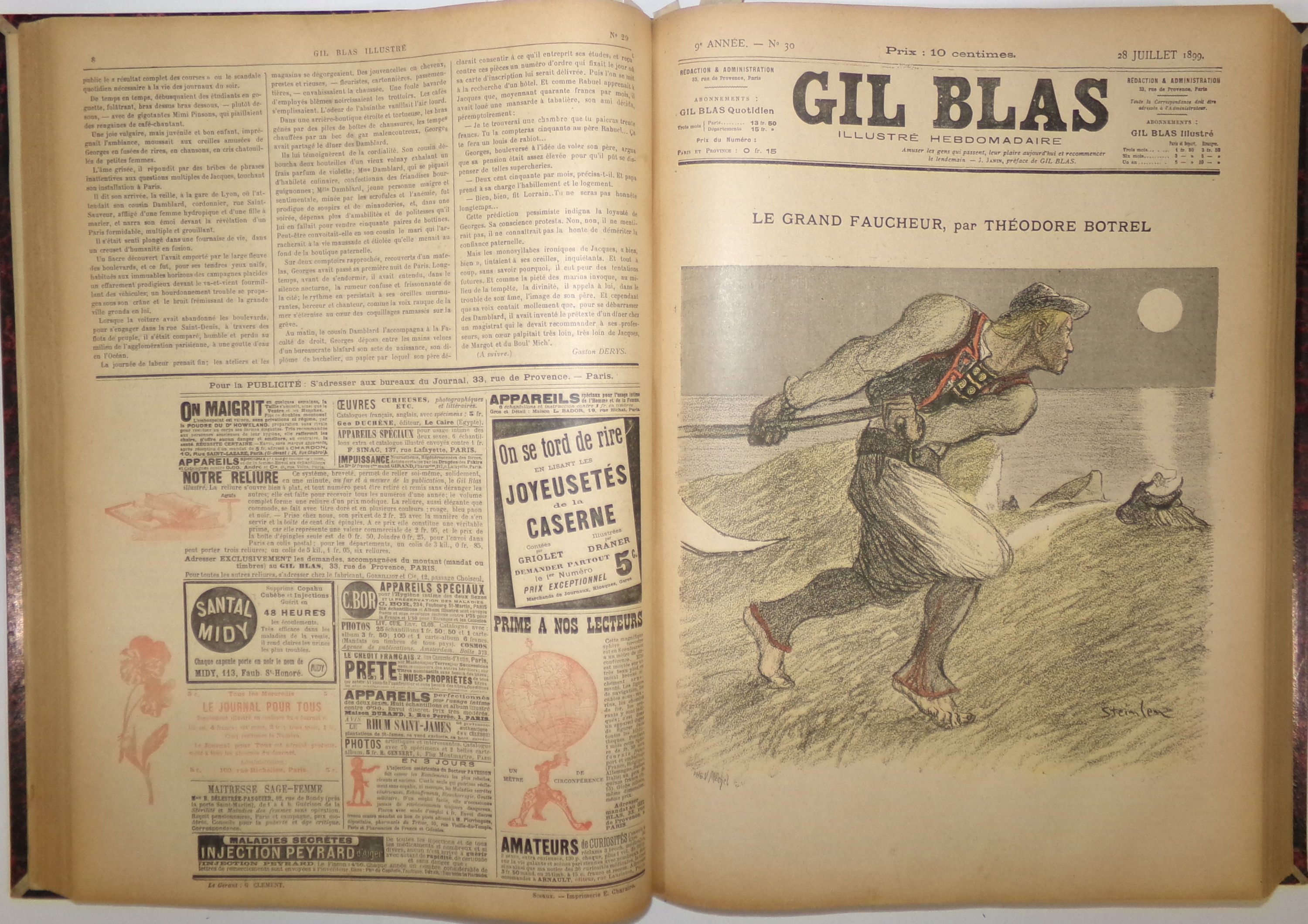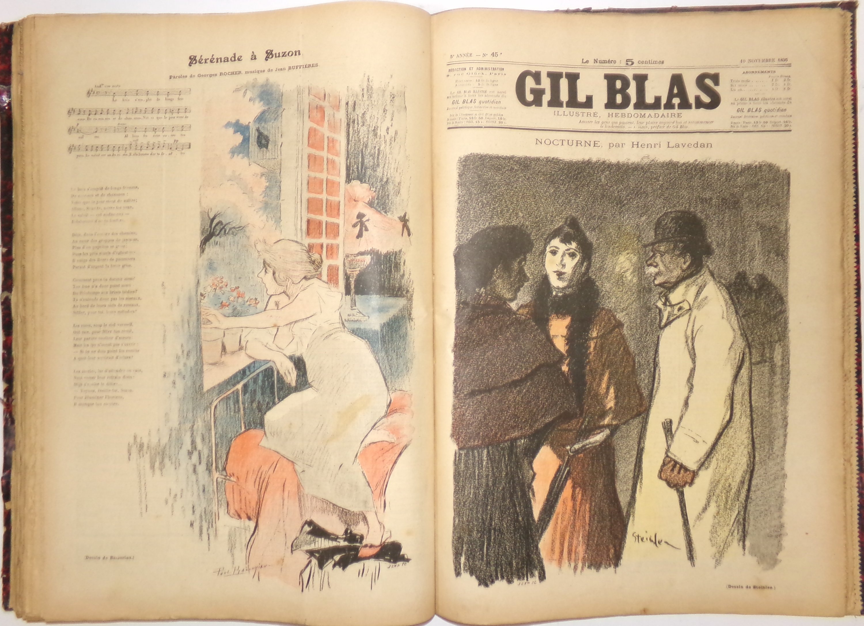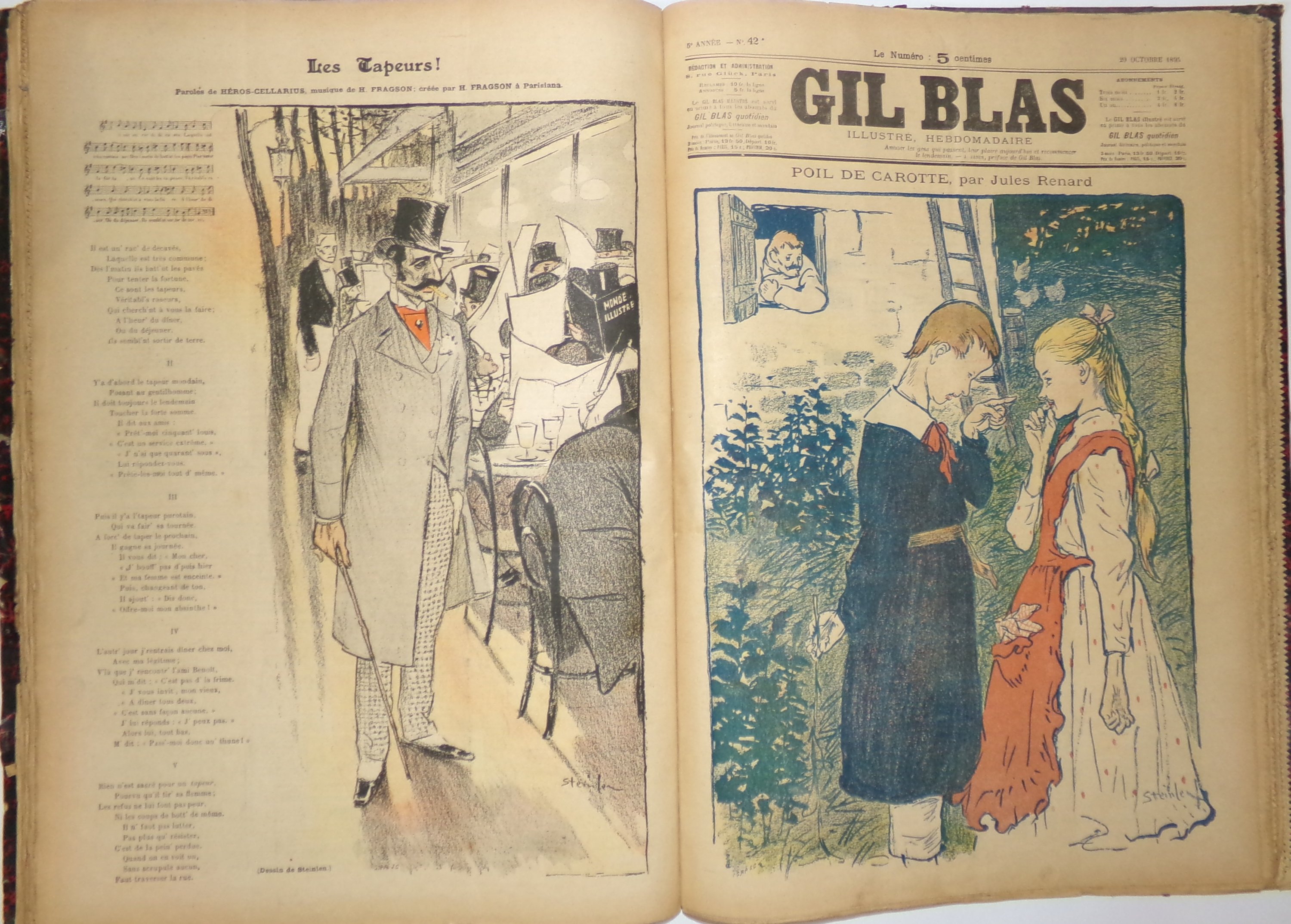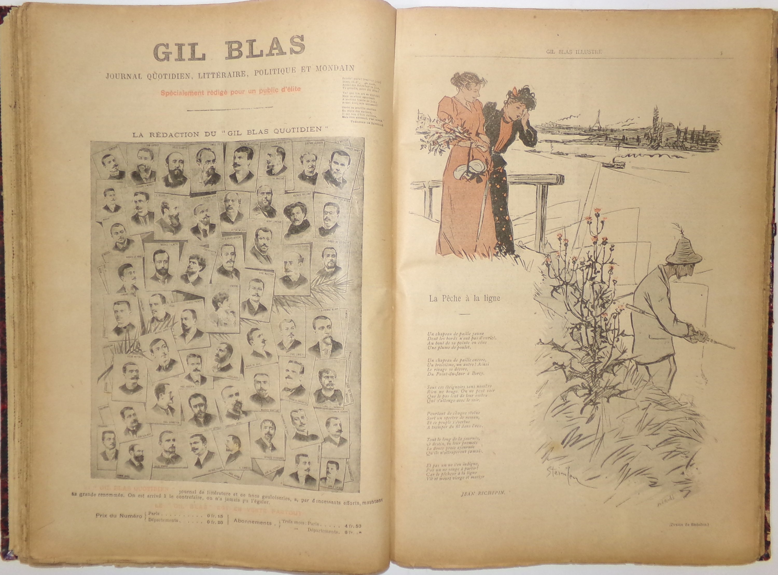 Fondé par Auguste Dumont, paru du 19 novembre 1879 au 4 août 1914, puis très épisodiquement du 20 janvier 1921 à mars 1940, cet hebdomadaire se veut avant tout littéraire. A partir du supplément du dimanche 28 juin 1891 le fascicule est titré « Gil Blas illustré » et porte la mention « n° 1 - Première année ». Y participent de grandes plumes de l’époque, certains sous forme de feuilletons signés par Emile Zola, Hector Malot, Théodore de Banville, Octave Mirbeau, Jules Renard, Marcel Schwob, Alphonse Daudet, Georges Courteline, Charles Baudelaire, Paul Verlaine, Alphonse Allais, Théodore Botrel, Tristan Bernard, Anatole France. Abondamment illustrés par Steinlen et Albert Guillaume, Job.