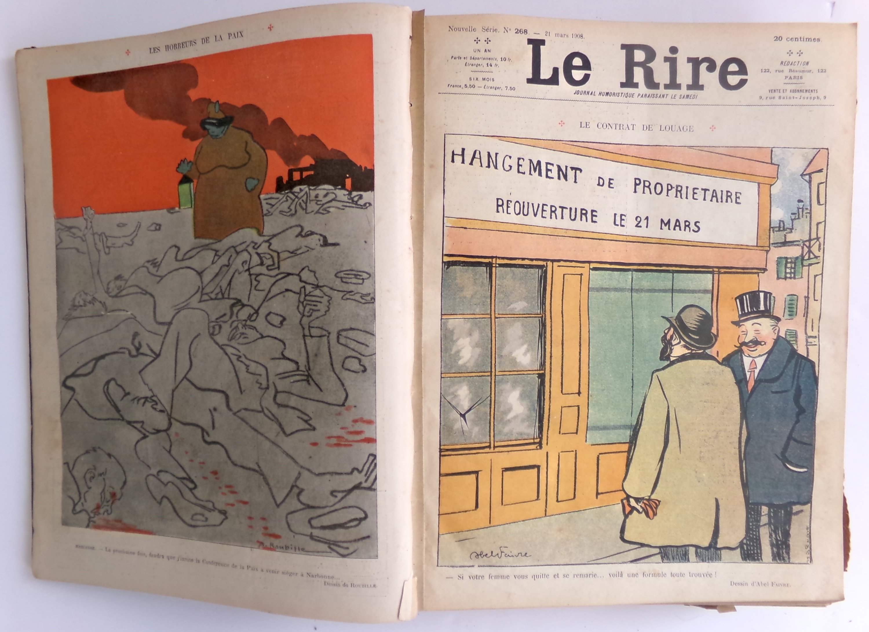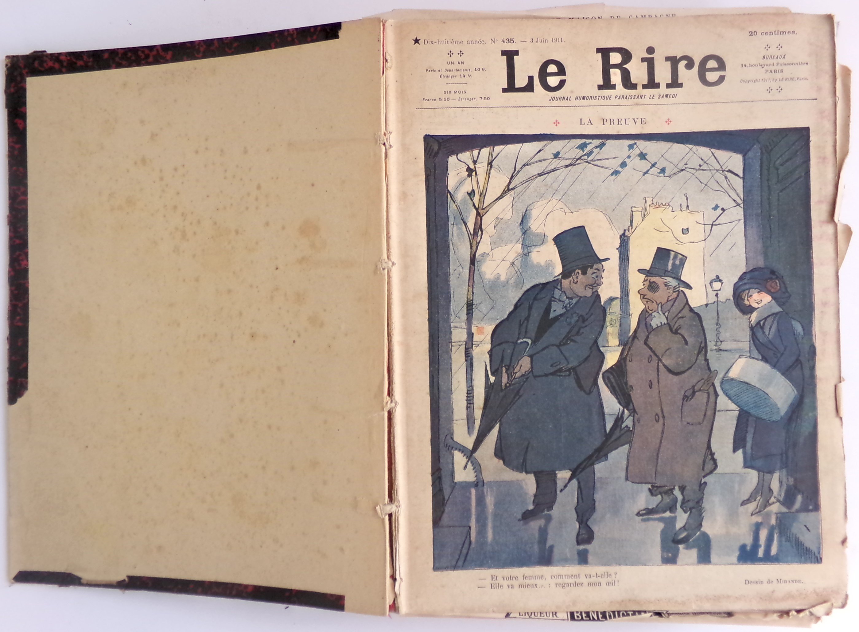 LE RIRE, JOURNAL HUMORISTIQUE. 3 vol.: n°1 du 10 nov. 1894 au n°52 du 2 novembre 1895, n°231 du 6 juillet 1907 au n°397 septembre 1910, n°435 du 3 juin 1911 au n°499 du 24 août 1912 (incomplets, dépareillés, bon état à état moyen (déchirures, plis).