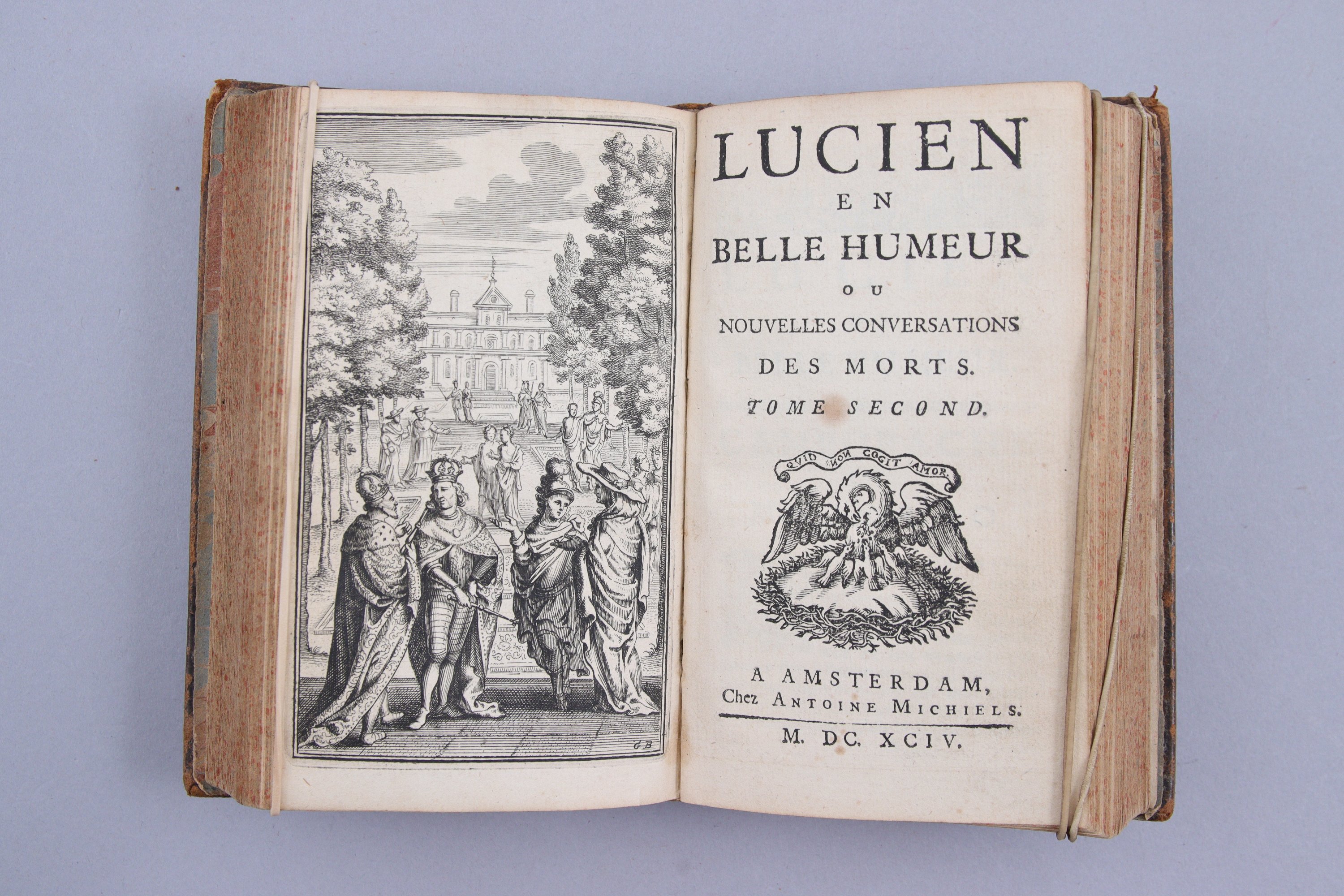 Sur le modèle de Lucien de Samosate, qui faisait dialoguer Diogène et Hercule, ou Alexandre et Philippe, Montpleinchamp fait converser post mortem Lucien et Perrot d'Ablancourt, Louis XI et Charles le Hardi, Ronsard et Corneille, les poétesses Korinna de Tanagra et Sapho de Lesbos, Tycho Brahé et Copernic, Rubens et Jacques Callot, les imprimeurs Christophe Plantin et Sébastien Cramoisy, etc... etc... 2 beaux frontispices, signés CB.