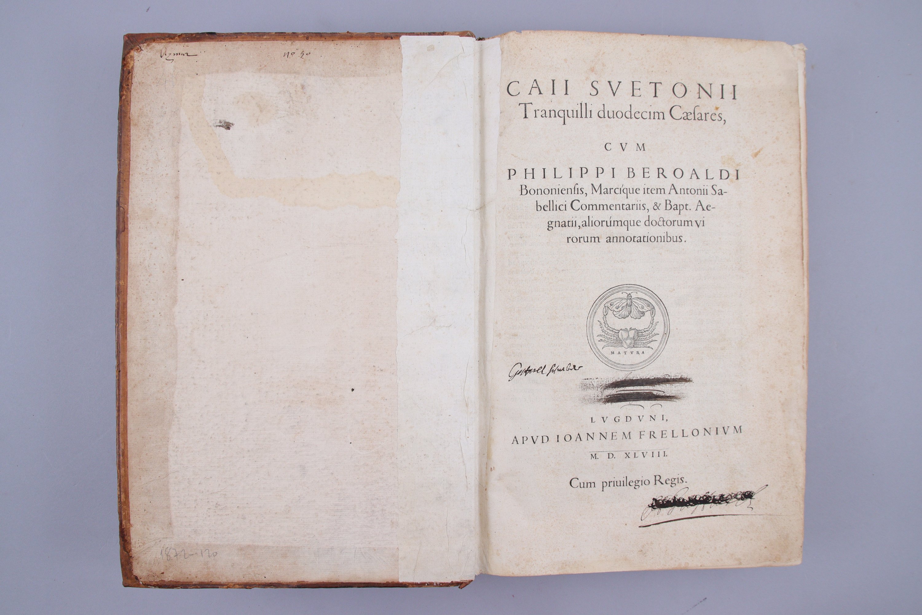 Très belle impression de Jean II Frellon qui dirigeait seul l'atelier depuis le décès de son frère François en 1546. La mise en pages est remarquable: le texte de Suétone est complétement cerné par les commentaires de Béroalde.