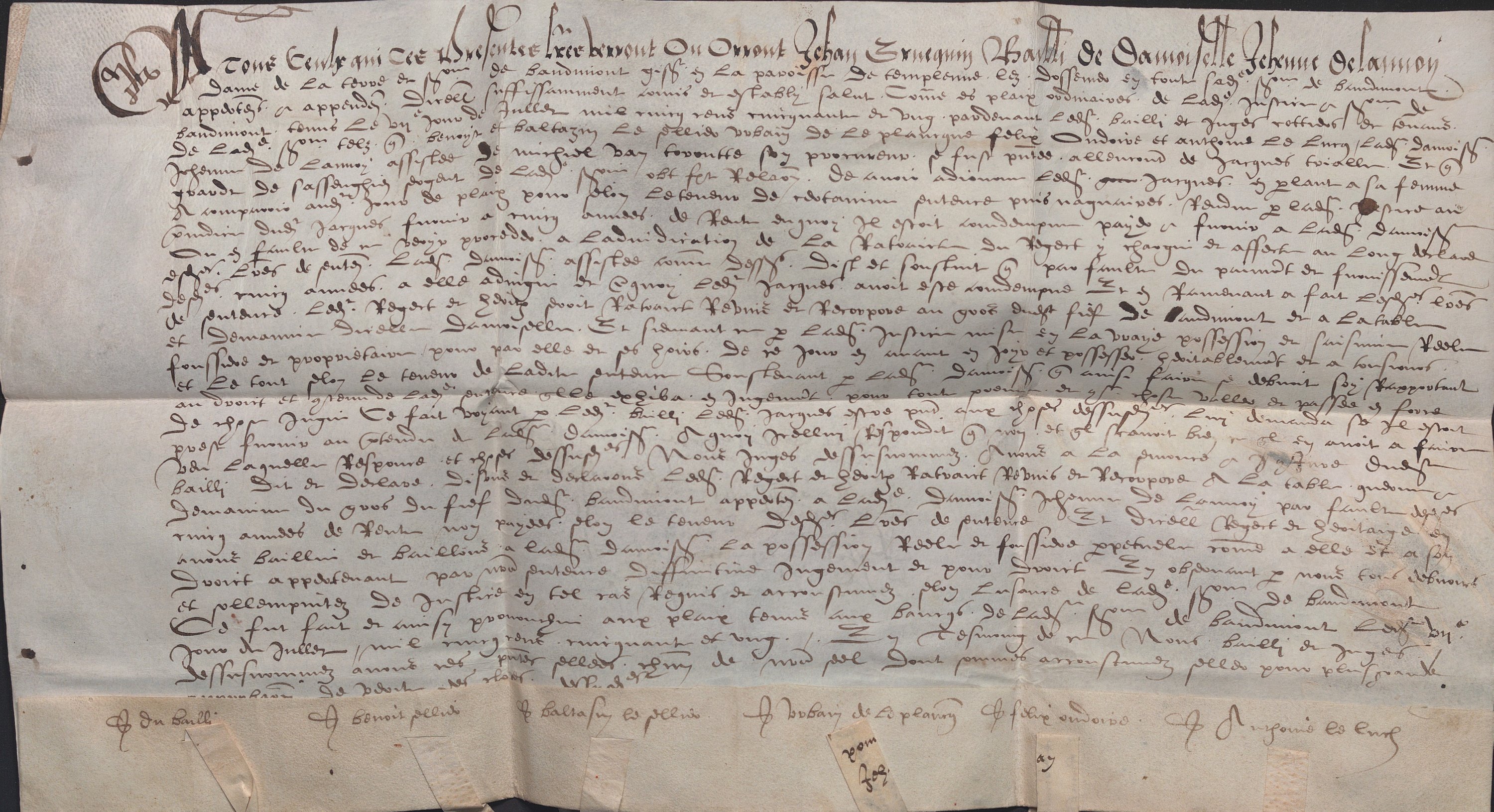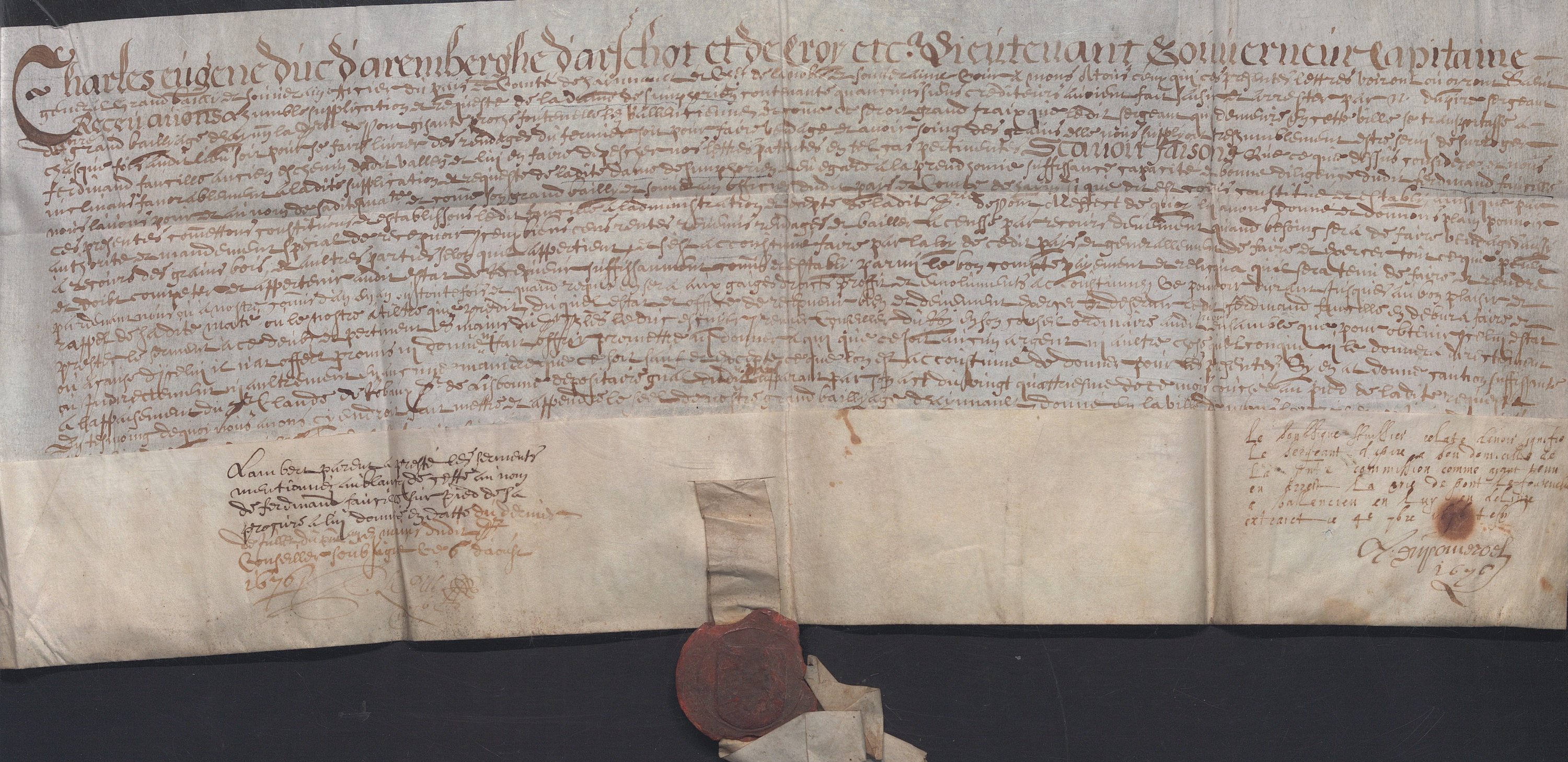 Lettre de retrait, 7 juillet 1551, du fief et seigneurie de Baudimont près d’Arras au profit de dame Jeanne Delaunoy, parchemin, 27 x 49 cm ;