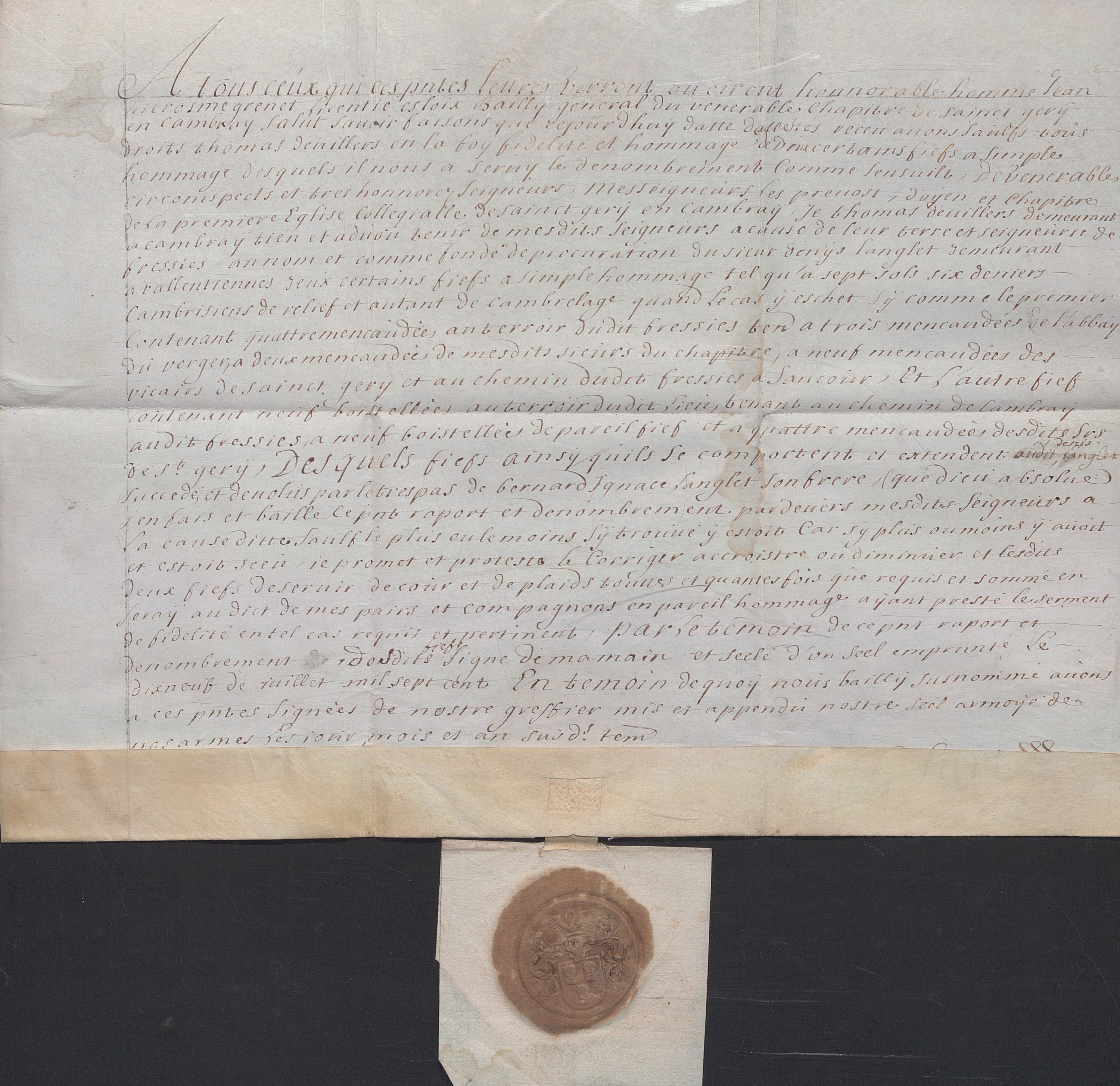 Récépissé de dénombrement, 19 juillet 1700, de deux fiefs à simple hommage du terroir de Fressies dépendant de la seigneurie de Fourmestraux à Fretin près de Lille, velin, beau sceau, 24 x 32 cm.