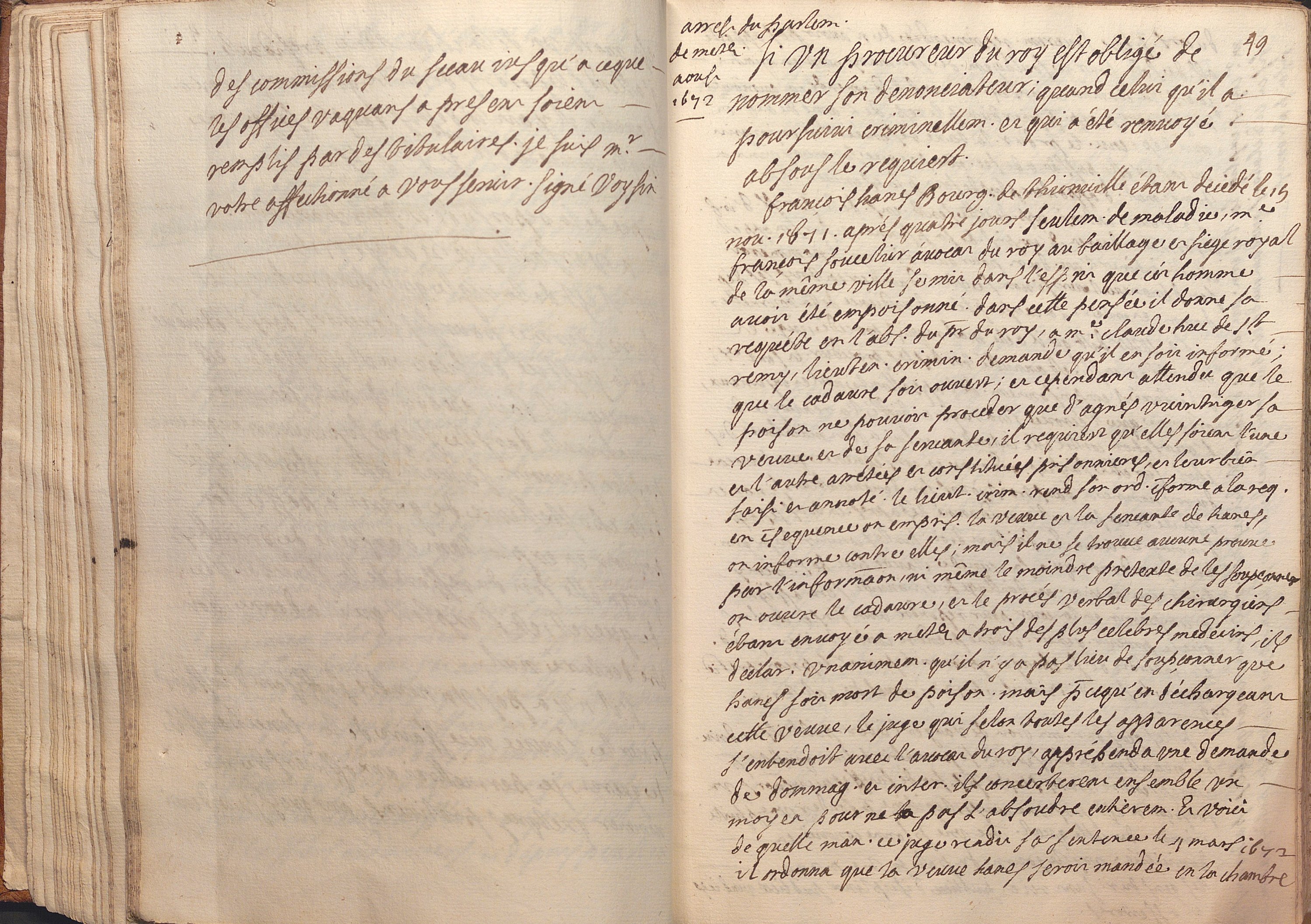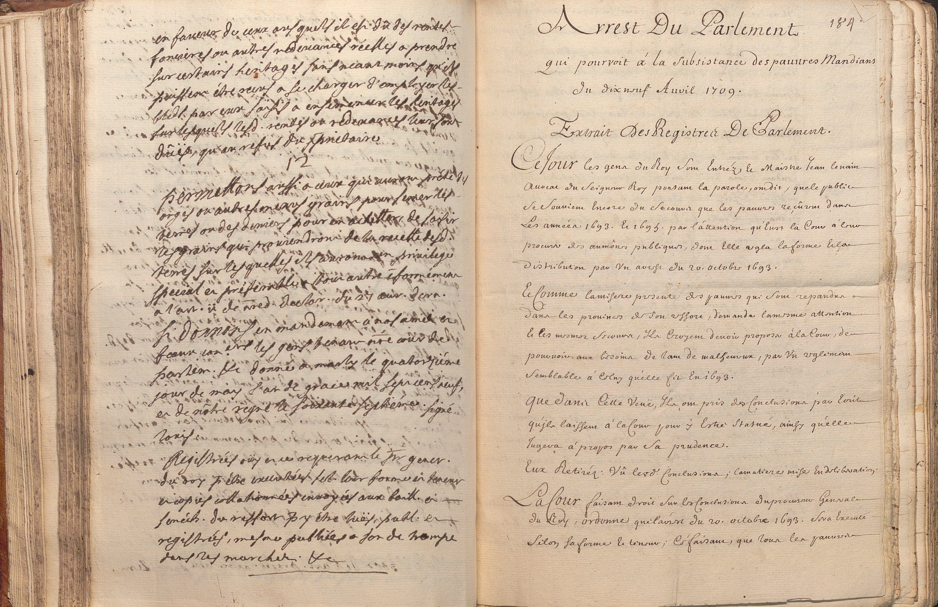 Véritable vade-mecum juridique indispensable à la gestion des affaires de l’époque abordant des thèmes variés tels que réunion des compagnies des Indes orientales et de la Chine à la Compagnie d’Occident (1719), règlement sur les officiers des sénéchaussées (1629), déclaration concernant les condamnés aux galères bannis et vagabonds (1719), subsistance des pauvres (1709), règlement entre les avocats et les procureurs du roi (1706), etc.