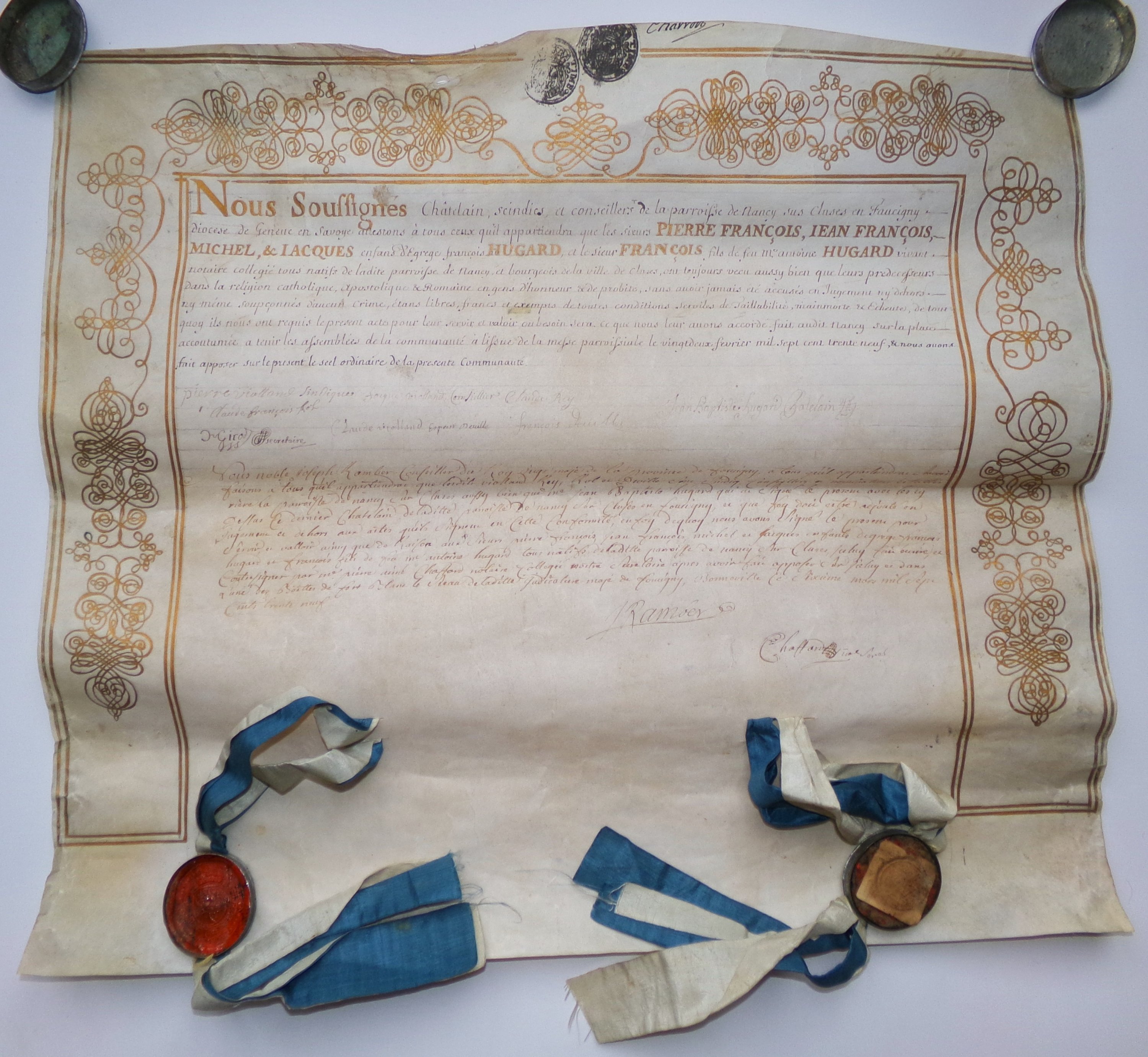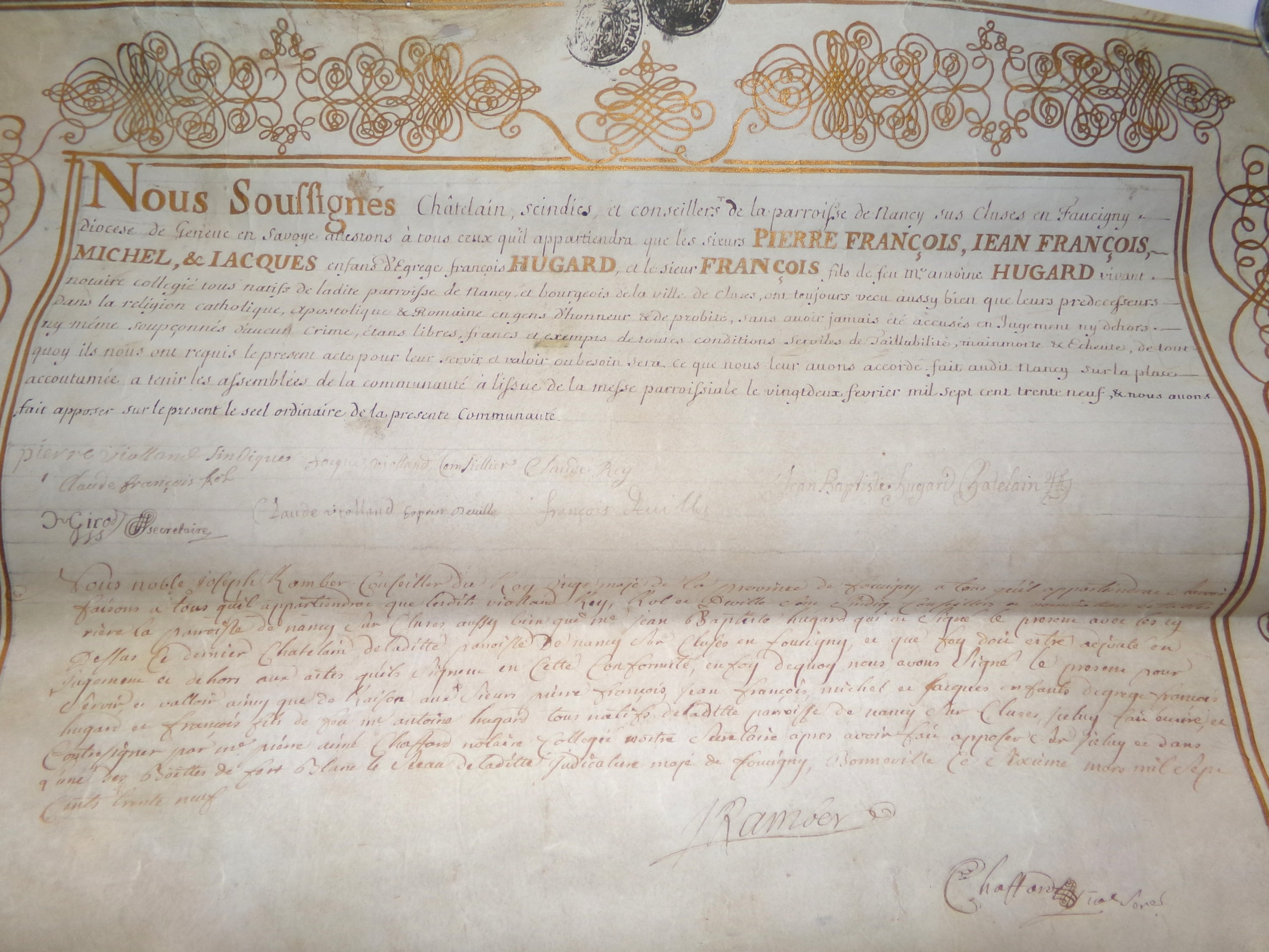 Rarissime attestation délivrée par les autorités civiles de la paroisse de Nancy-sur-Cluses à Pierre-François (1694-1775), Jean François (1689-1768), Michel (1703-1756), Jacques (1711-1777), enfants d’égrège François Hugard, et à François fils de Me Antoine Hugard notaire, « tous natifs de ladite paroisse de Nancy et bourgeois de la ville de Cluses, ont toujours vécu aussi bien que leurs prédécesseurs dans la religion catholique, apostolique et romaine en gens d’honneur et de probité, sans jamais avoir été accusés en jugement ni dehors ni même soupçonnés d’aucun crime, étant libres, francs et exempts de toutes conditions serviles de taillaibilité ». Cette attestation fut délivrée aux frères Hugard, tous marchands bourgeois draps et de soie de Cluses en vue de leur émigration et installation dans la ville de Lunéville, résidence des ducs de Lorraine et de Bar.