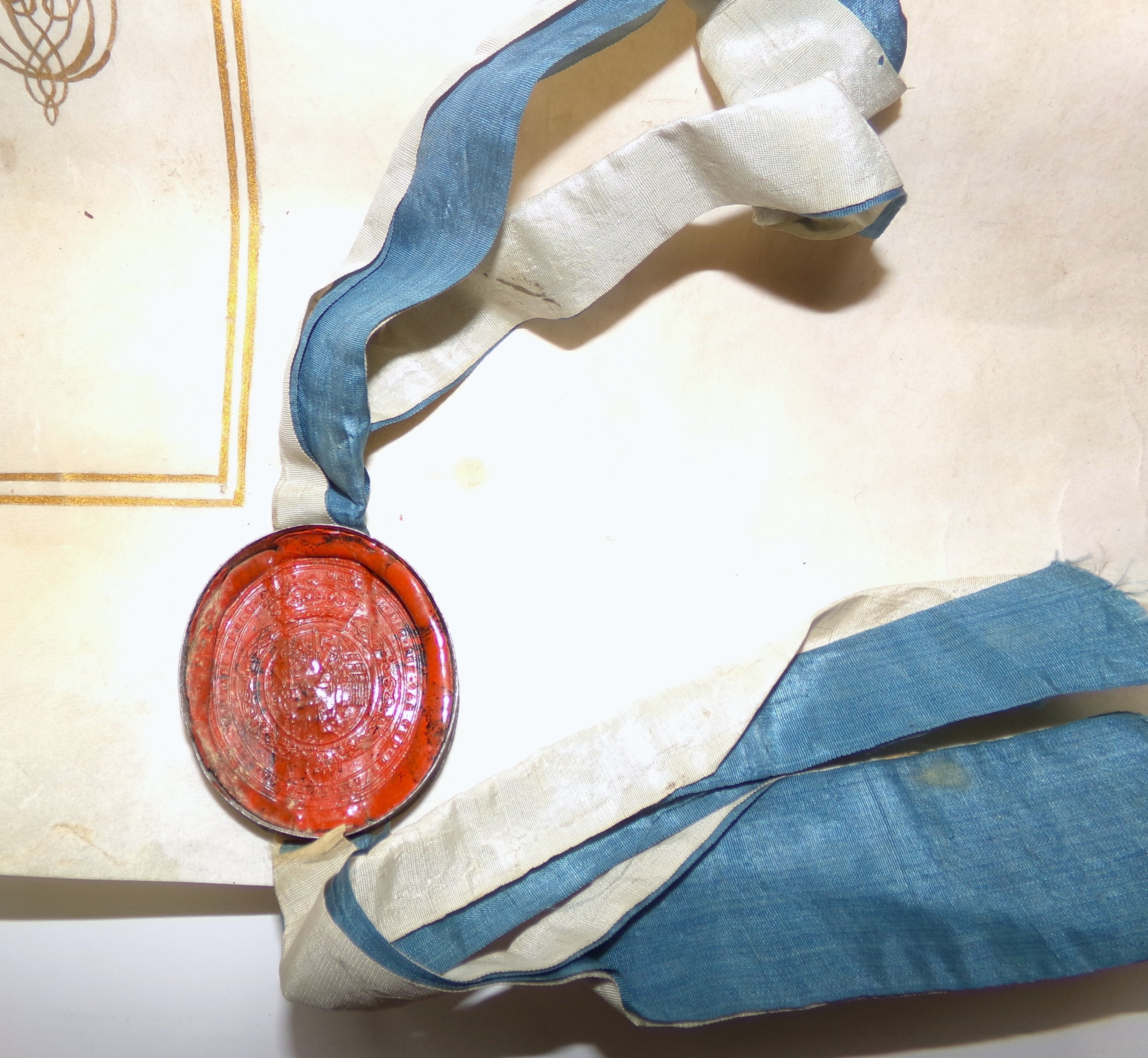Pièce manuscrite sur parchemin, 49 x 57 cm (roulé), écrit à l’encre noire, brune et d’or, à encadrement d’entrelacs et filets d’or, signés par les échevins de la paroisse de Nancy-sur-Cluses (Jean Baptiste Hugard châtelain, Pierre Violland syndic ; Jacques Violland conseiller, etc) et par Joseph Rambert, juge-maje de la province de Faucigny et sénateur au Sénat de Savoie. Timbre cachet fiscal aux armes de Savoie. 2 sceaux de cire rouge contenus chacun dans leur boite de métal et attaché par un cordon de soie bleu et blanc, dont un représentant les armoiries du duché de Savoie.