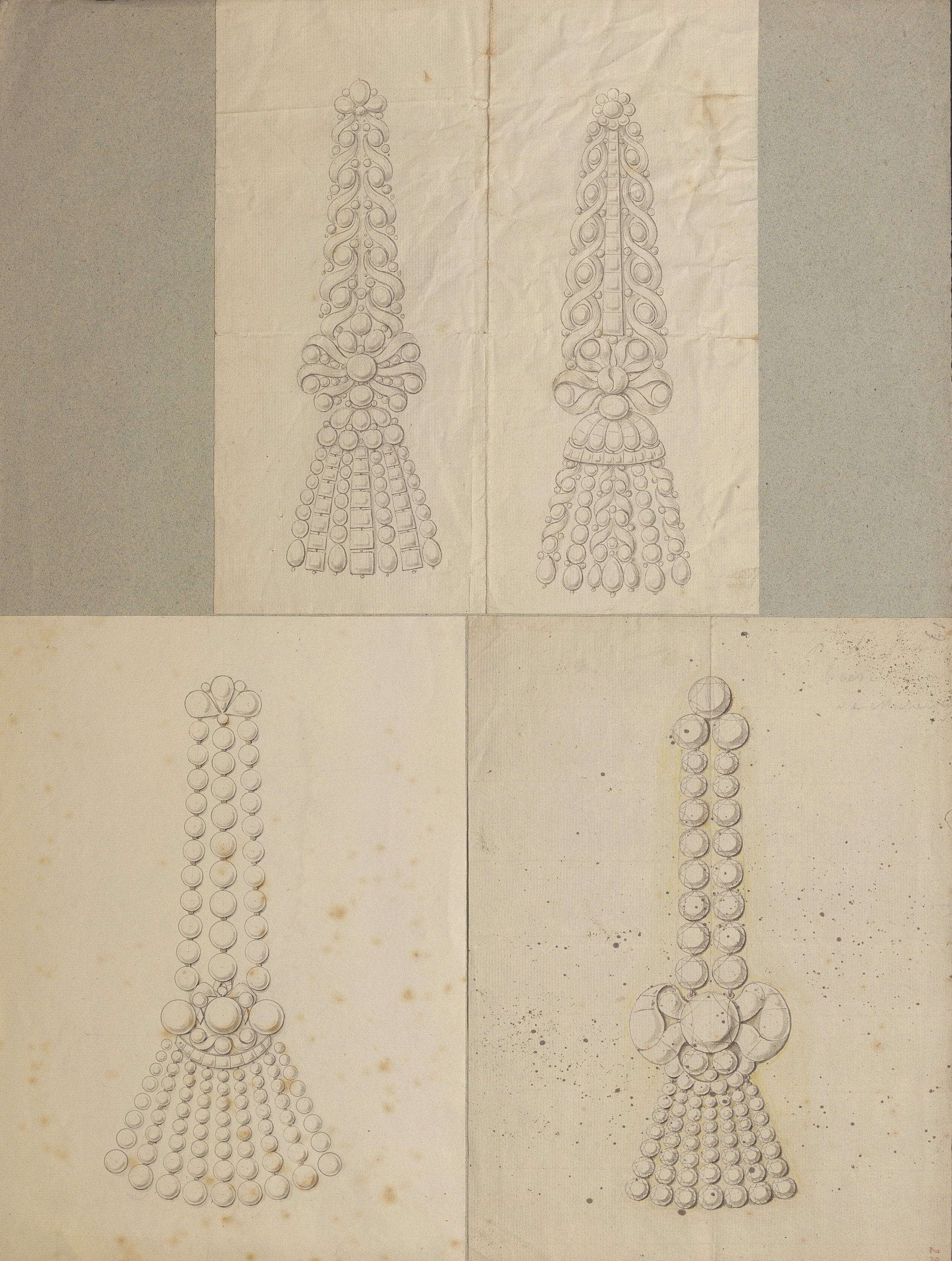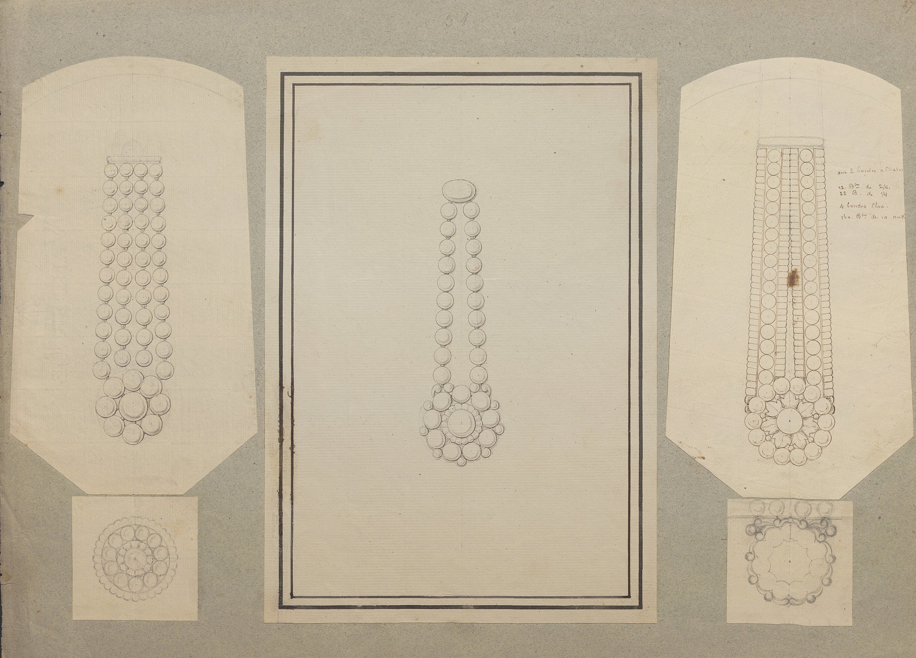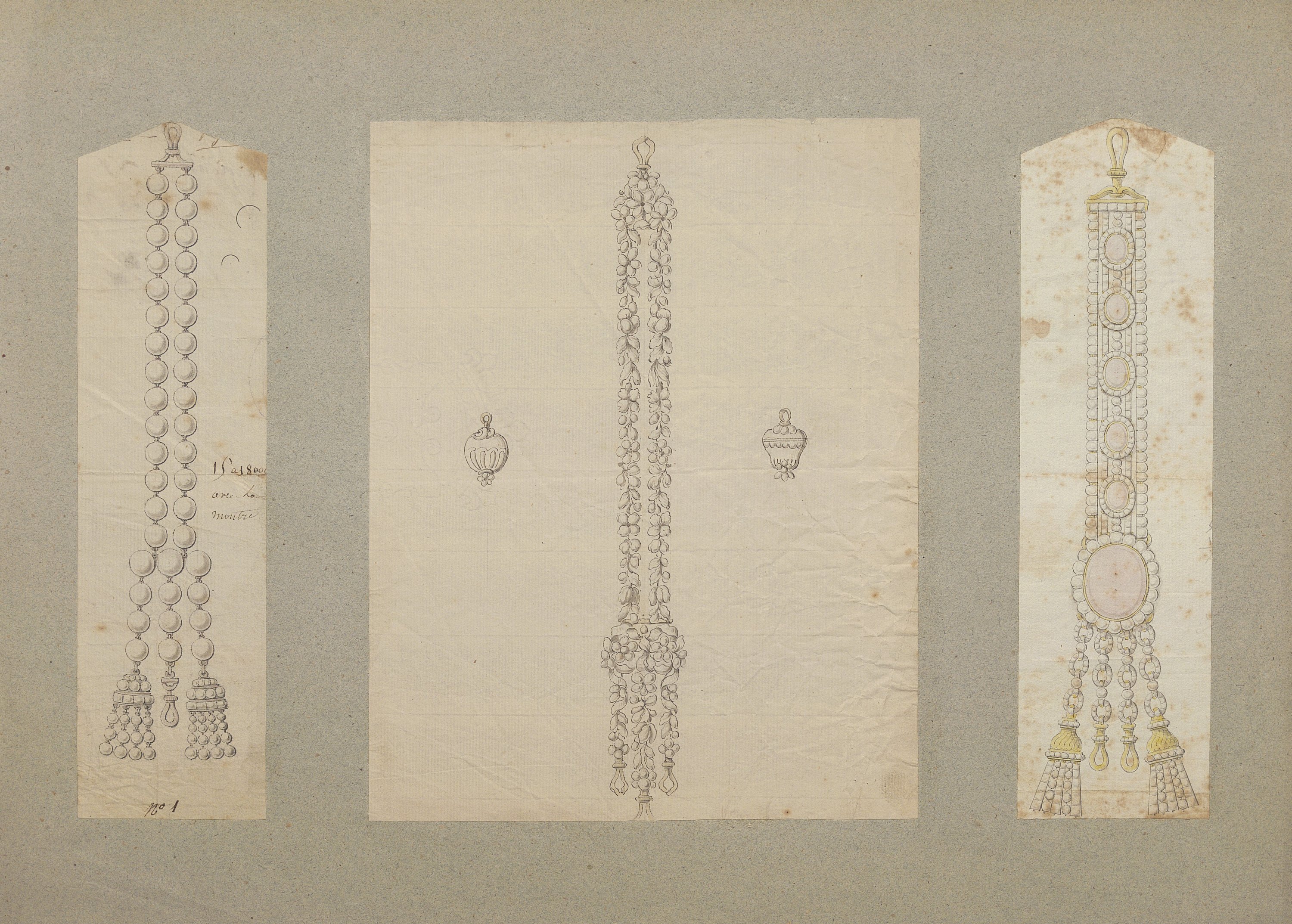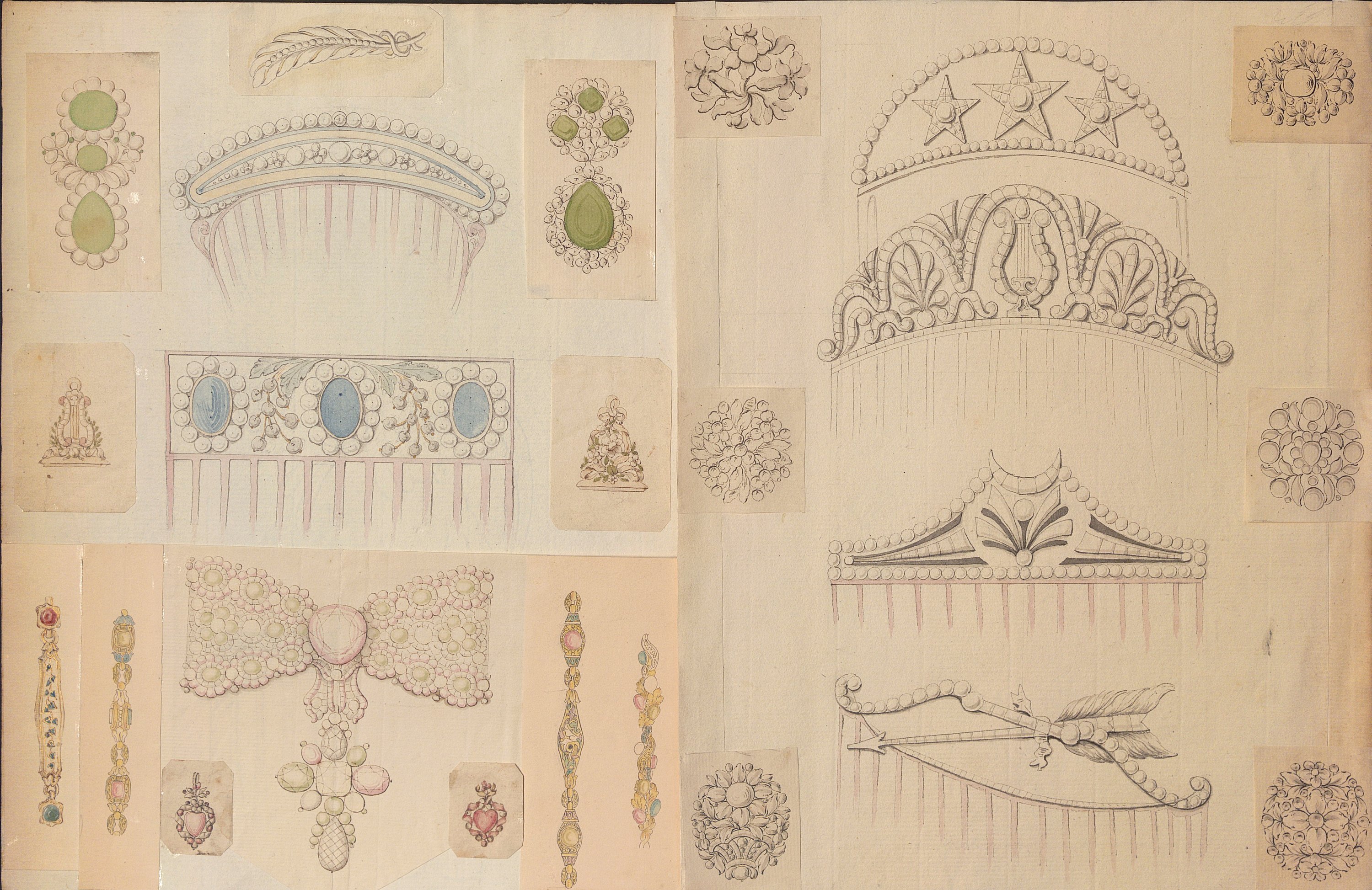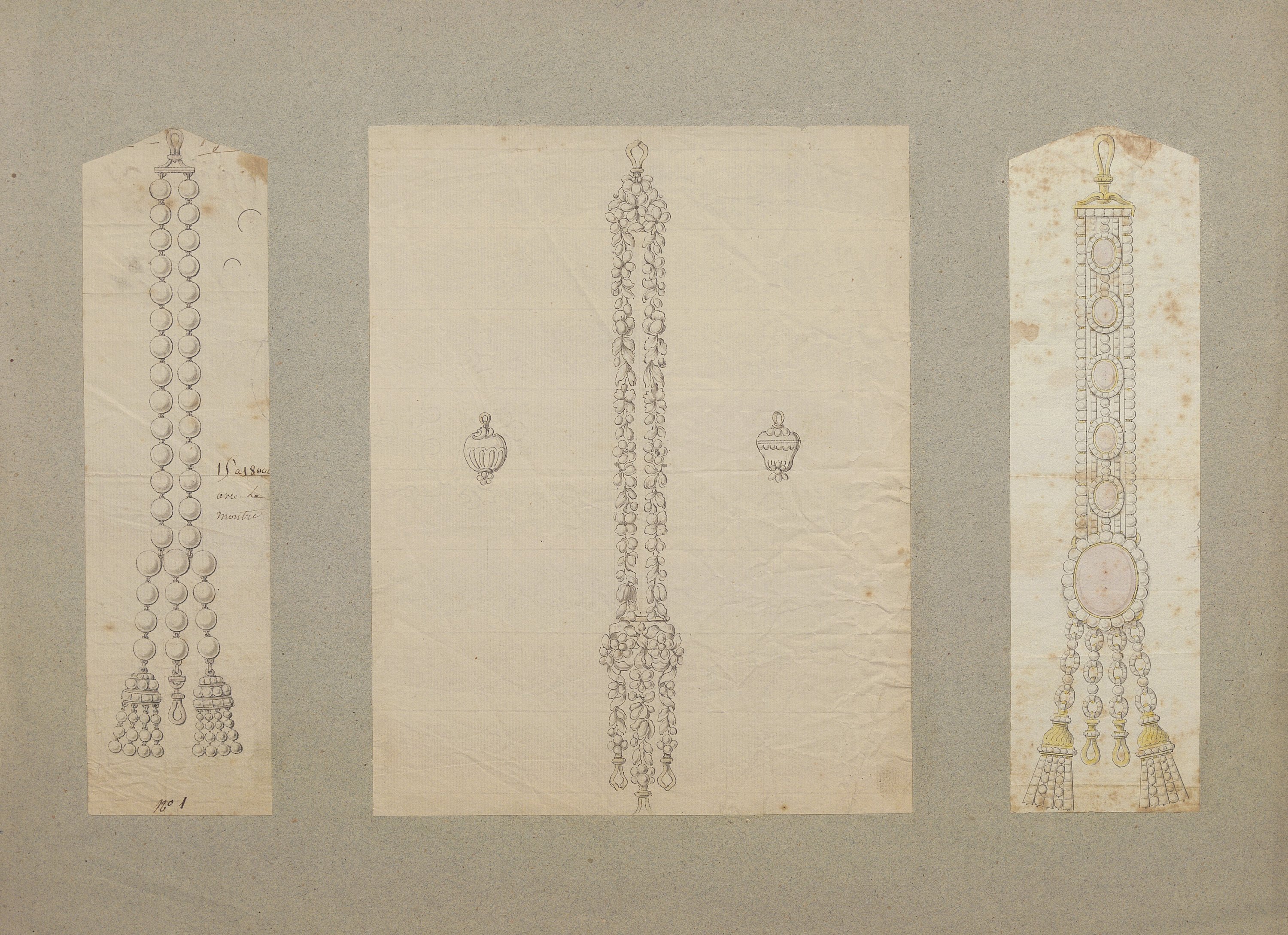 Les dessins les plus anciens, datant des années 1780-1790, représentent des bijoux, parures et ferrets de haute joaillerie pavés de pierres précieuses dans le goût néoclassique: devants de corsage, nœuds en broche, broches de boutonnière et de corsage, châtelaines, pampilles, etc.
