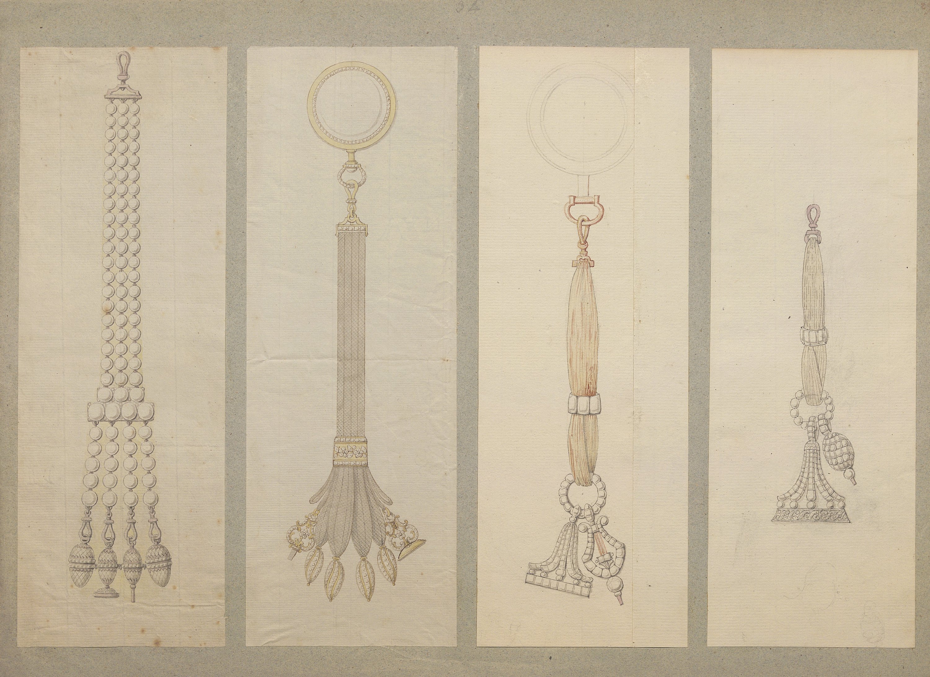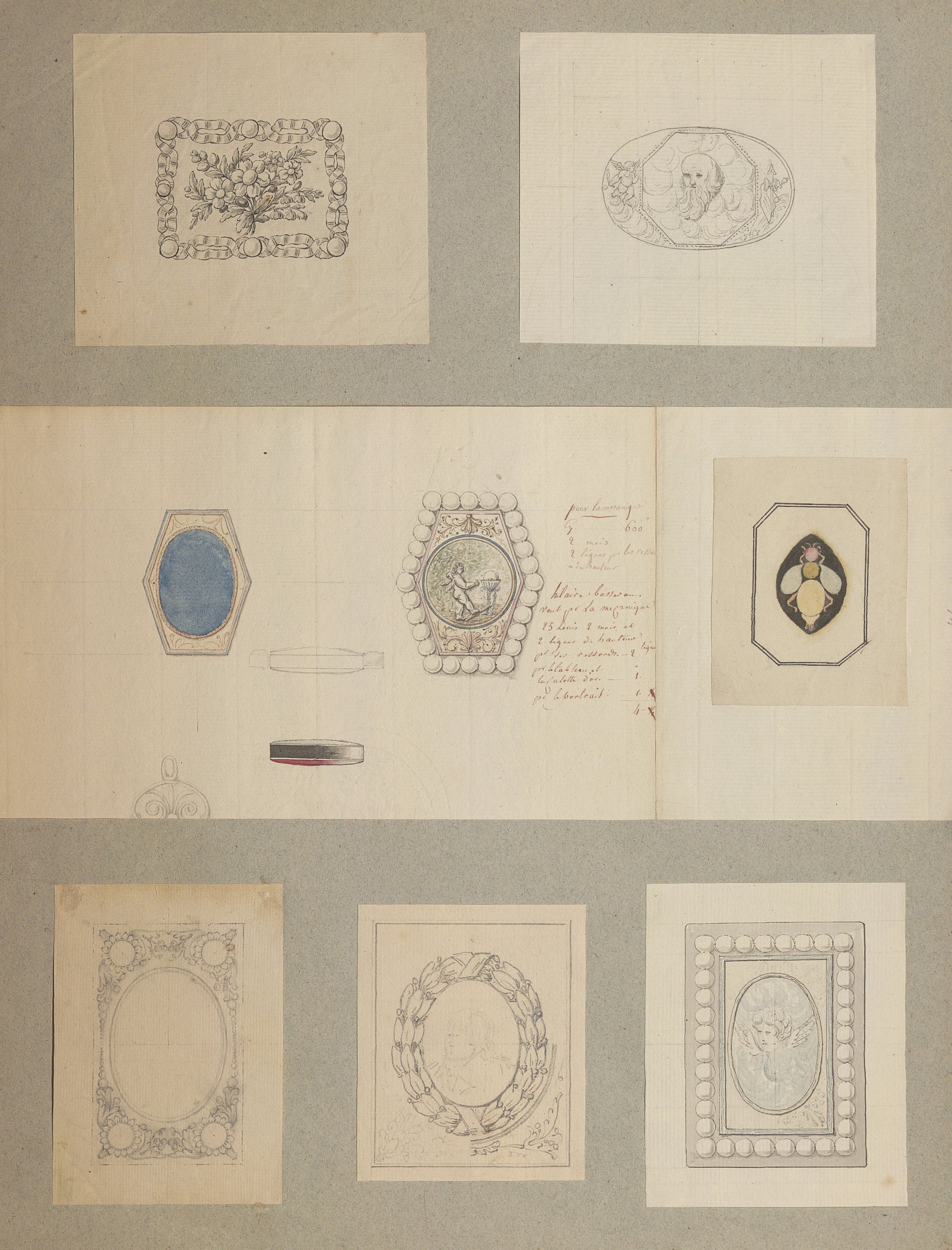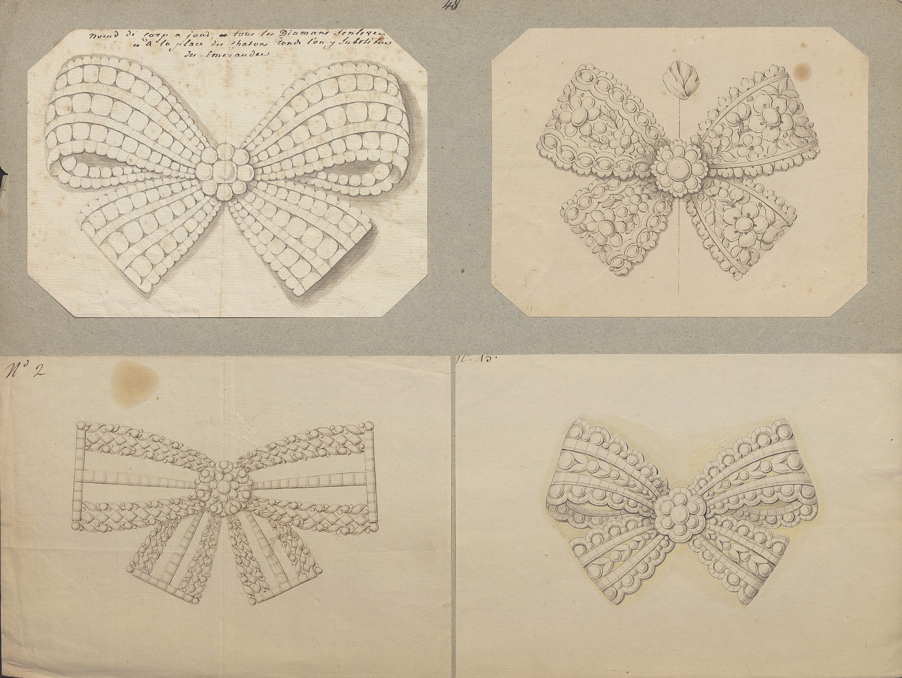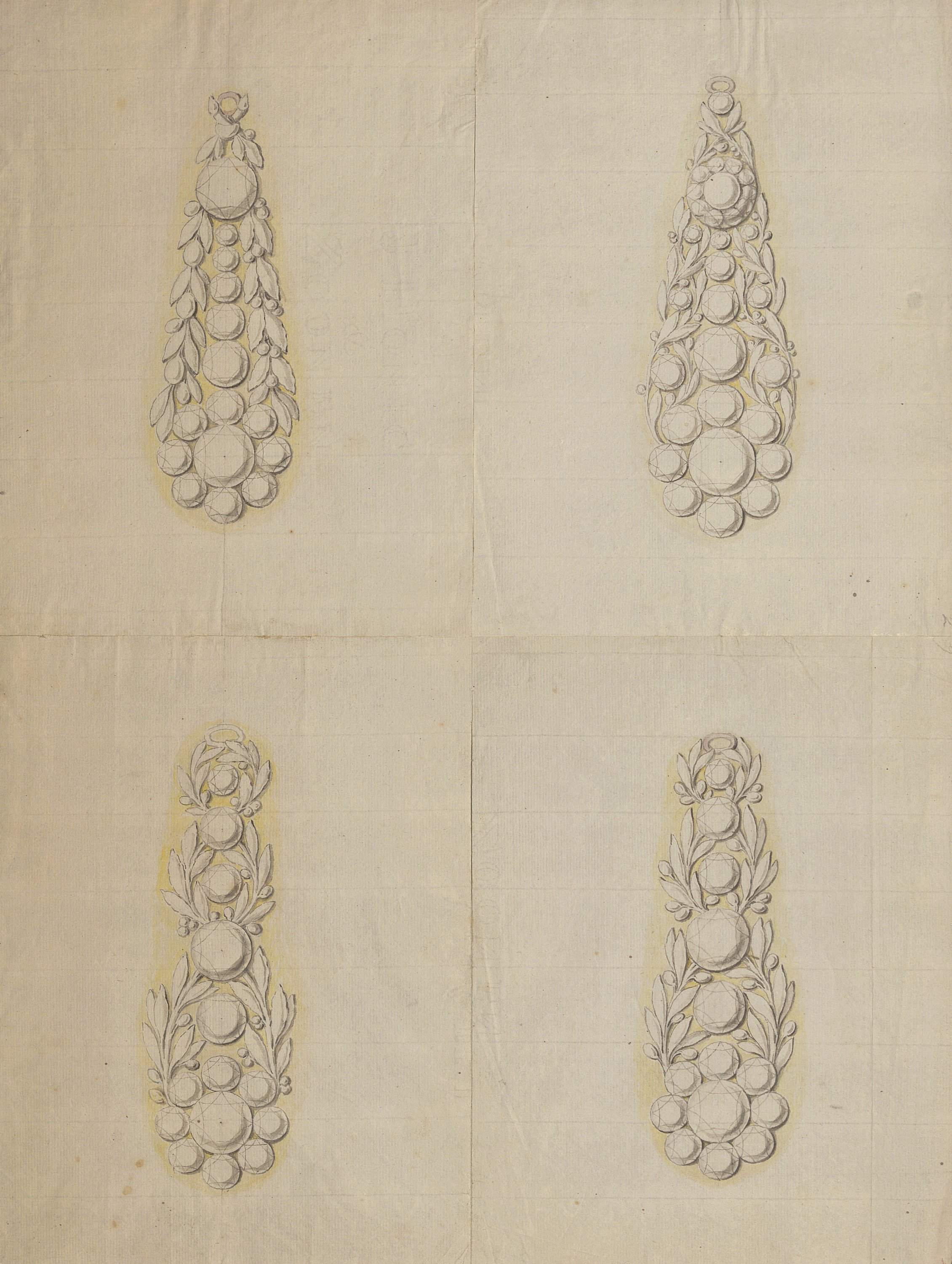 Les dessins les plus anciens, datant des années 1780-1790, représentent des bijoux, parures et ferrets de haute joaillerie pavés de pierres précieuses dans le goût néoclassique: devants de corsage, nœuds en broche, broches de boutonnière et de corsage, châtelaines, pampilles, etc.