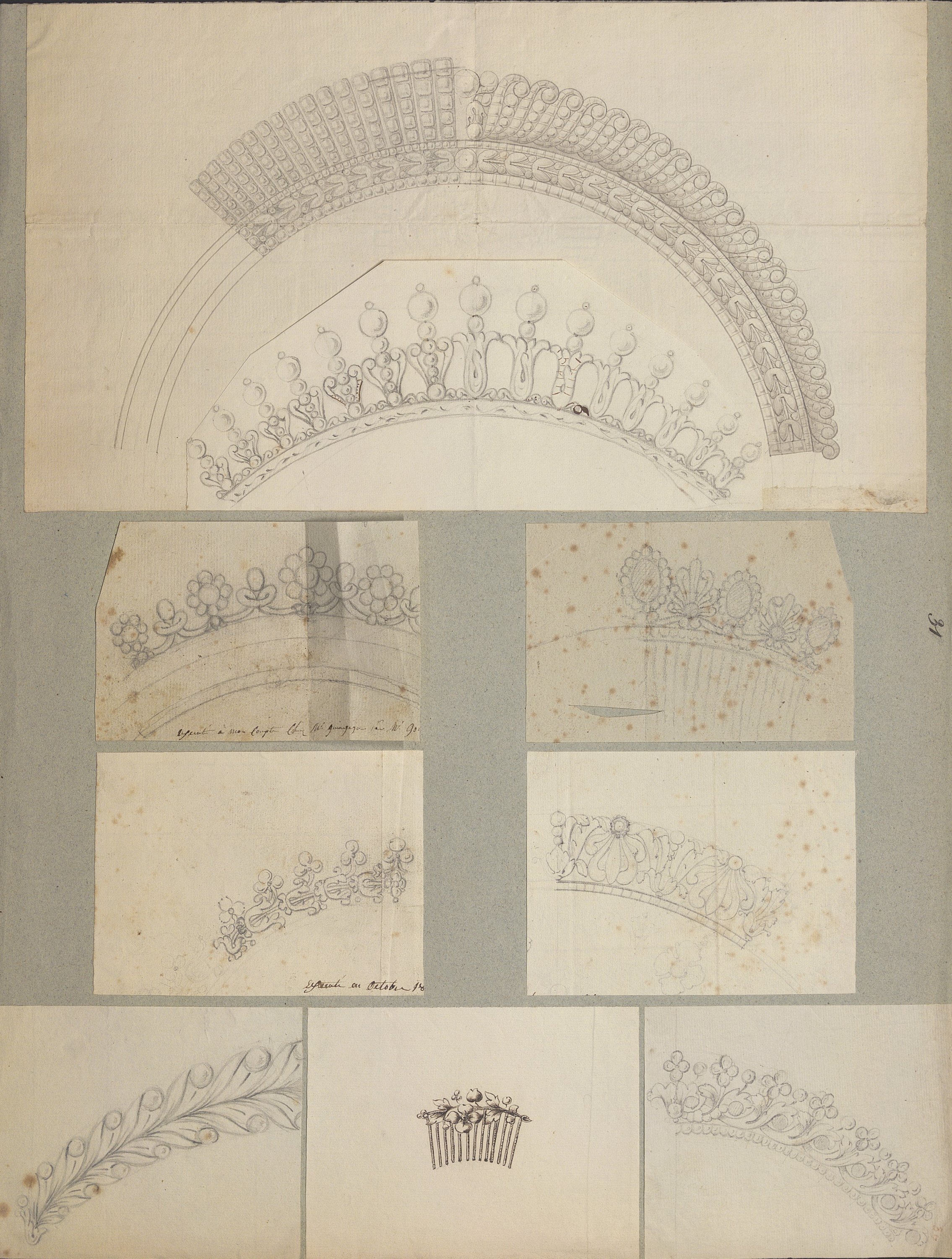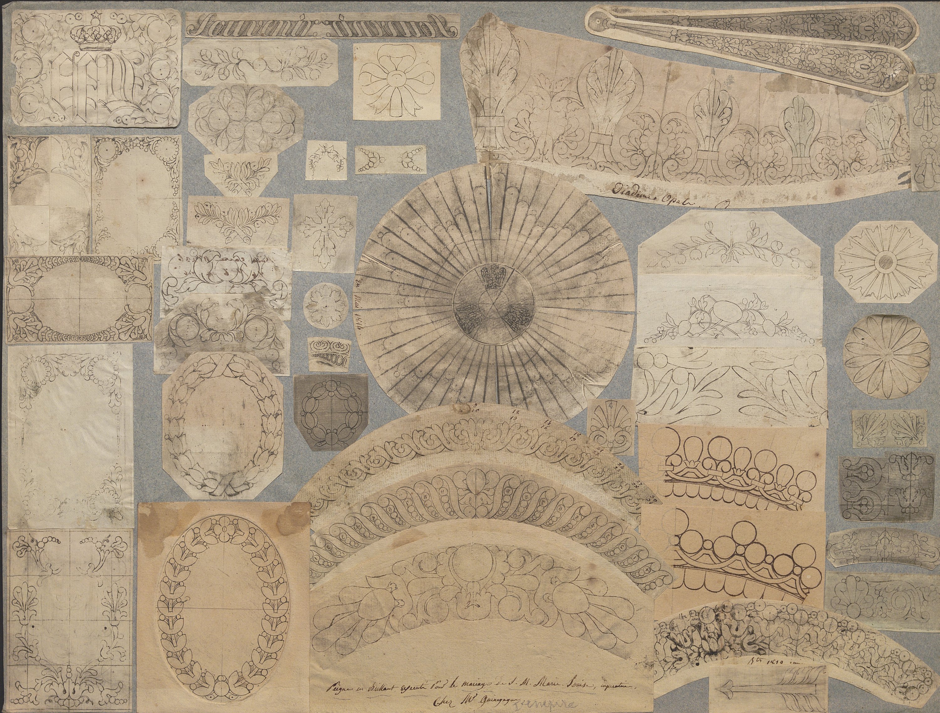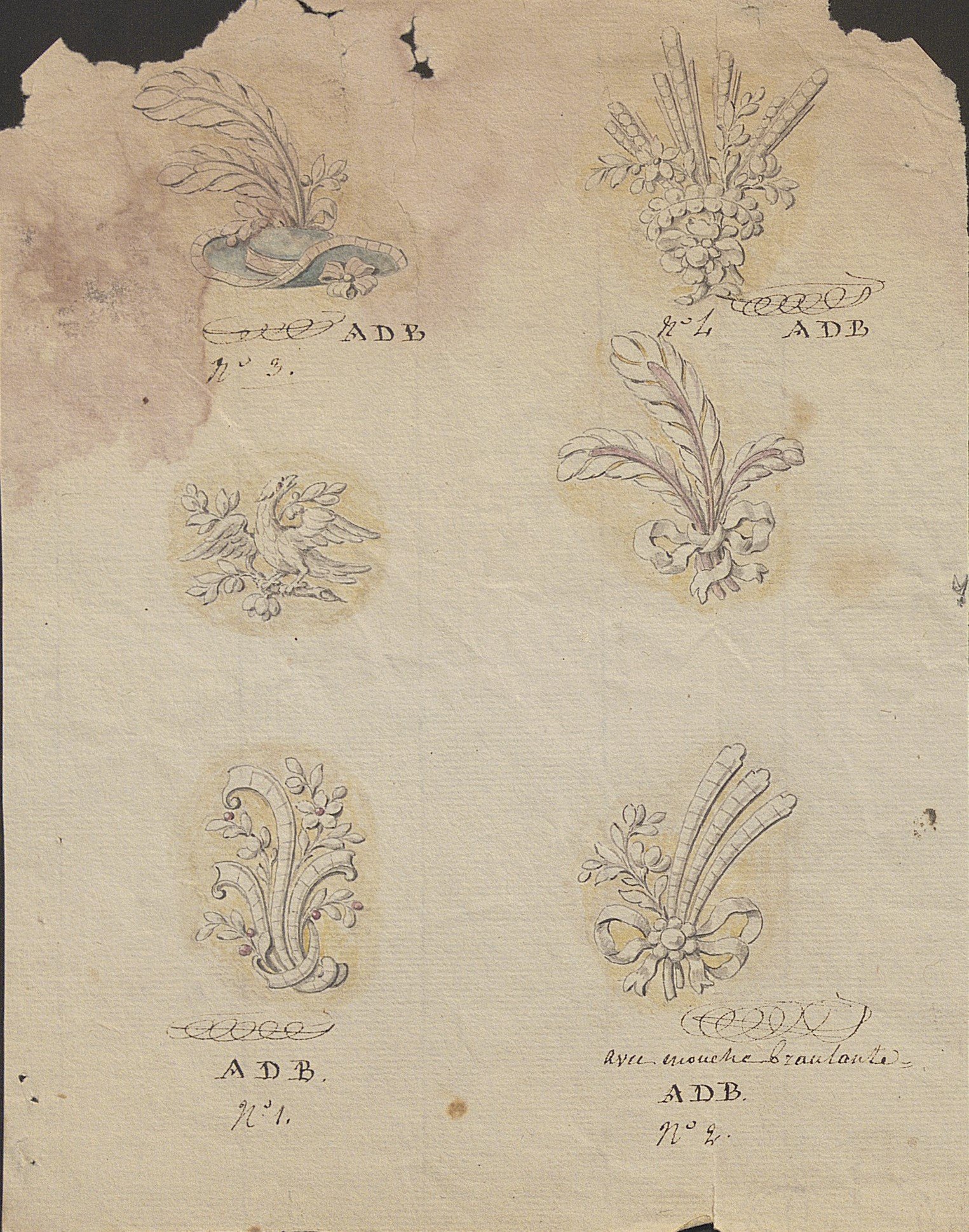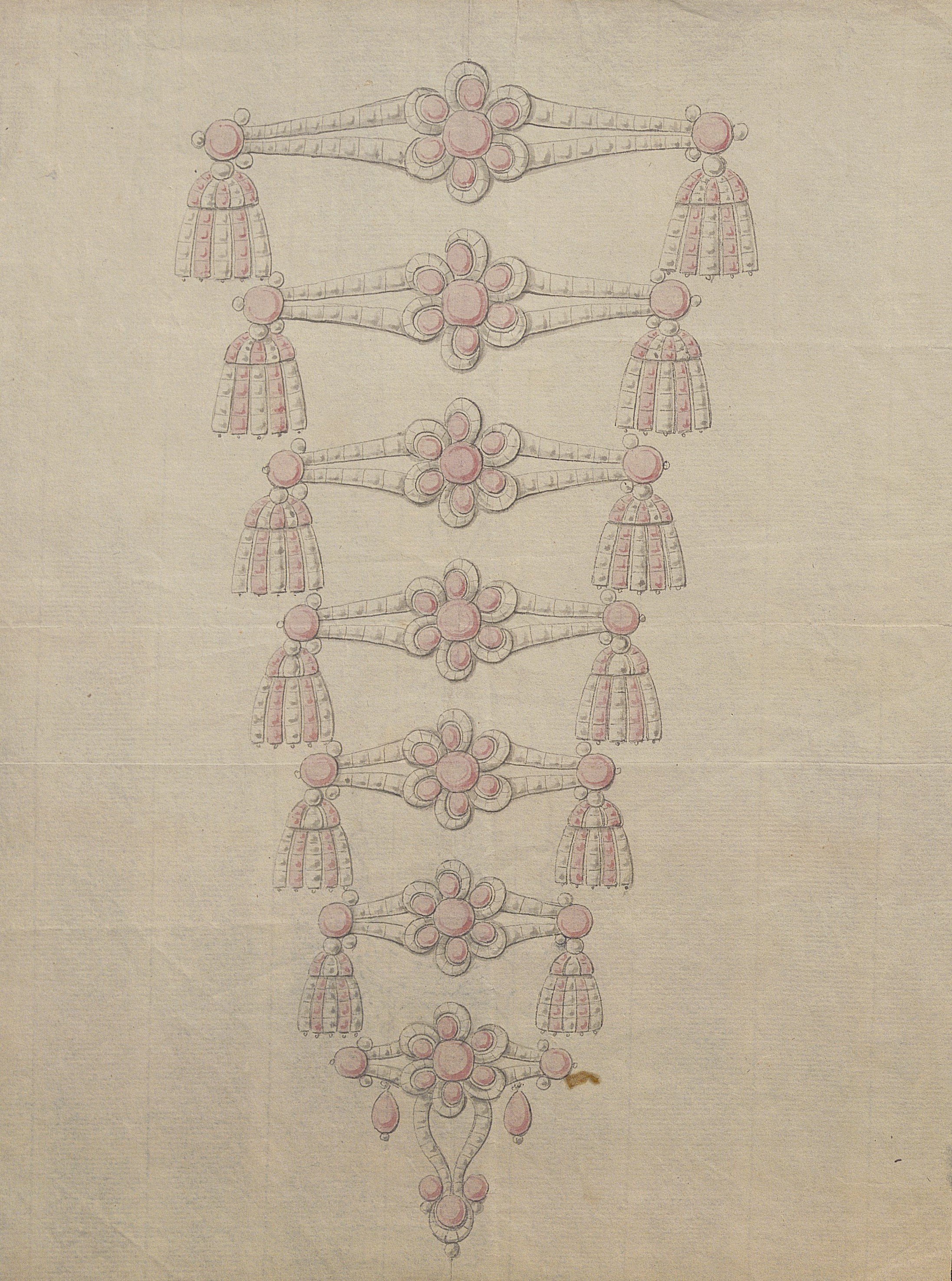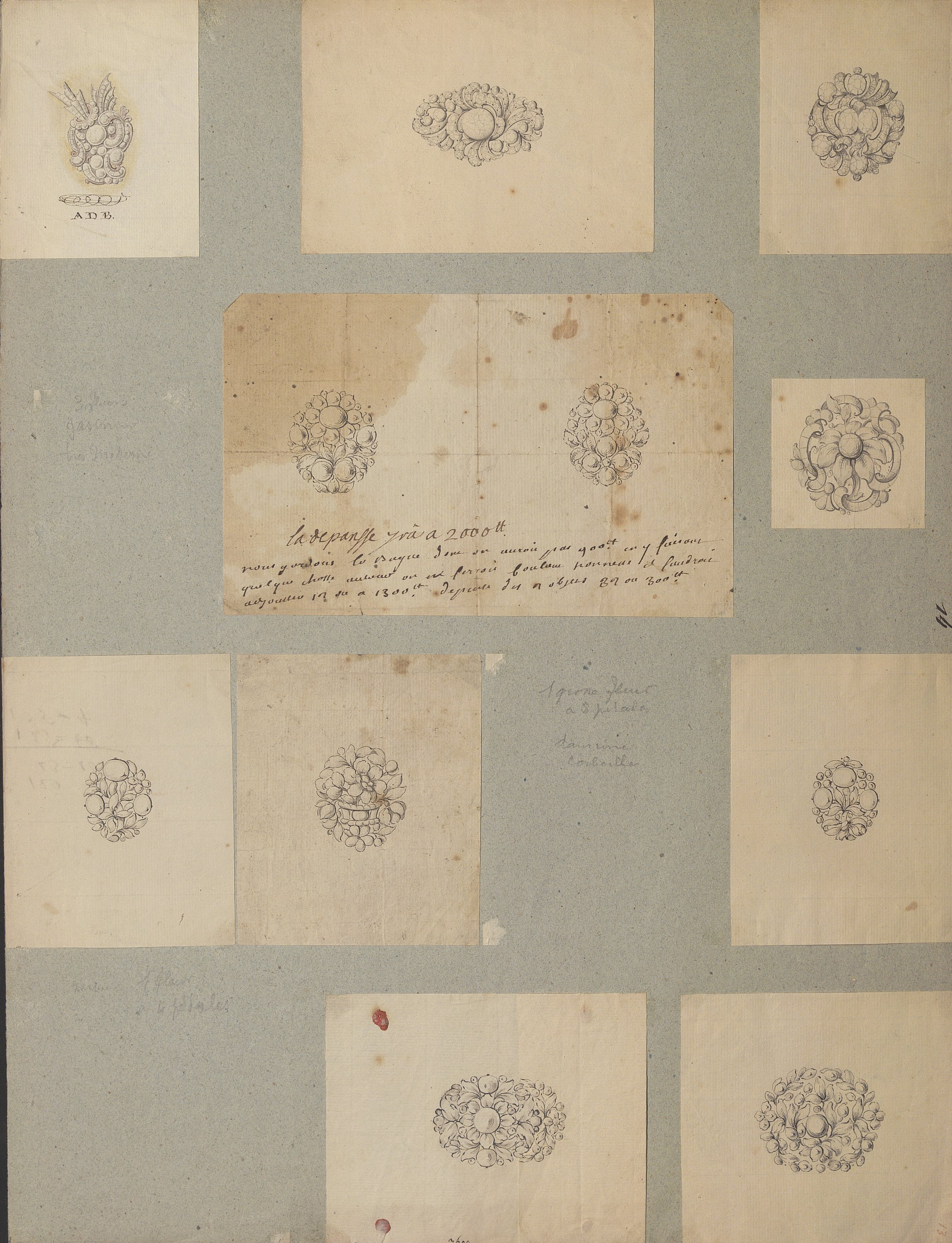 Les dessins les plus anciens, datant des années 1780-1790, représentent des bijoux, parures et ferrets de haute joaillerie pavés de pierres précieuses dans le goût néoclassique: devants de corsage, nœuds en broche, broches de boutonnière et de corsage, châtelaines, pampilles, etc.