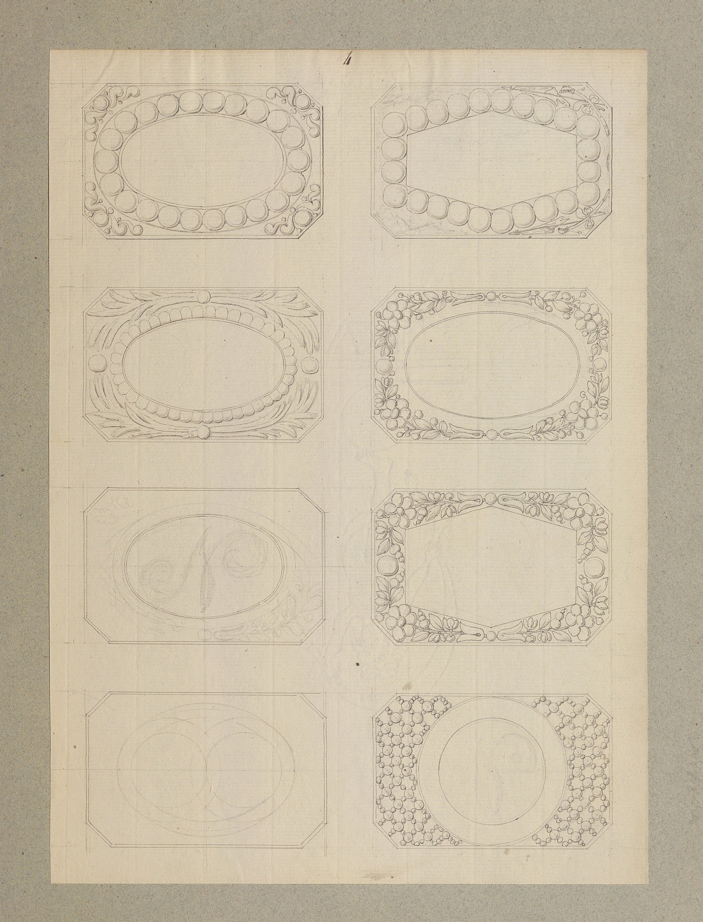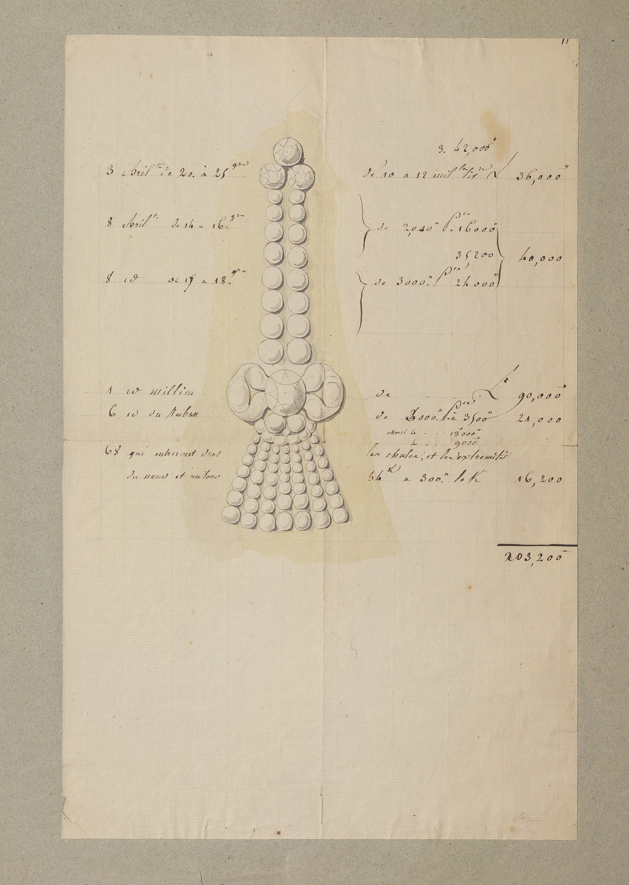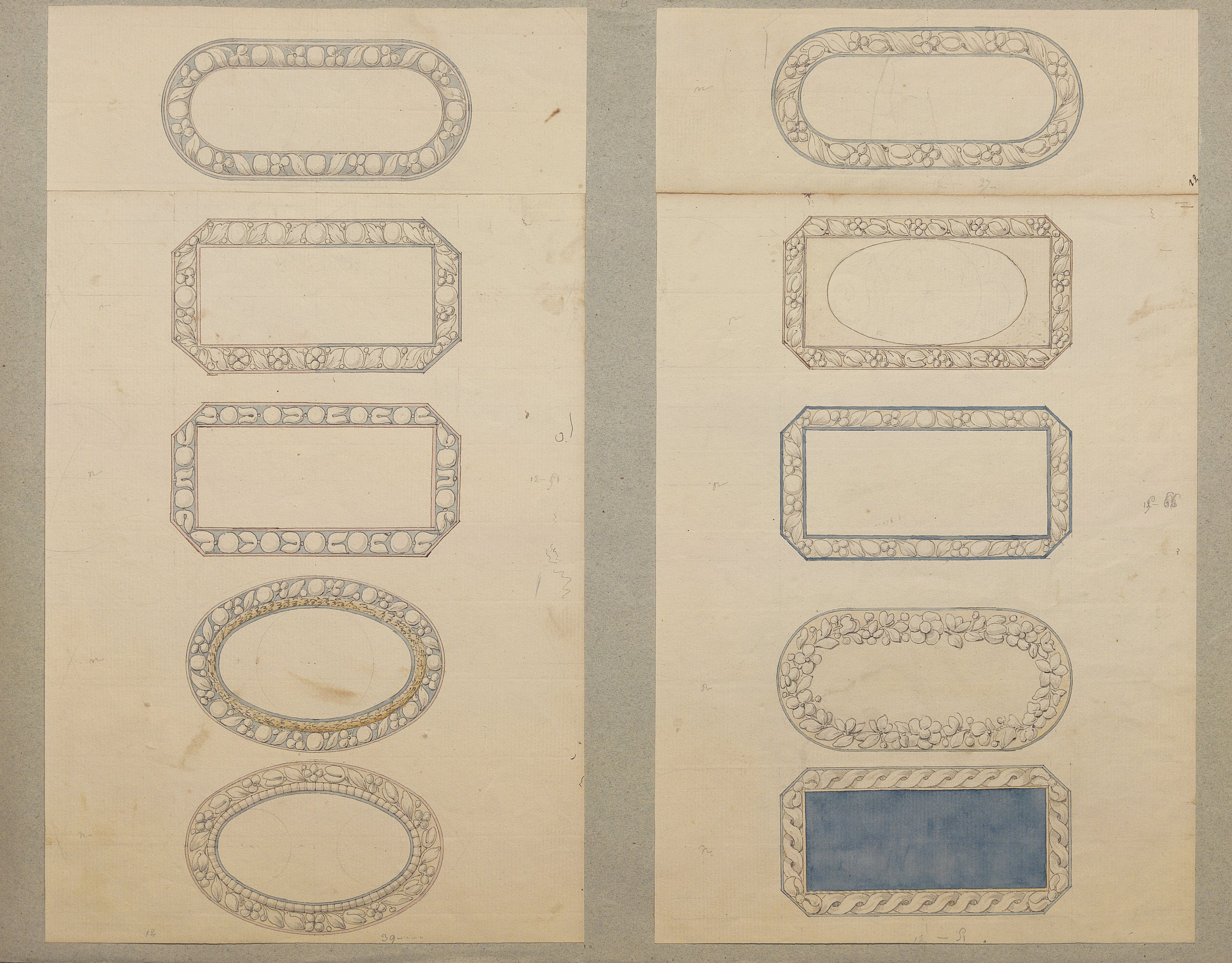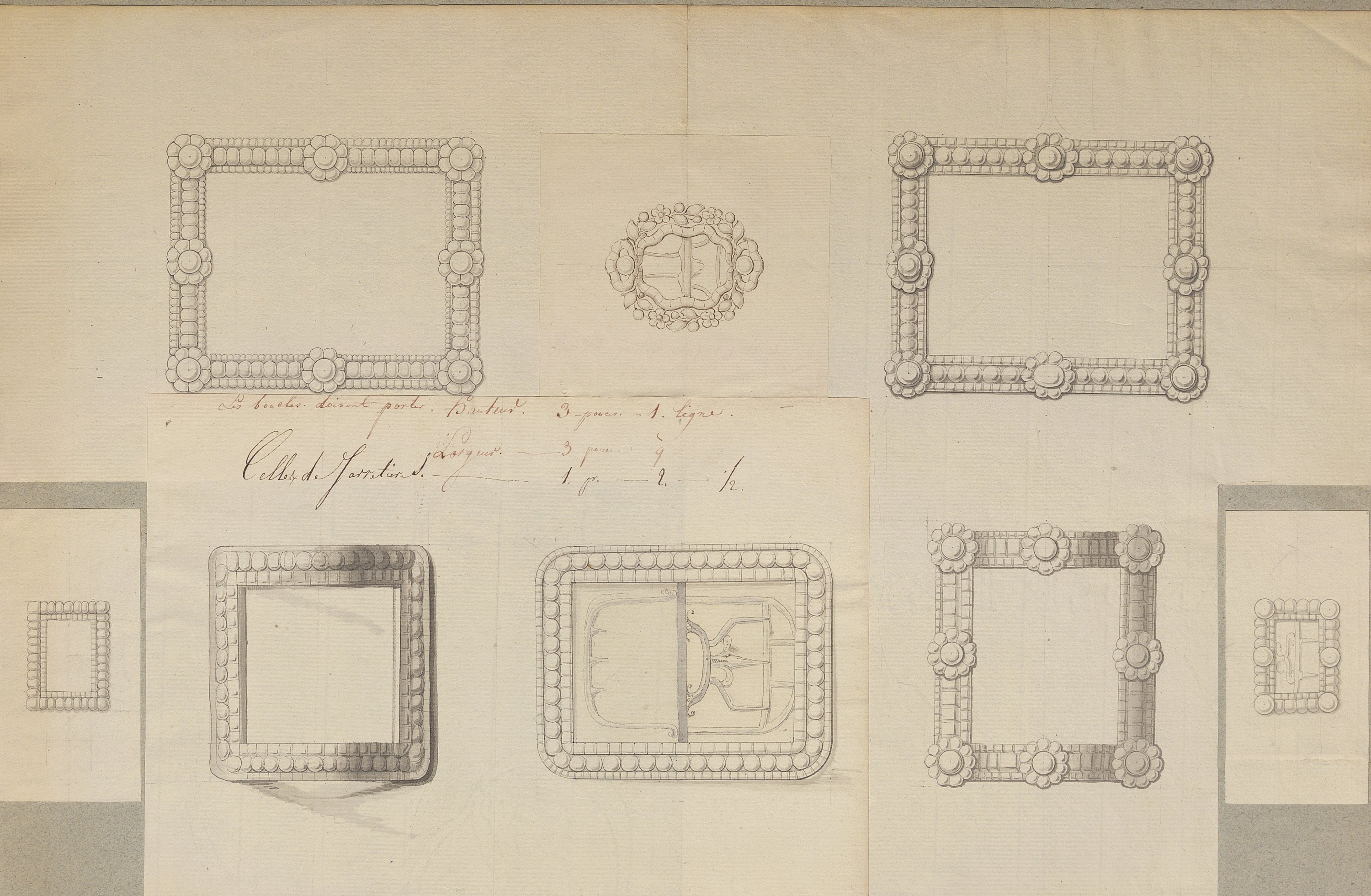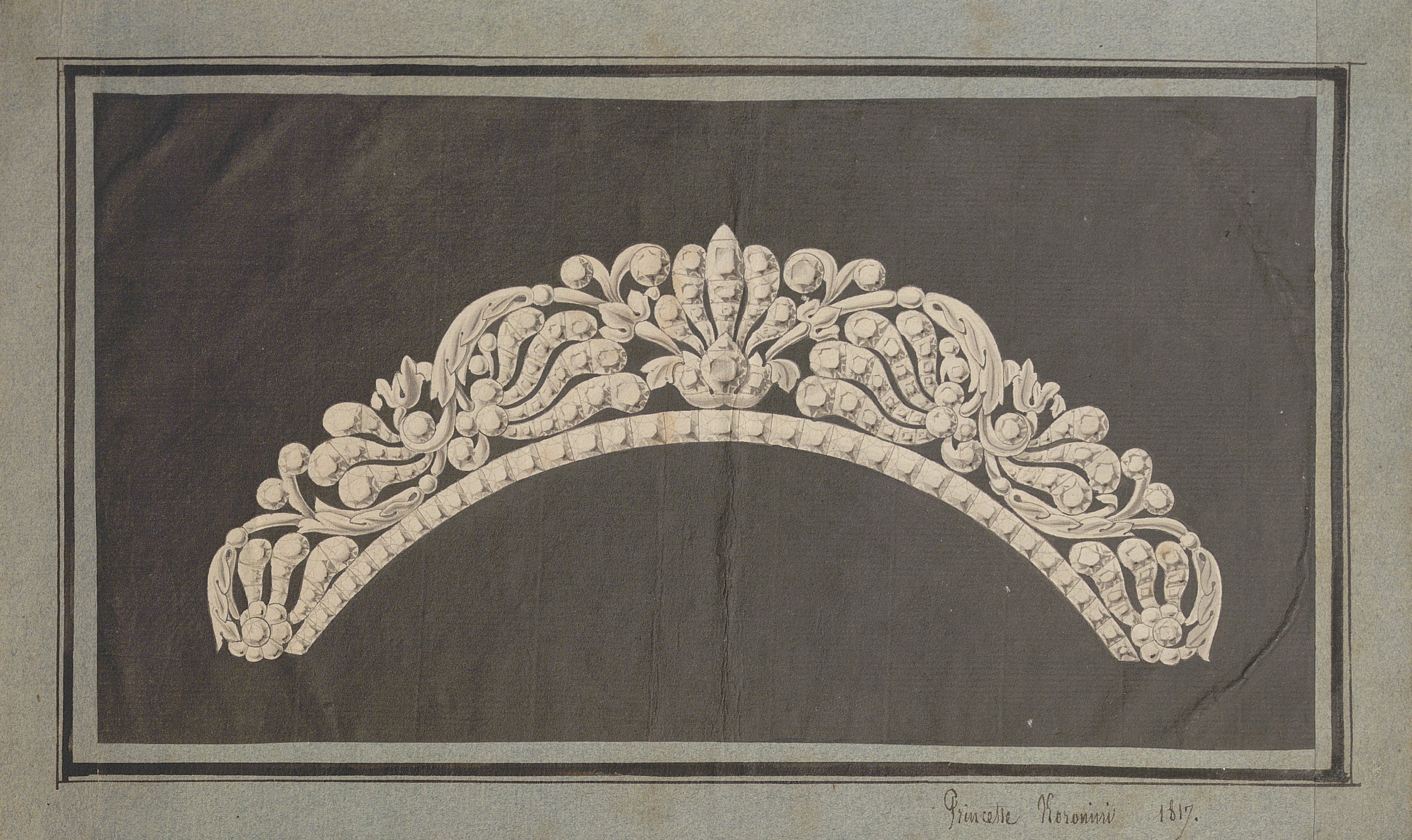 Les dessins les plus anciens, datant des années 1780-1790, représentent des bijoux, parures et ferrets de haute joaillerie pavés de pierres précieuses dans le goût néoclassique: devants de corsage, nœuds en broche, broches de boutonnière et de corsage, châtelaines, pampilles, etc.