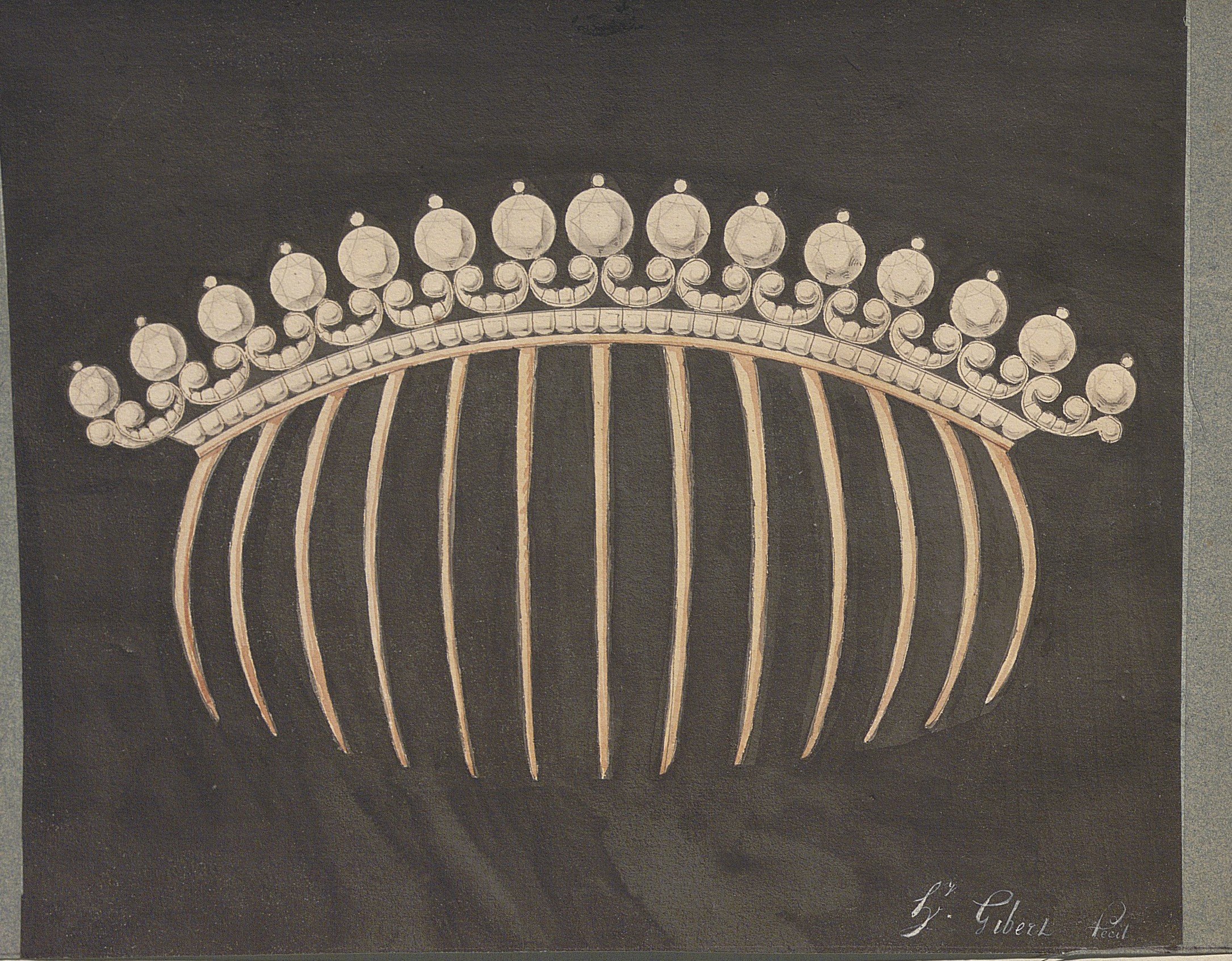 Les modèles du Consulat et de l’Empire sont abondamment représentés, Gibert père et fils étant fournisseurs de la cour impériale: parure à l’égyptienne (collier, boucles d'oreilles et bracelet) ; peignes ; diadèmes ; boucles de jarretière et de ceinture ; coques de montres, dont un modèle ayant pour légende à l’encre rouge « Hilaire Bassereau [horloger parisien, 1773-1806] veut pour la mécanique 25 louis, 2 mois et 2 lignes de hauteur, pour les ressorts 2 lignes, pour le tableau et la calotte d’or 1 ligne, pour le portrait 1 ligne » ; tabatières, dont de nombreux modèles au chiffre « N » ou « N.B. » [Napoléon Bonaparte] et un modèle au portrait choisi par Jean Dupont (1737-1819), maire d’arrondissement de Paris et comte de l’Empire ; broches ; « Peigne en brillant exécuté pour le mariage de S.M. Marie Louise, impératrice chez M. Guinegagne [metteur en œuvre] », etc. Le fonds comprend également le modèle du diadème commandé en 1817 pour Sophie de Fagan, princesse Coronini Cromberg (1792-1857).
