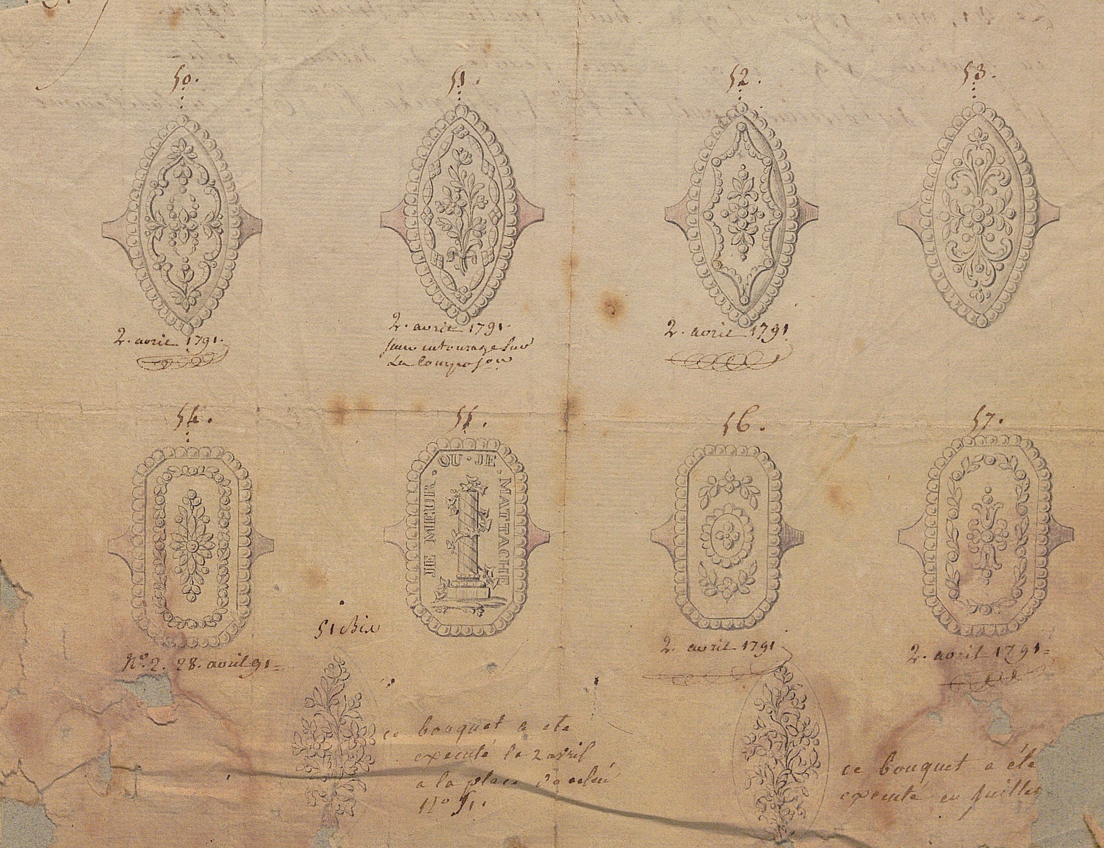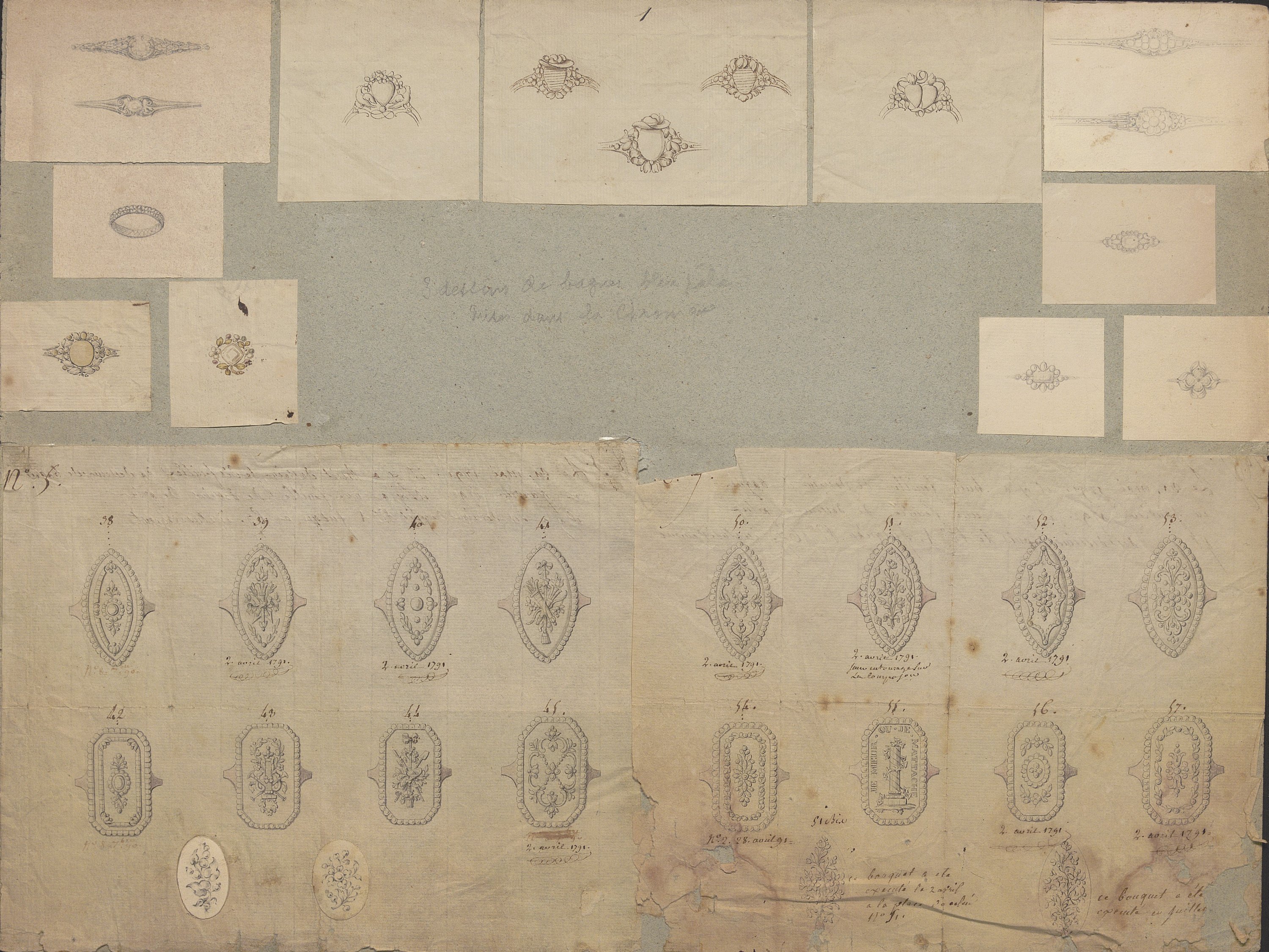 S’ensuivent des modèles de bagues et de broches révolutionnaires, dessinés vers 1791-1792.