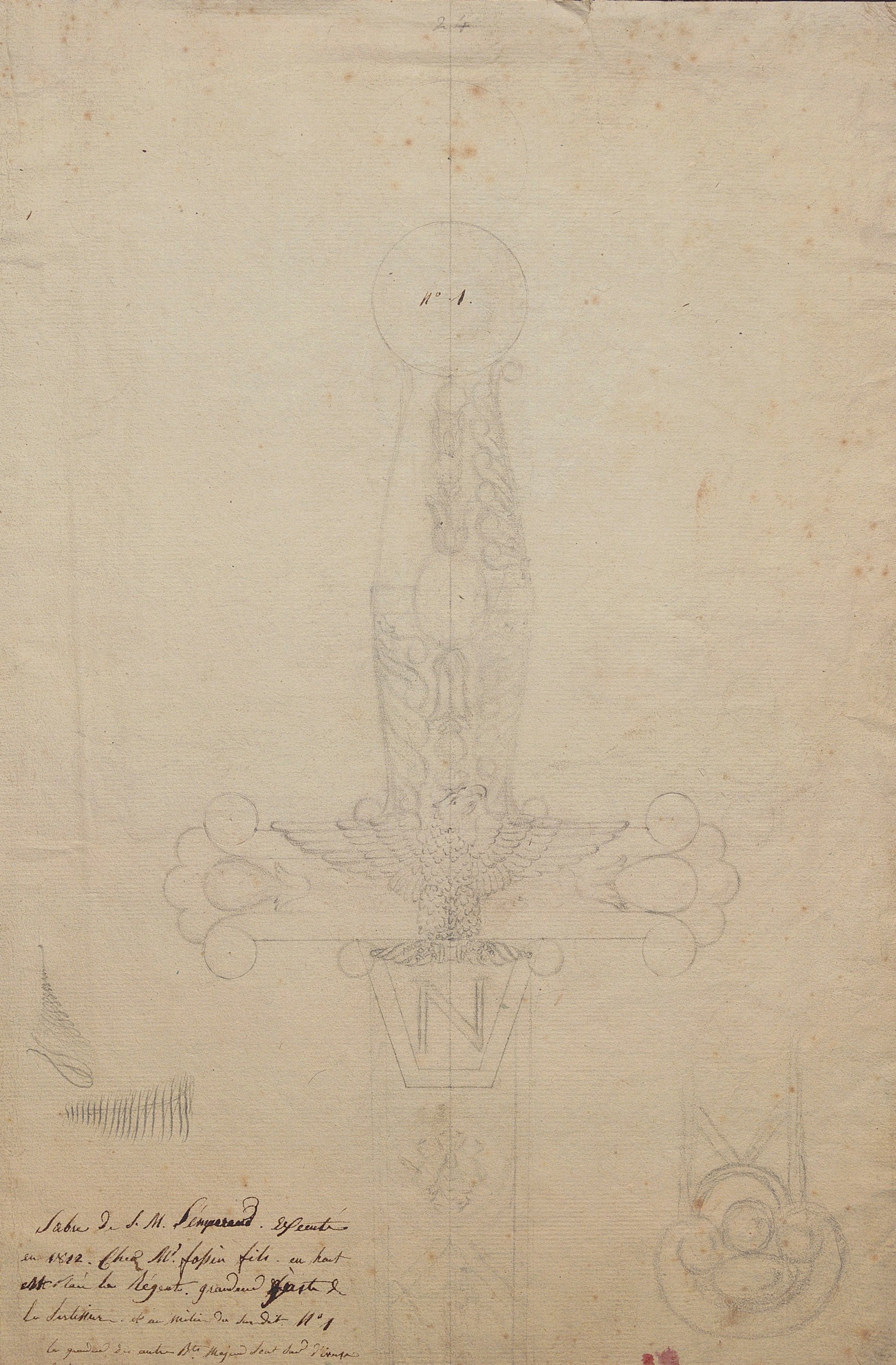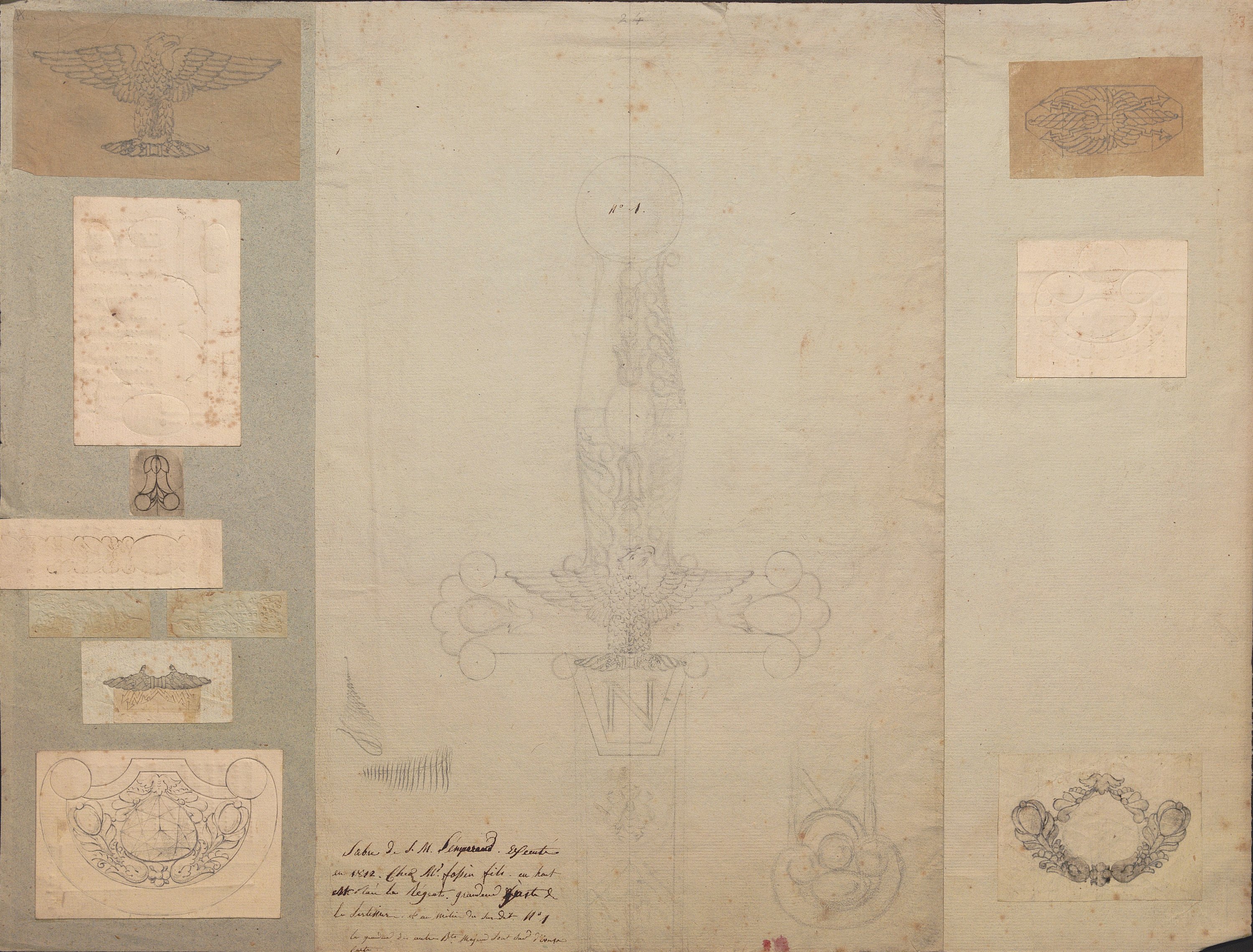 Sur la 1ère planche: au centre un dessin au crayon, 33,5 x 22 cm, représentant la poignée, le pommeau et la garde du glaive impérial commandé en 1811 par l’Empereur Napoléon Ier à François-Regnault Nitot, ainsi que l’un des décors d’enroulements situé au bout du fourreau (revers), avec mention manuscrite à la plume « Sabre de S.M. l’empereur exécuté en 1812 chez M. Fossin fils. Au haut est placé le Régent, grandeur juste de la sertissure et au milieu du susdit n°1. La grandeur des autres brillants sont sur diverses cartes ».