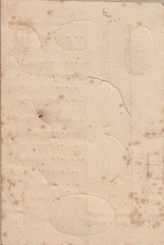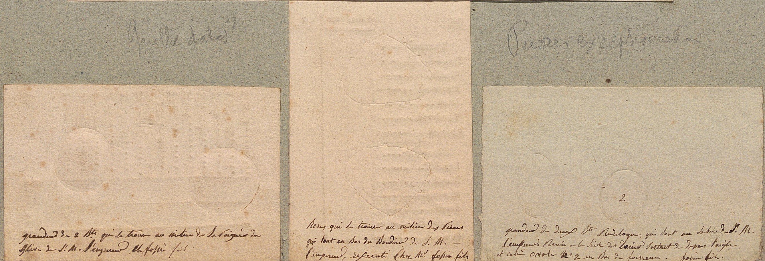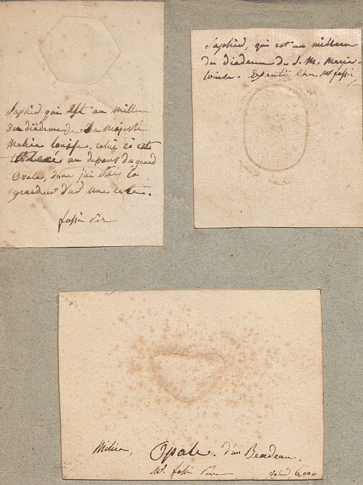 A gauche: trois petits cartons avec empreintes des tailles des diamants, avec sur chacune mentions manuscrites à l’encre brune: « Saphir qui est au milieu du diadème de Sa Majesté Marie Louise. Celui-ci est placé au-dessous du grand ovale dont j’ai pris la grandeur sur une carte. Fossin père » « Saphir qui est au milieu du diadème de S.M. Marie Louise exécuté chez Fossin père » « Milieu d’un bandeau, opale. M. Fossin père. Valeur 6000 » ; annonce de vente de deux diamants chez Me Colin notaire à Paris, place Baudoyer [de 1789 à l’an IV], estampe à taille-douce. L’un des cartons servant de support, porte au recto, la carte de visite de « Fossin père et fils – Joailliers – rue de Richelieu, n°10 – A Paris »