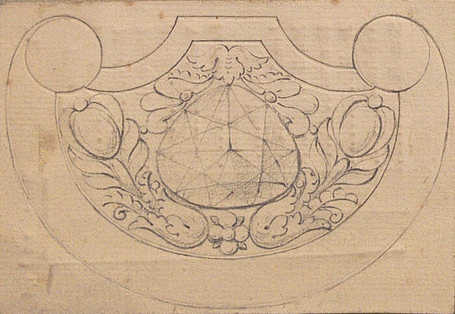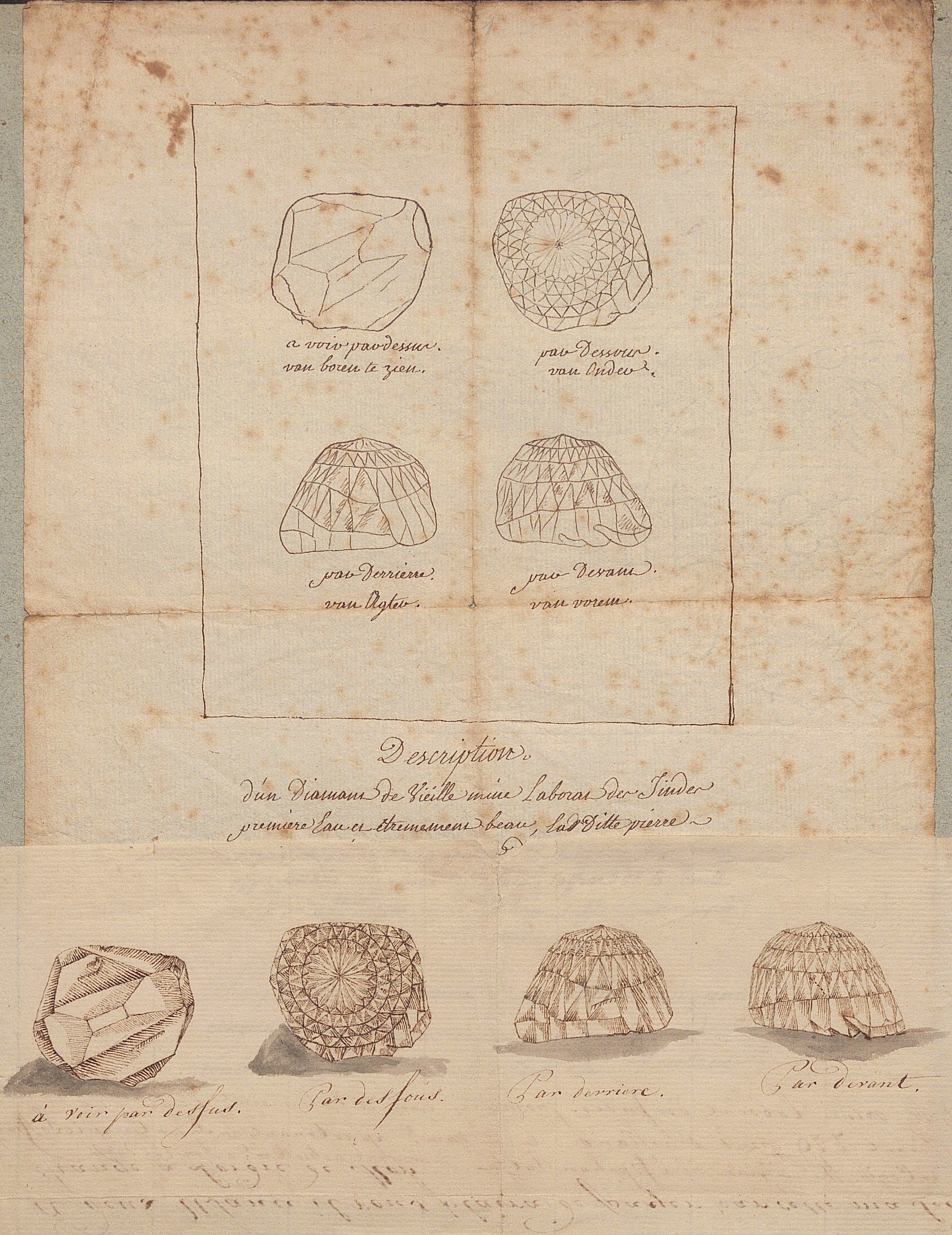Sur la 2e planche figure: au centre deux dessins à la plume, vue toutes faces du diamant dit Orlov [vendu aux enchères à Amsterdam en 1767] ayant pour légende à l’encre brune: « Description d’un diamant de vieille mine Laborat des Indes, première eau et extrêmement beau, ladite pierre pesant à présent (…) Hollande, ce diamant appartenant au sieur Grégorio Saffraz de la famille de Gogio Minazian, né à Ispahan Juffa, demeurant actuellement à Amsterdam. La pierre a été vendue deux millions cinq cent cinquante mille livres et 120 mille livres de rentes viagères sur la tête du vendeur » [diamant de 189 carats au comte Grigori Orlov (1734-1783), qui en fit don à sa maîtresse, l'impératrice Catherine II de Russie (1729-1796), aujourd’hui conservé au Kremlin].