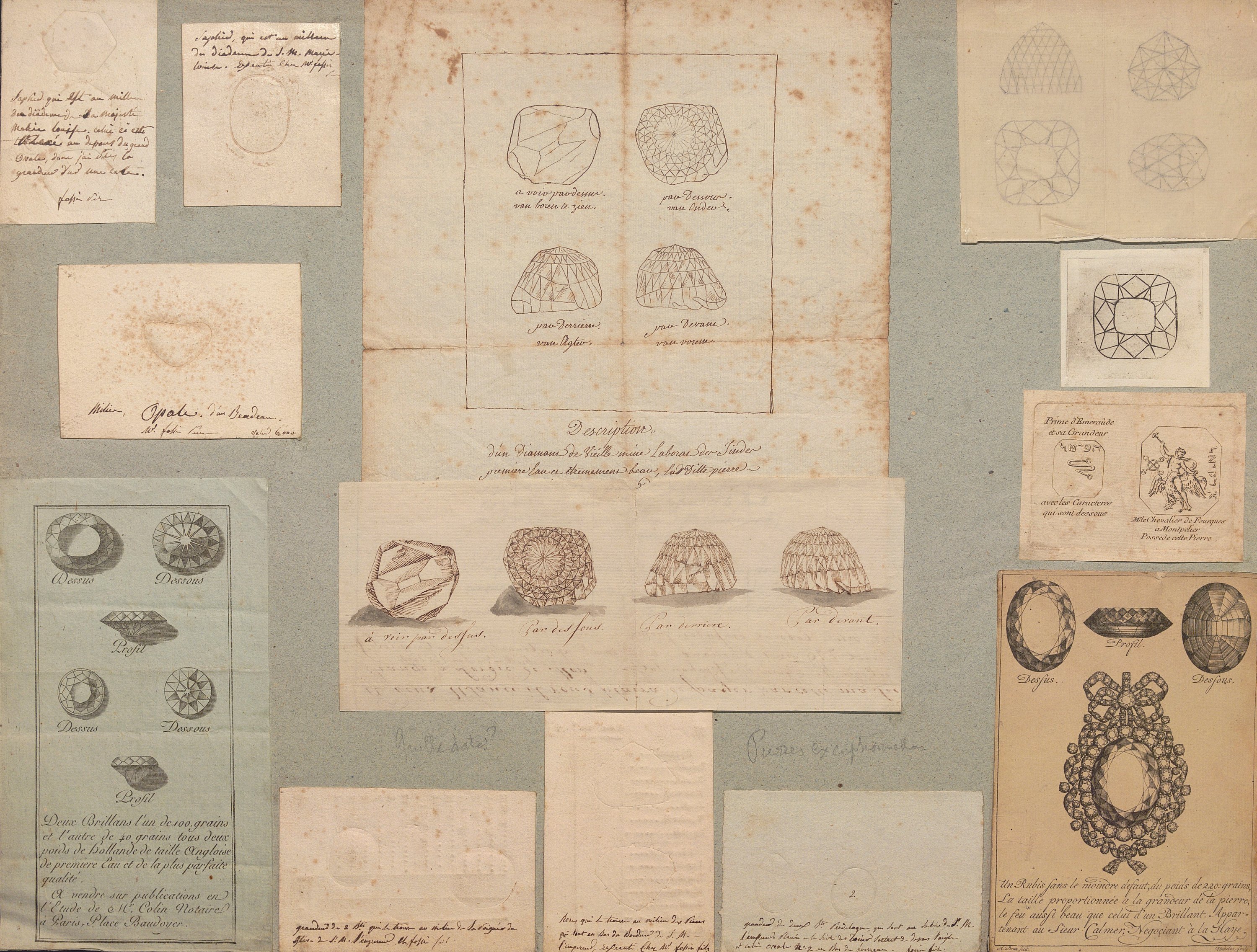 A droite: vues dessinées et imprimée de différentes façons de taille de diamants ; rare petite estampe en taille douce dessinée et gravée par Cochin fils en 1740 « Prime d’émeraude et sa grandeur avec les caractères qui sont dessus – M. le Chevalier de Fourques à Montpelier possède cette pierre » ; rare annonce de vente d’un rubis appartenant au sieur Calmer négociant à la Haye, estampe en taille-douce, fin du 18e siècle.